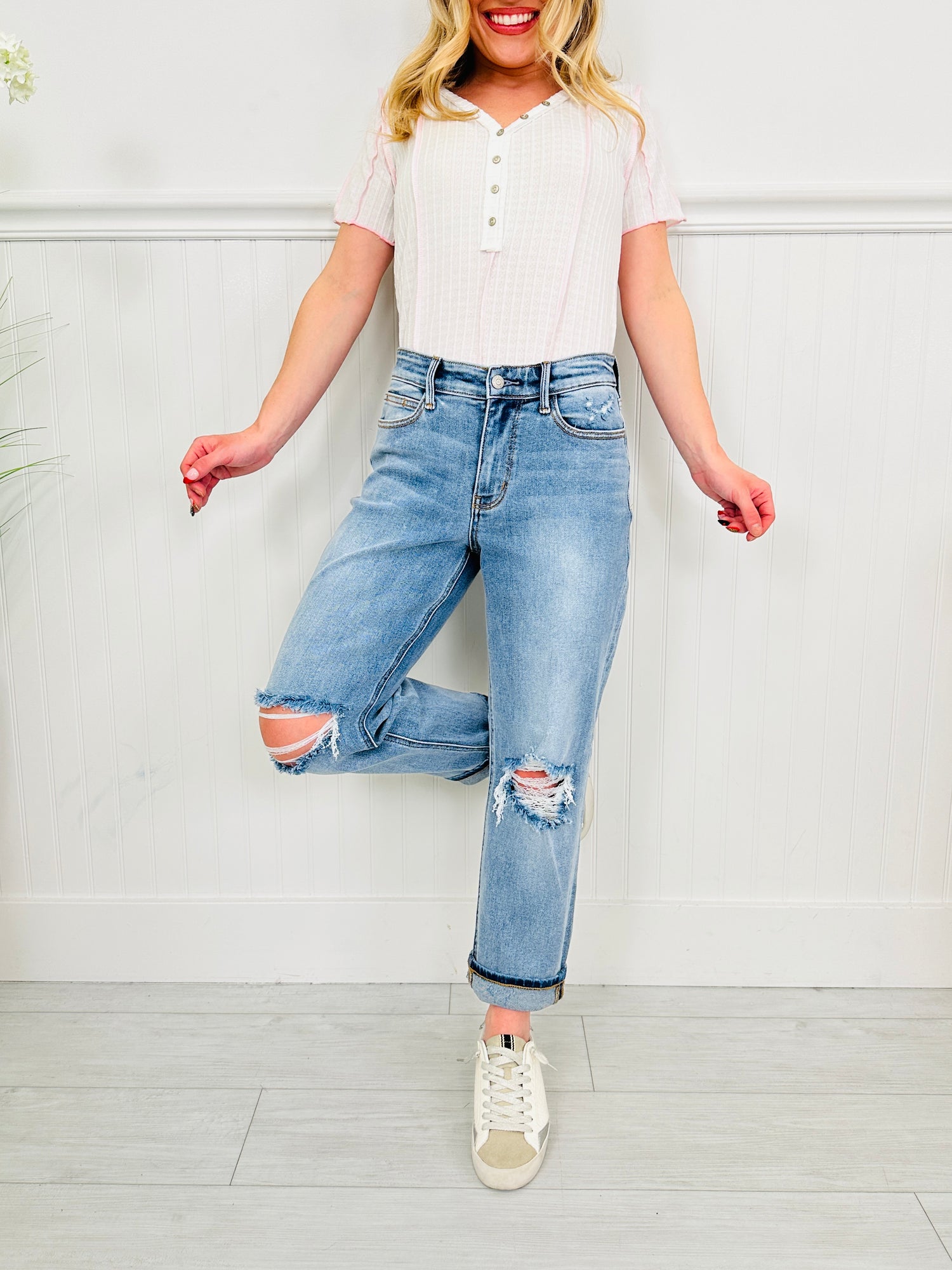 These new Judy Blue boyfriend jeans are the laid-back denim your pre-spring wardrobe has been waiting for. These jeans have a classic boyfriend silhouette with a relaxed, easygoing fit that is both flattering and effortless. The soft and stretchy fabrication makes these an all-day favorite, while the trendy distressing adds just the right amount of edge for the spring season.