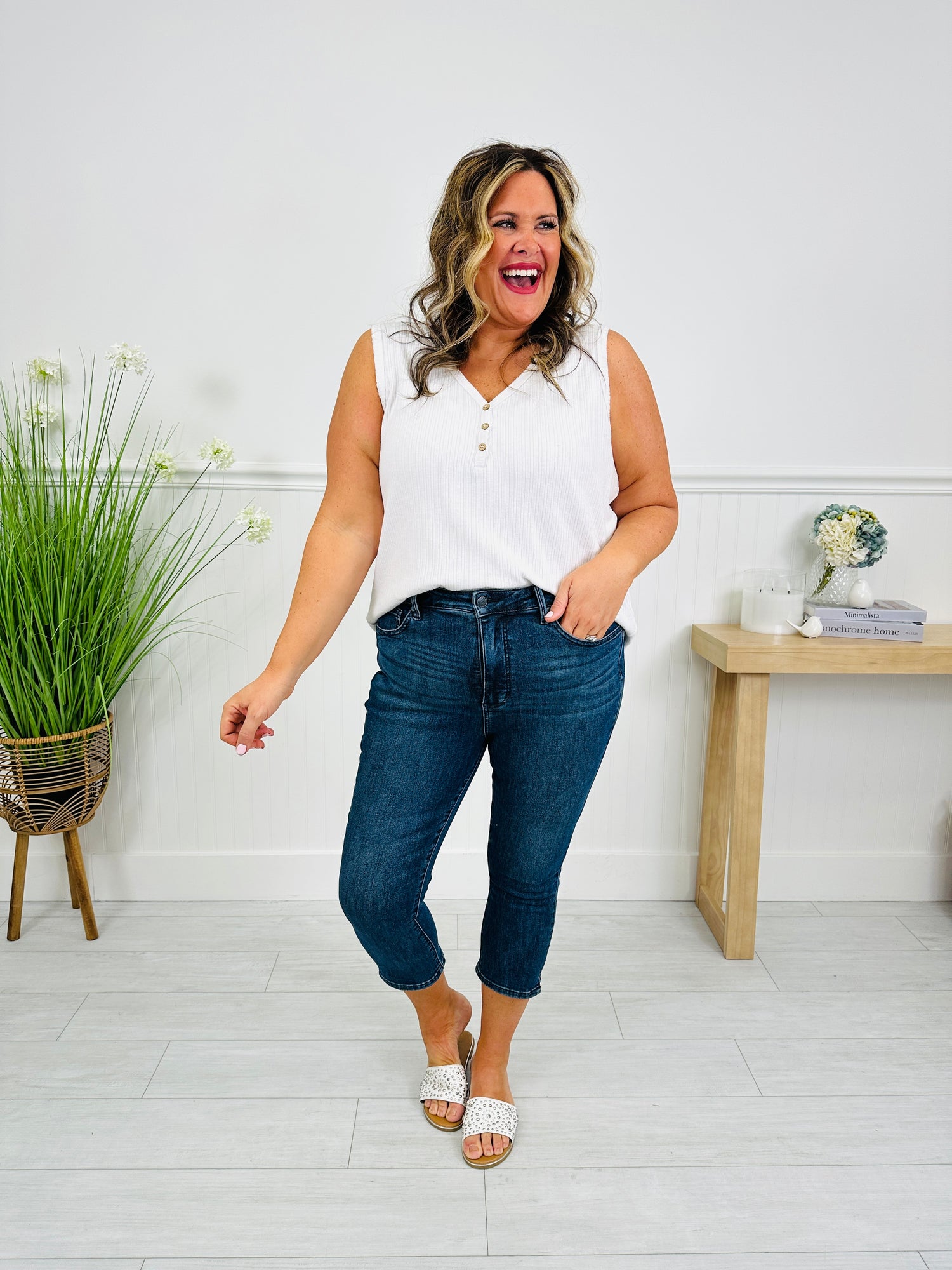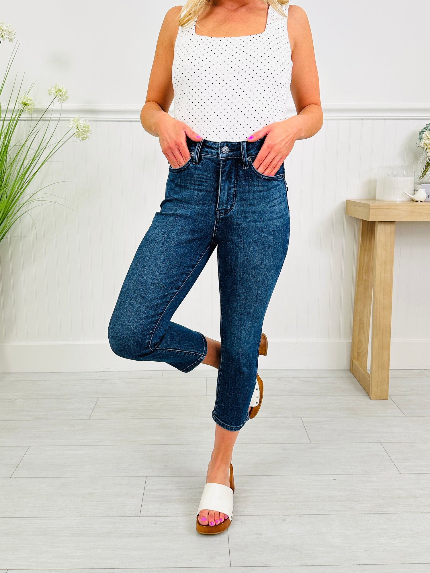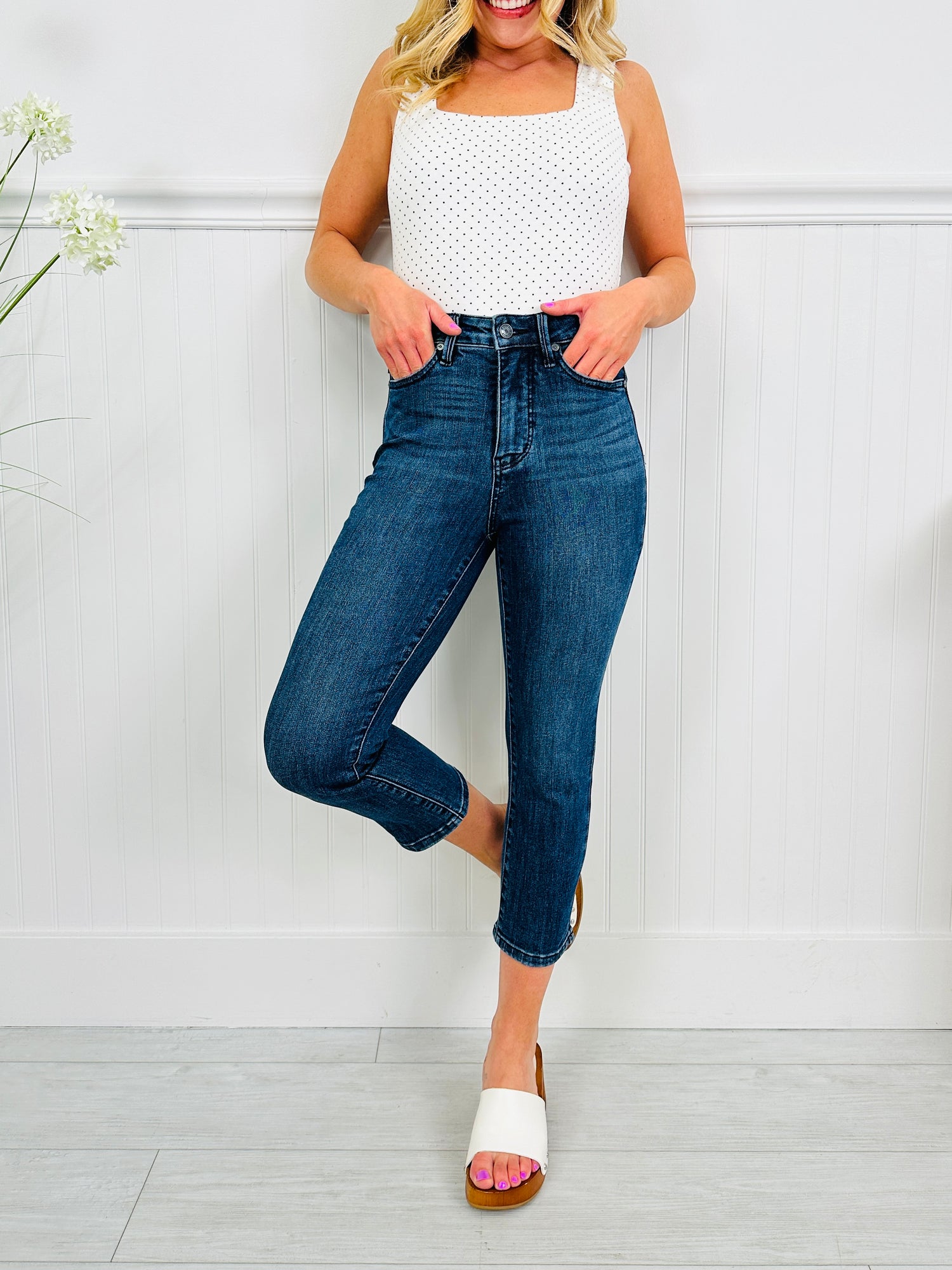 Capri style jeans are our best selling spring style and these soft and stretchy jeans are so comfortable that you will reach for them on repeat this season. These non distressed jeans can be dressed up with wedges and a blouse or down with a tank and flip flops for multiple, versatile looks.