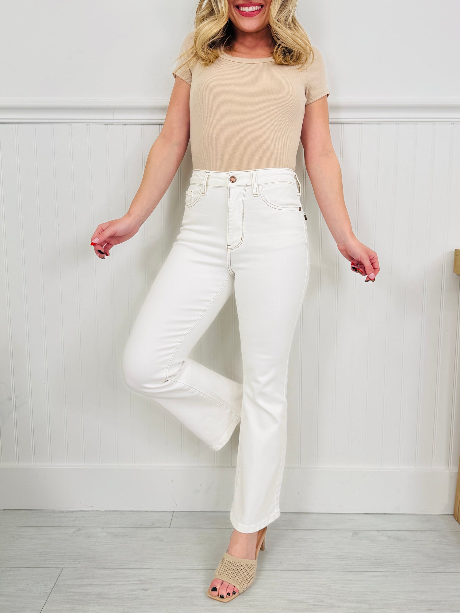 These new Judy Blue white kick flare jeans are the kind of denim you’ll reach for when you want a fresh look without overthinking it. These Judy Blue jeans are designed with a flattering high rise and a soft, stretchy feel that makes them comfortable enough for all-day wear.