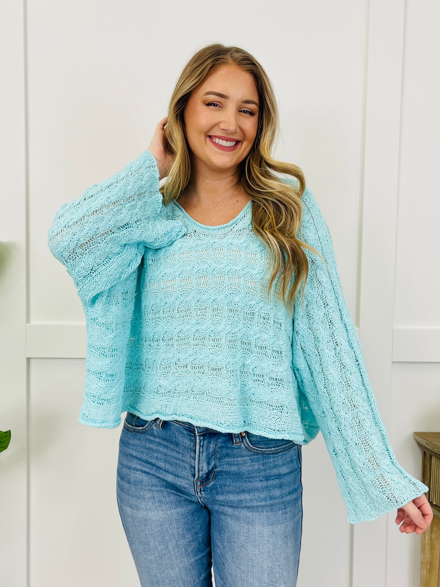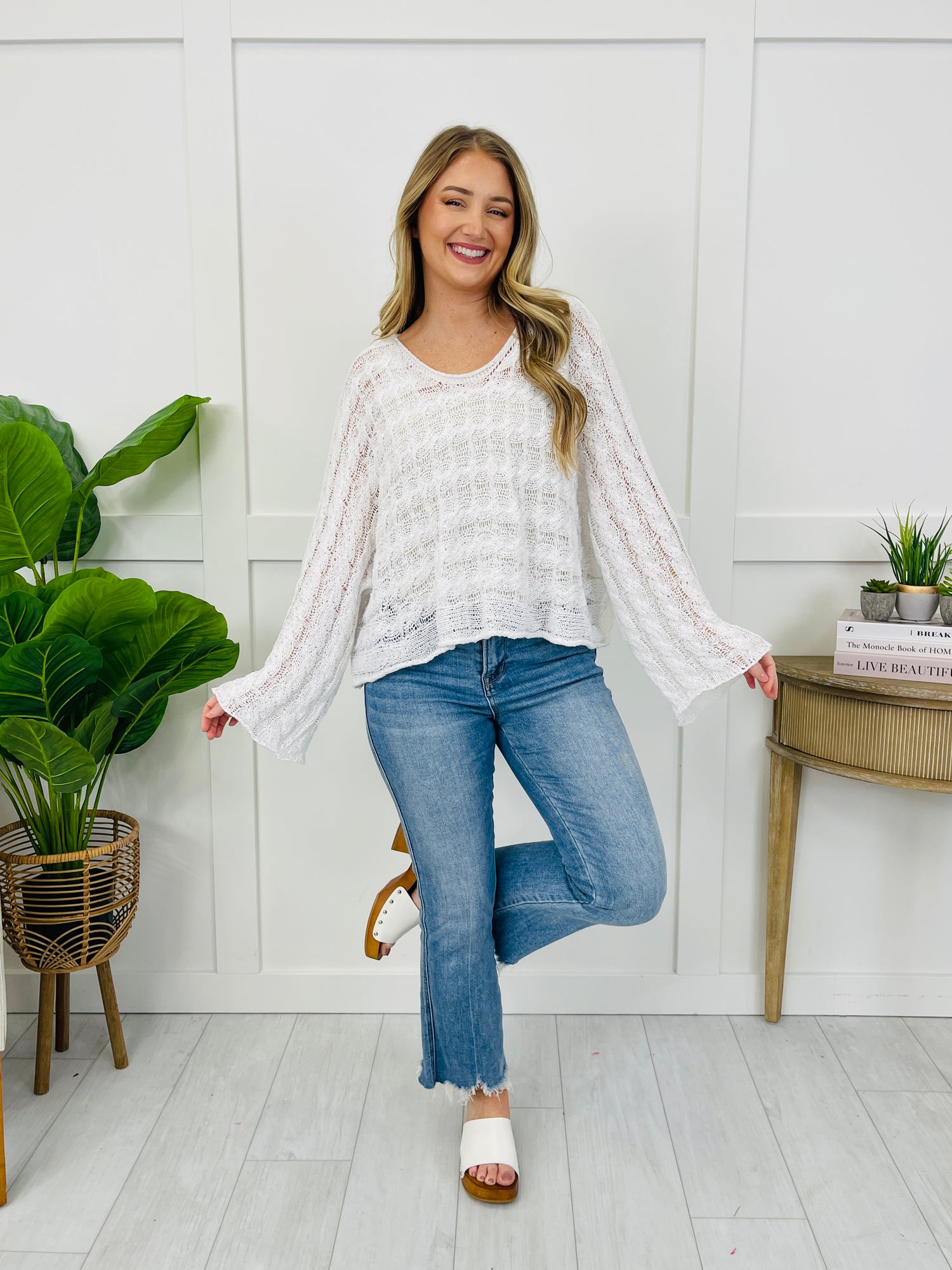 This top is a perfect combination of comfort and style with its lightweight, open knit design and relaxed fit. The flowy bell sleeves add a touch of elegance, making it a versatile piece for both casual and dressier looks. Available in several color options, it pairs well with shorts and jeans, offering a chic look with everyday ease.