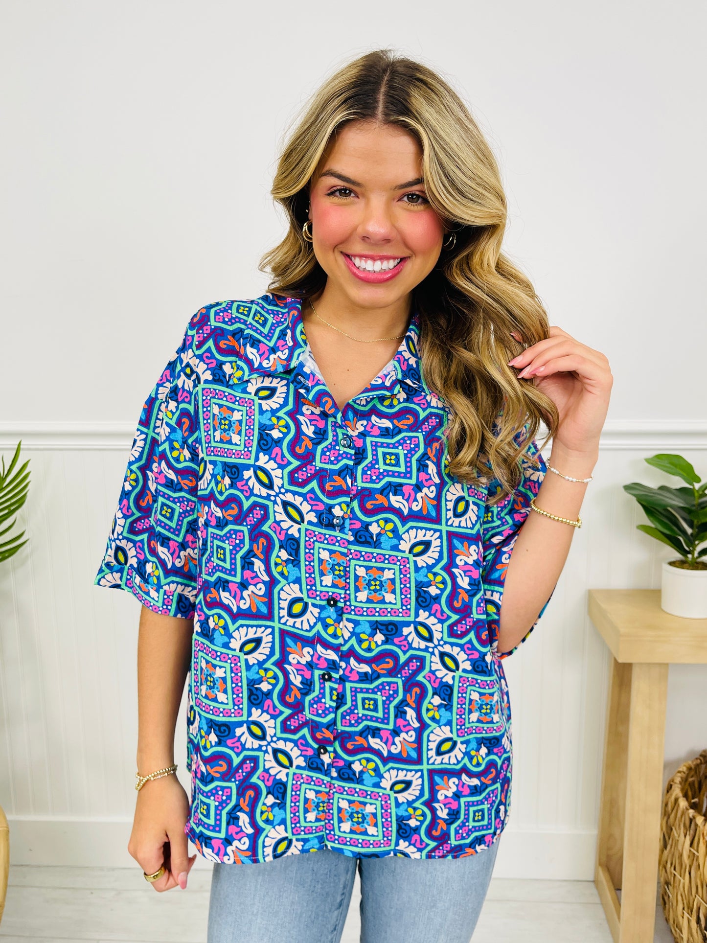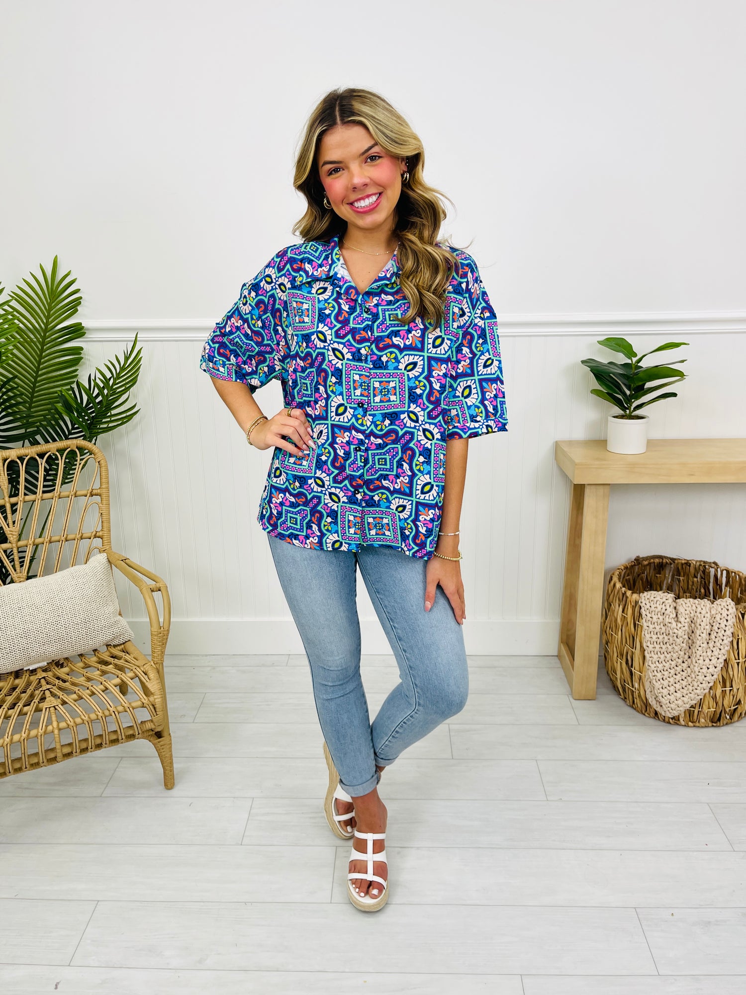 This vibrant button-down is made to stand out with its eye-catching pattern and easygoing silhouette. The relaxed fit makes it perfect for layering over a cami or wearing solo with your favorite denim. Whether you're heading to brunch, the boardwalk, or just out and about, this lightweight beauty brings the fun wherever you go!