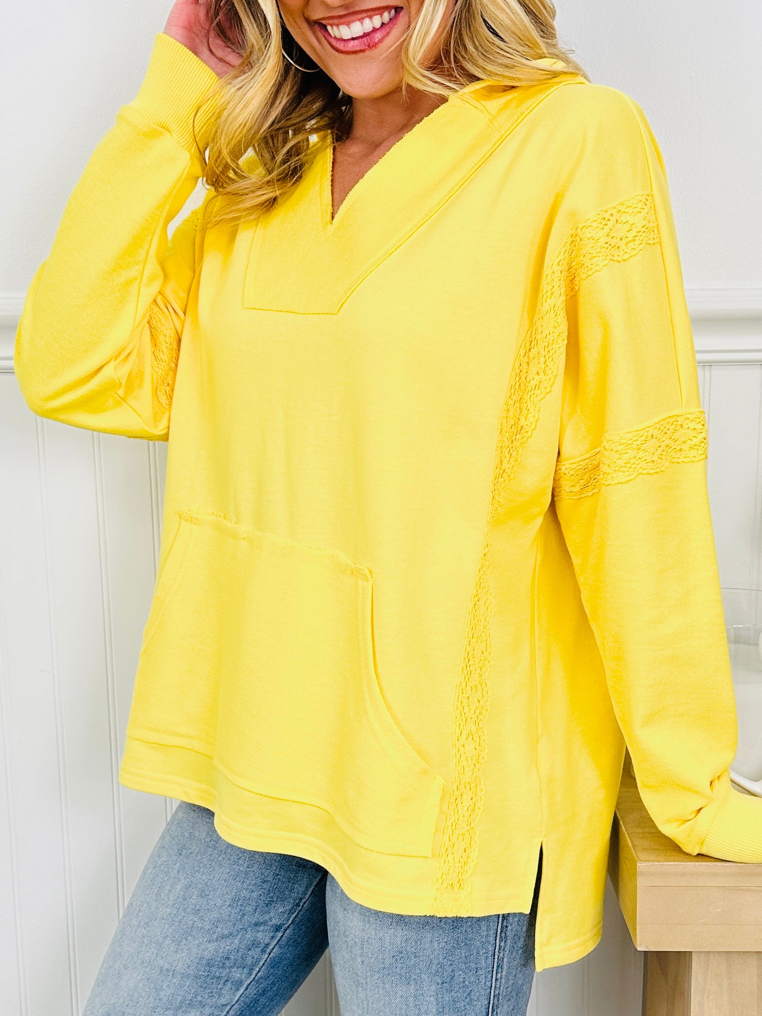 Designed with high end crochet trim detailing along the sleeves and side panels, it adds that elevated touch that sets it apart from your basic hoodie and gives you the ability to dress this pullover up or down. The high low hem and side slits create a flattering drape and easy movement, while the versatile hood gives it that effortless, throw-on-and-go vibe.