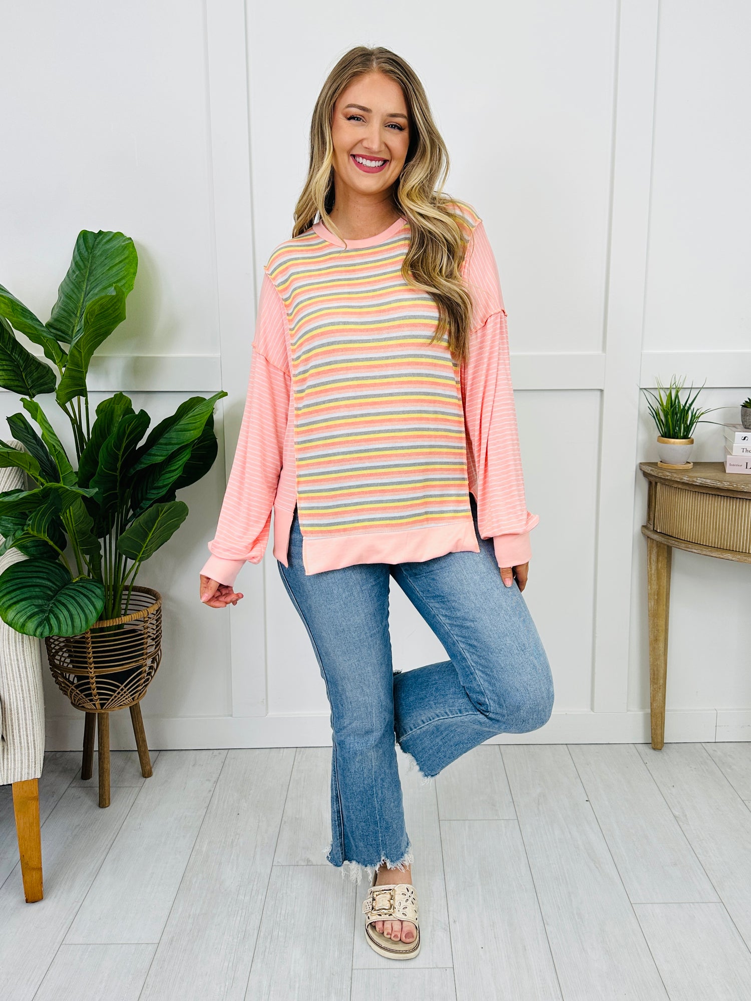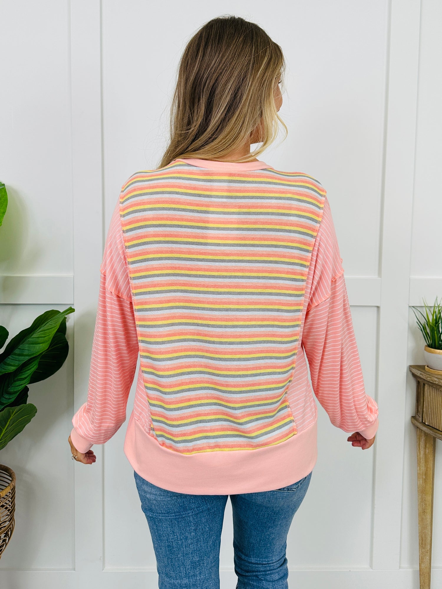 This soft and cozy top is the easiest way to add a little fun to your everyday looks, thanks to the mix-and-match stripe details throughout. The relaxed fit keeps it comfy and easy to wear, while the side slits give it a laid-back finish that looks cute tucked, untucked, or half-tucked.