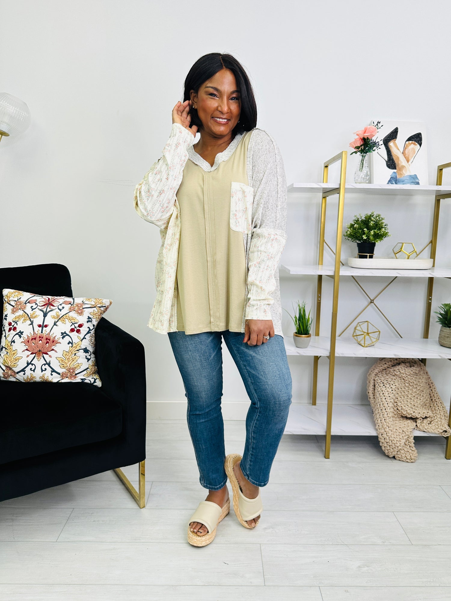 This top stands out with its mixed-media sleeve design, featuring floral print sections paired with sheer mesh-style panels for a uniquely layered look. The V-neckline detail and textured trim add a polished finish up top, while the floral pocket accent brings in an extra pop of pattern. A center front seam gives the front a clean, styled touch that makes this piece feel anything-but-basic.