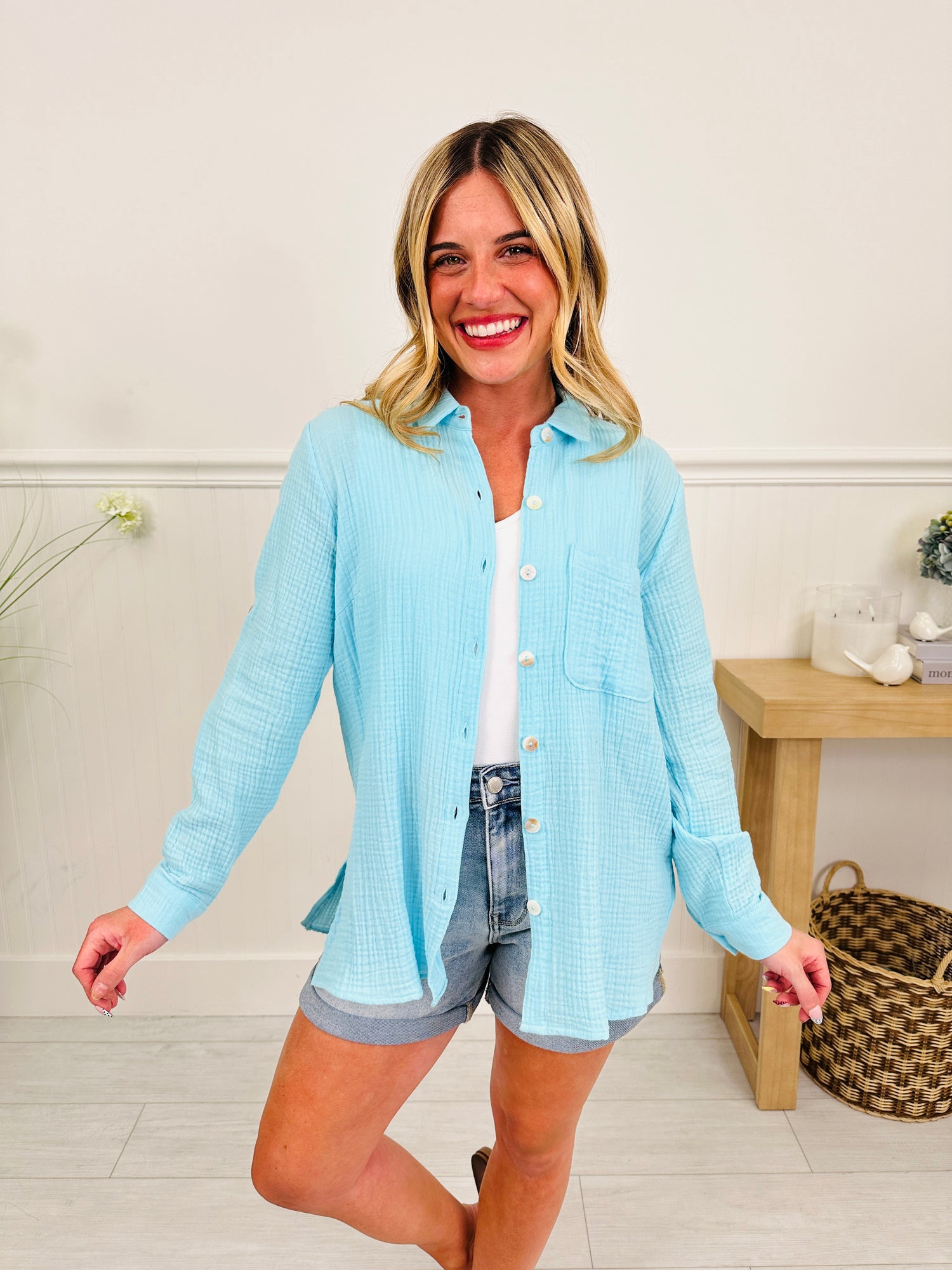 This new arrival is made from our best selling, buttery soft, gauze fabric that our customers rave about. It's designed to be the perfect layering staple with your favorite tank and denim shorts or jeans. It can also be worn as a bathing suit cover up during pool and beach days. Dress it up by buttoning it up and pairing it with jeans to wear from work to weekend to everywhere in between. The button tab sleeves add an easy, casual touch you’ll love for everyday wear.