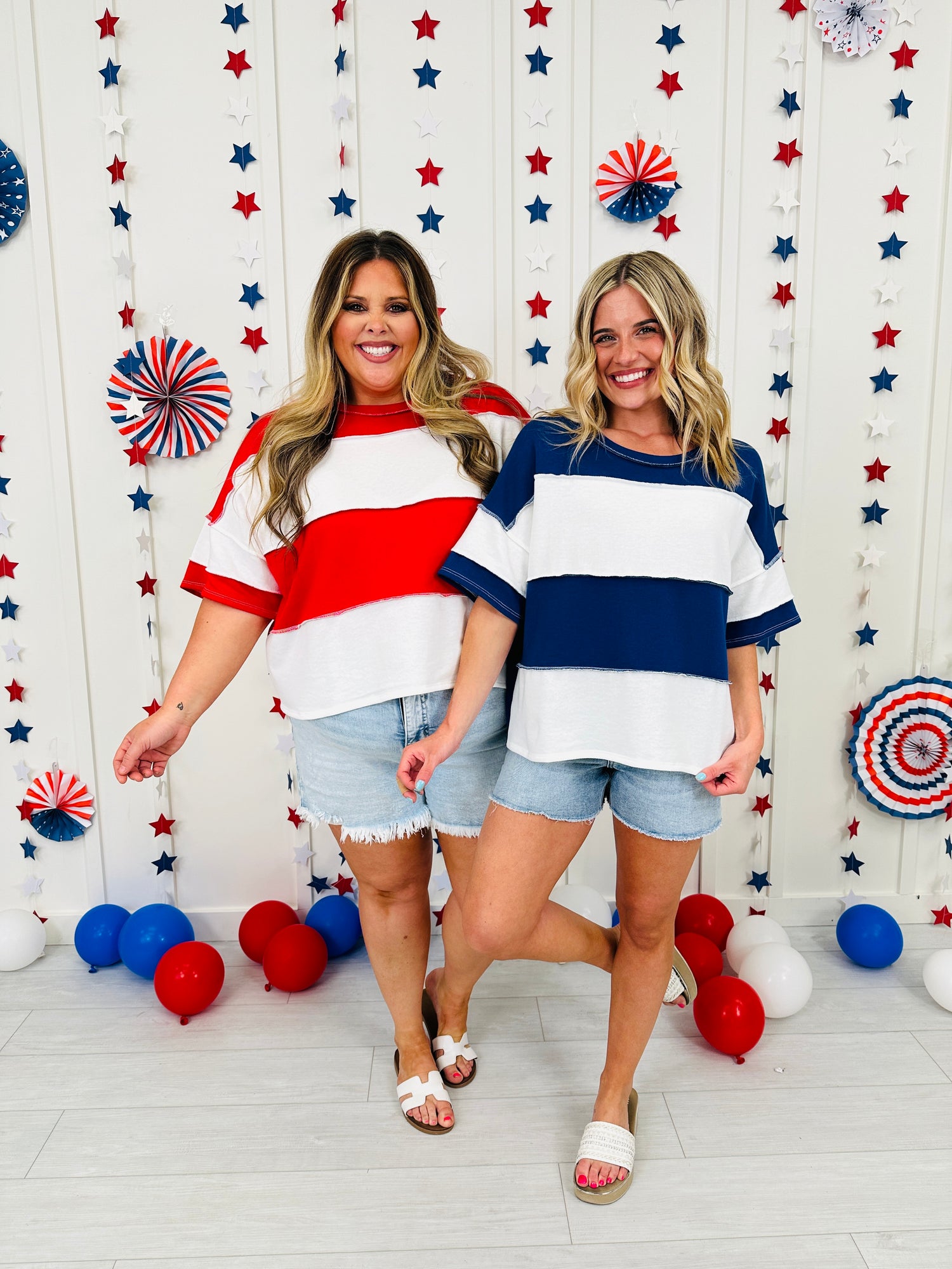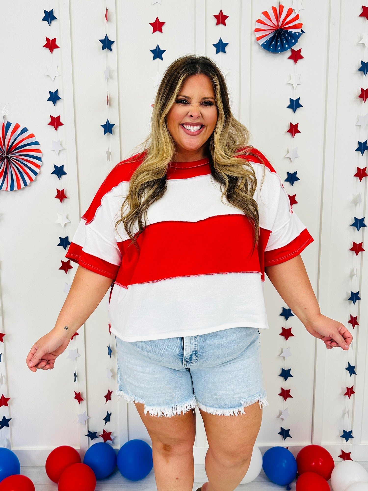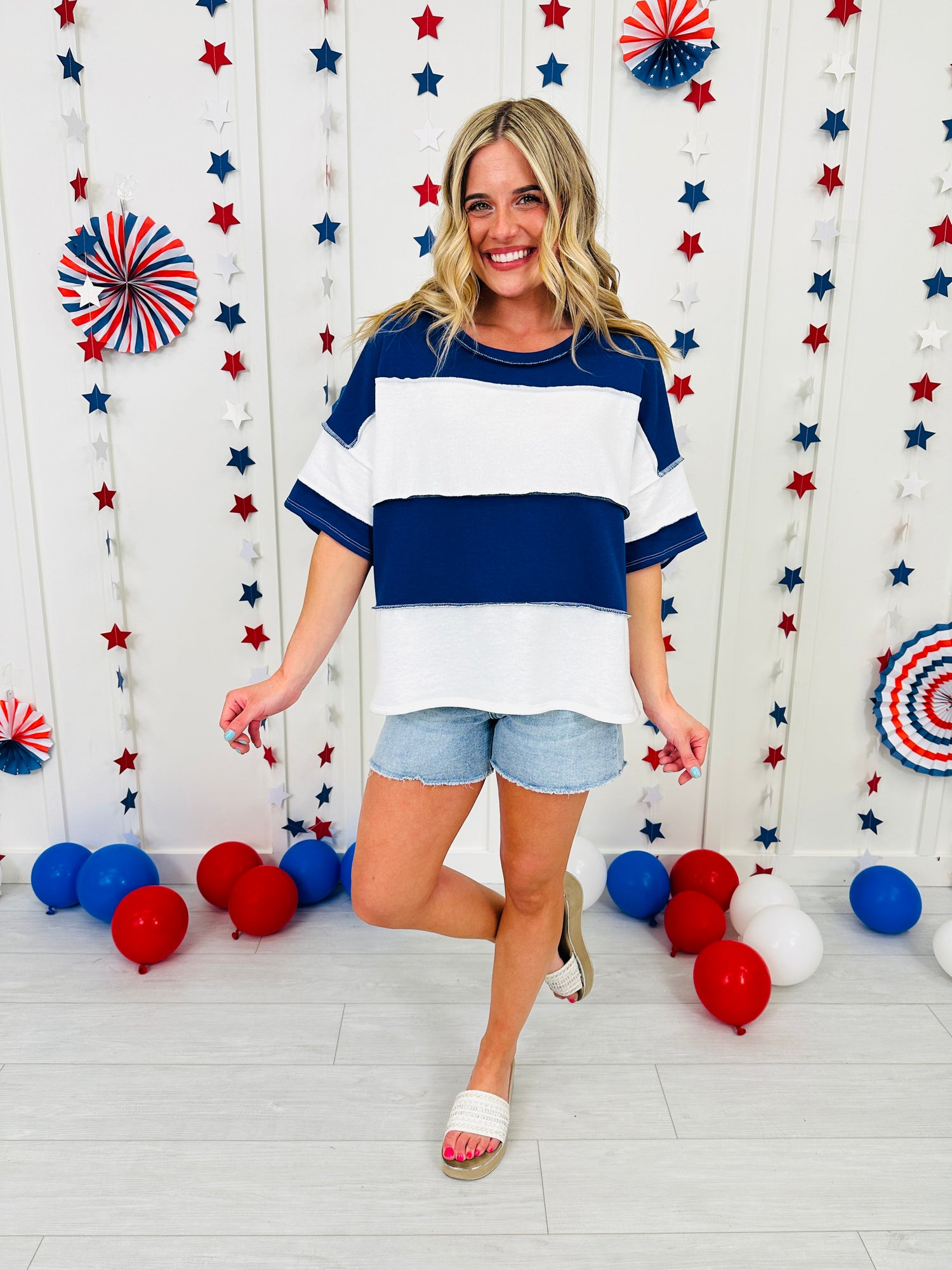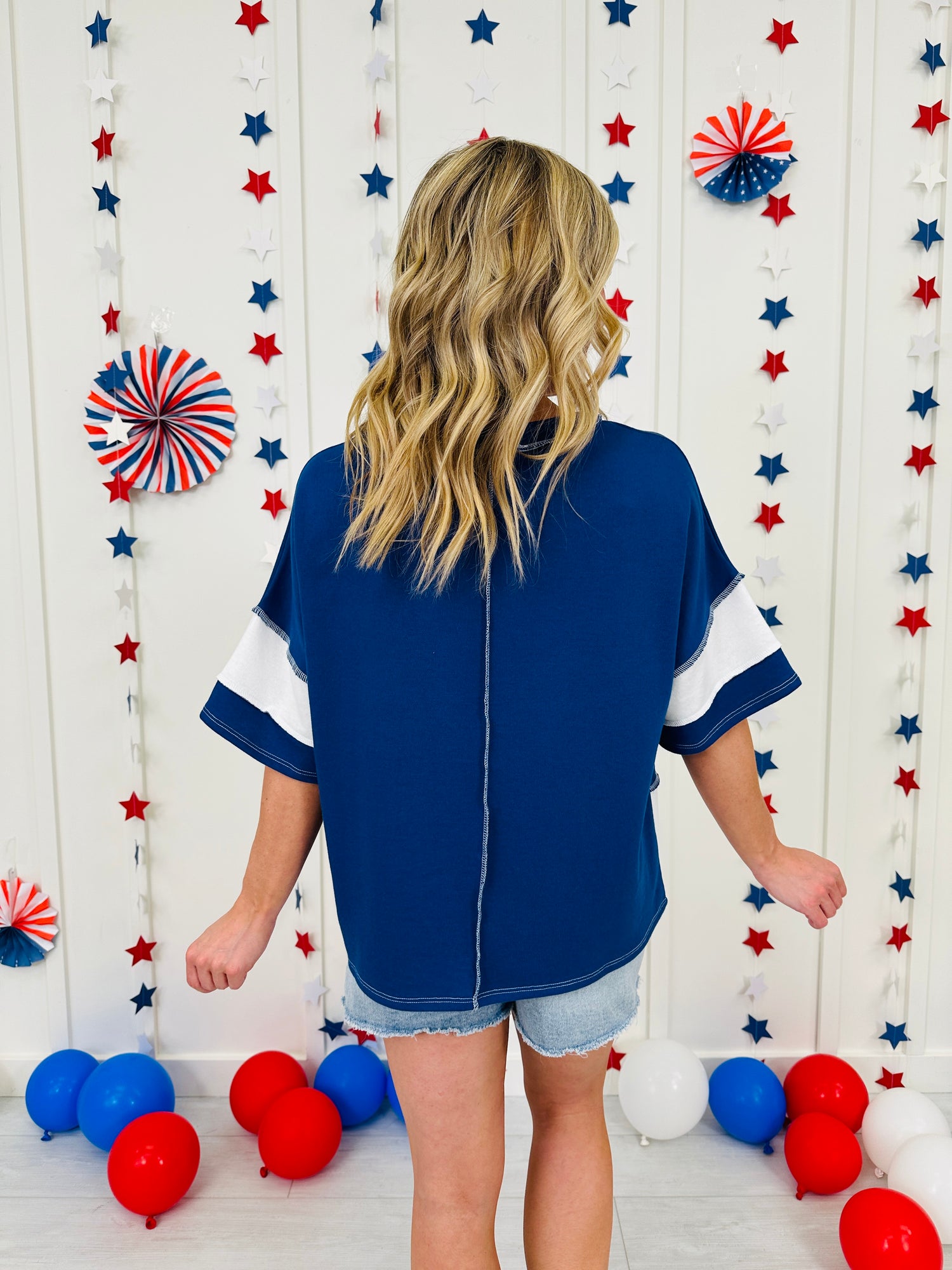 Let freedom ring in this new Americana Arrival. This effortlessly cute, oversized tee brings all the patriotic vibes with its bold red, white, and blue color blocking. Designed with a relaxed, easygoing fit and soft, breathable fabric, it’s perfect for staying comfy while looking festive from backyard BBQs to fireworks under the stars.