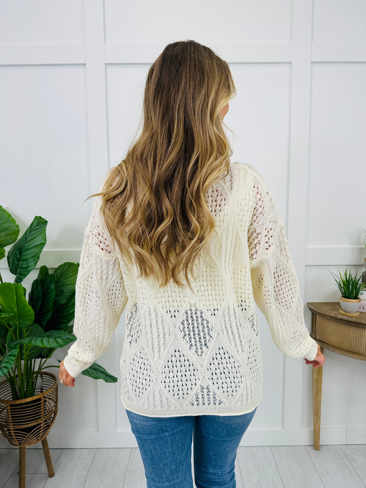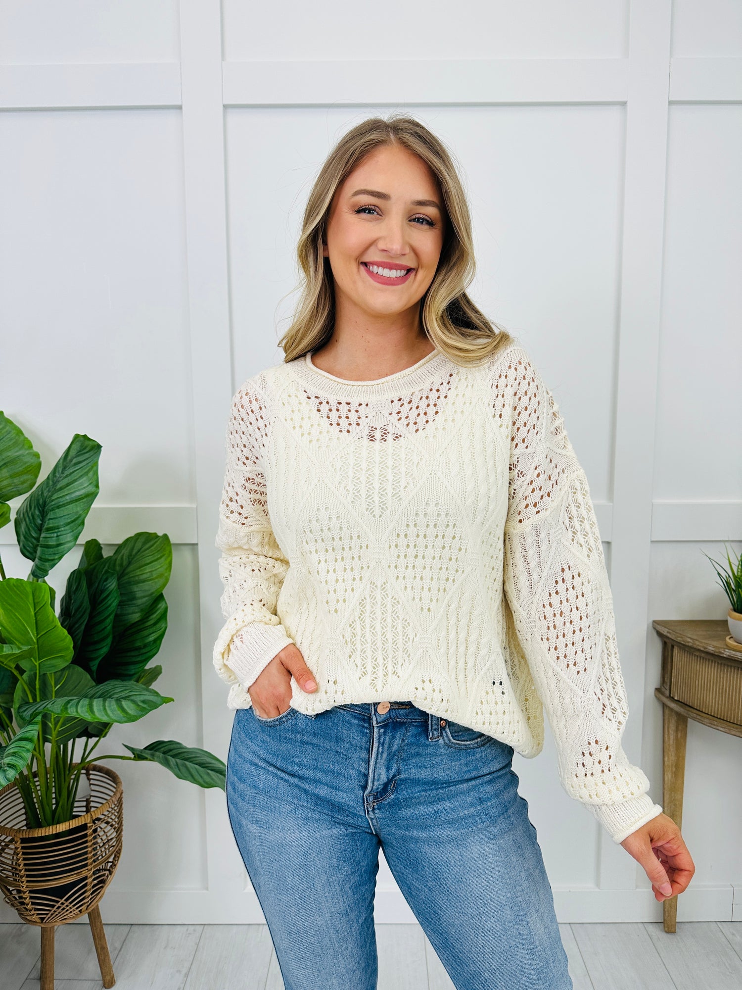 This sweater stands out with its open-knit design and pretty diamond motifs that give it that elevated look the second you put it on. The classic crew neckline keeps it timeless and easy to wear, while the relaxed lantern sleeves add a cozy, effortless feel. The airy knit makes the texture stand out, so it looks polished with minimal styling. It’s an instant outfit-maker when you want something comfy, detailed, and noticeably special.