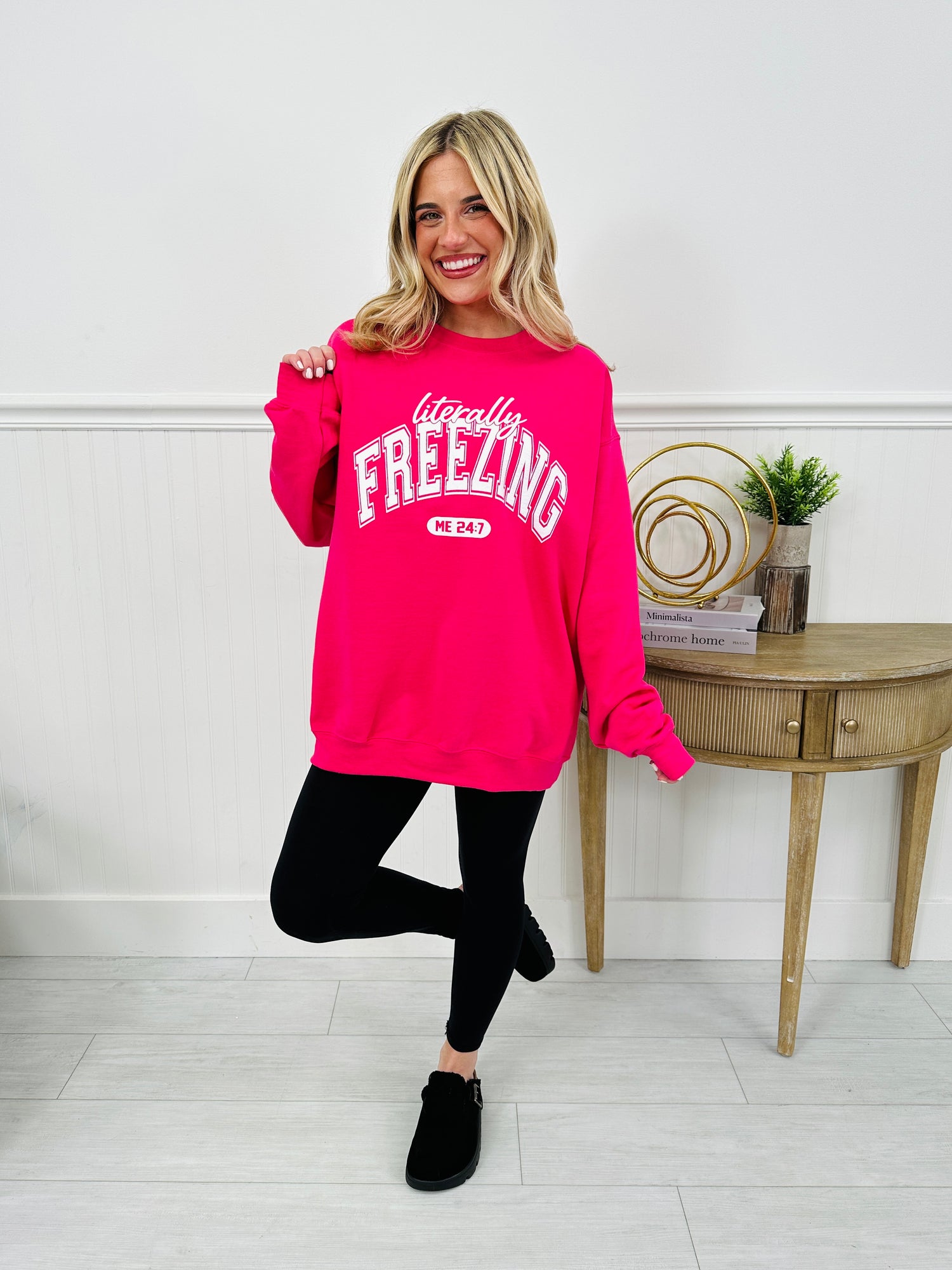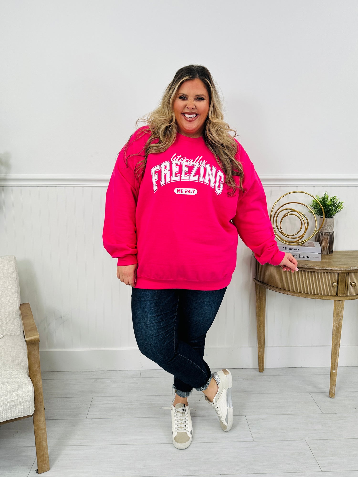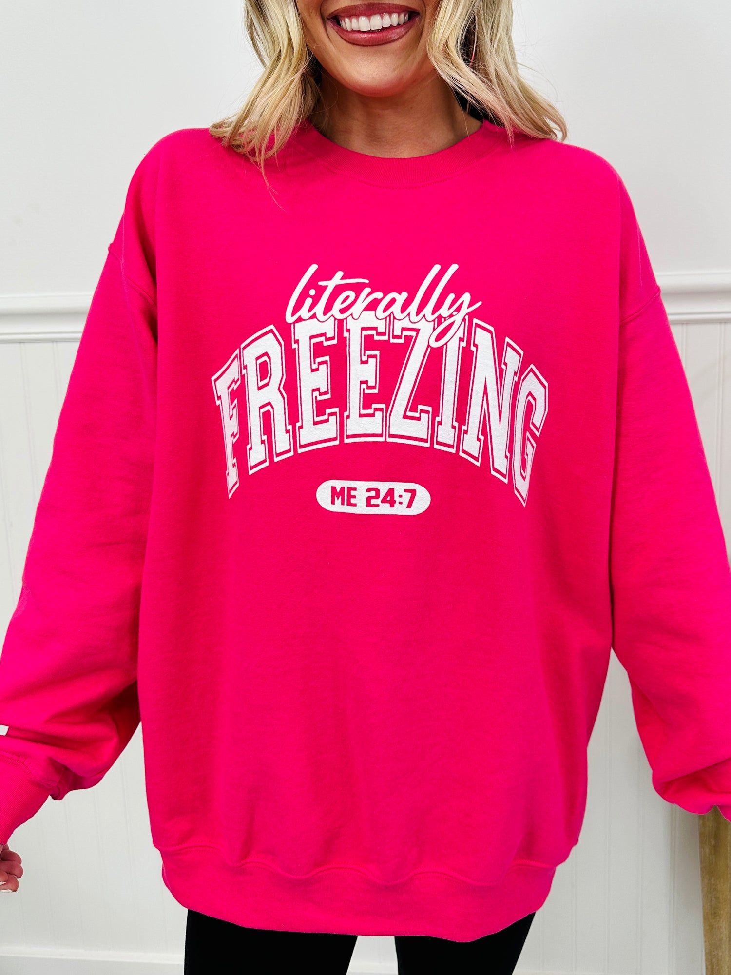 Stay snuggly and stylish all season long in our Literally Freezing crewneck — the cutest way to announce exactly how you feel the moment the temps drop. The bold arched “FREEZING” lettering paired with the handwritten “literally” gives this sweatshirt the perfect mix of trendy collegiate style and cozy personality.