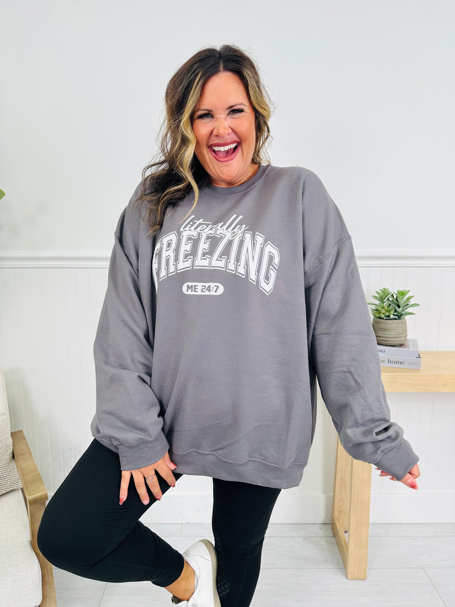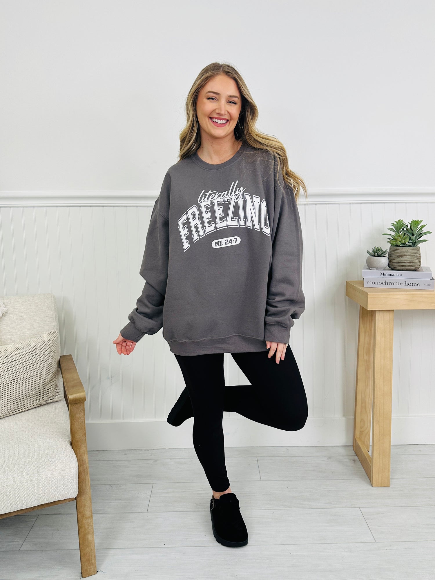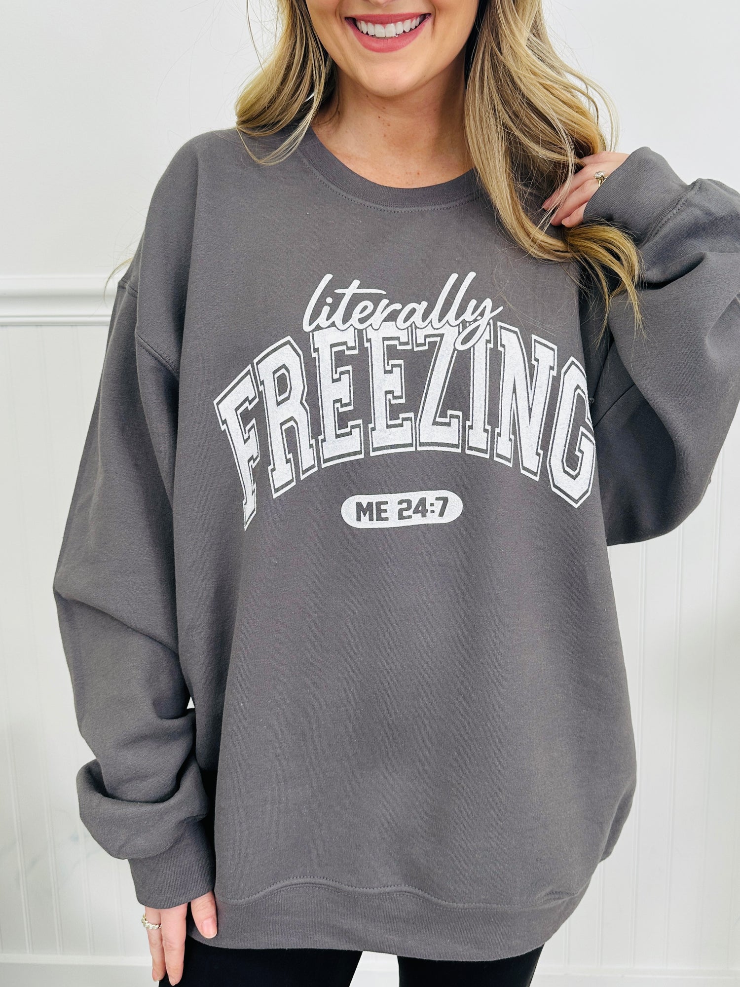 Stay snuggly and stylish all season long in our Literally Freezing crewneck — the cutest way to announce exactly how you feel the moment the temps drop. The bold arched “FREEZING” lettering paired with the handwritten “literally” gives this sweatshirt the perfect mix of trendy collegiate style and cozy personality.