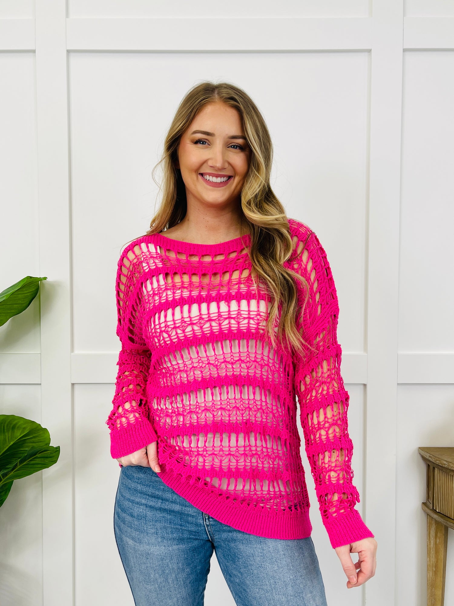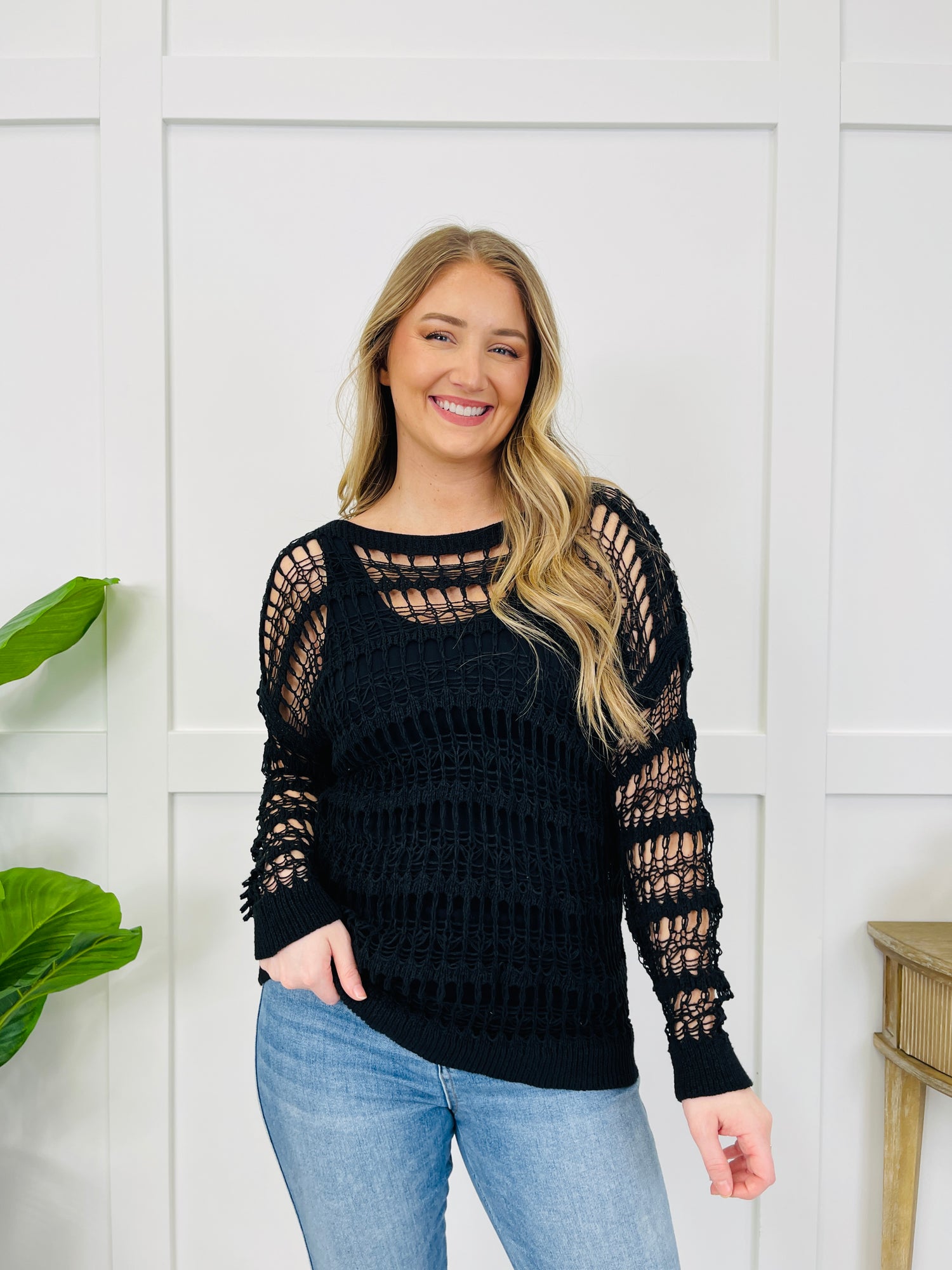 This stunning crochet top strikes the perfect balance between relaxed and edgy. Featuring sheer crochet panels that create a fun, textured look, it also boasts a wide neckline and trim for a laid-back vibe. Pair it with your favorite denim for an effortless yet stylish outfit that's perfect for layering or wearing solo.