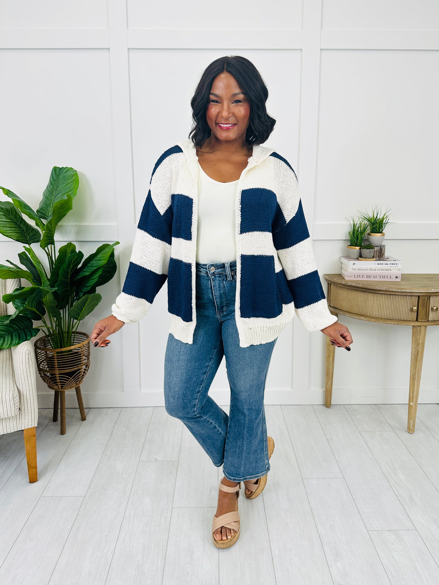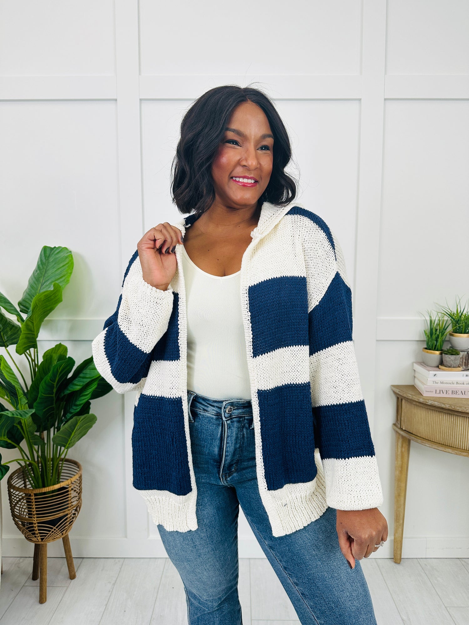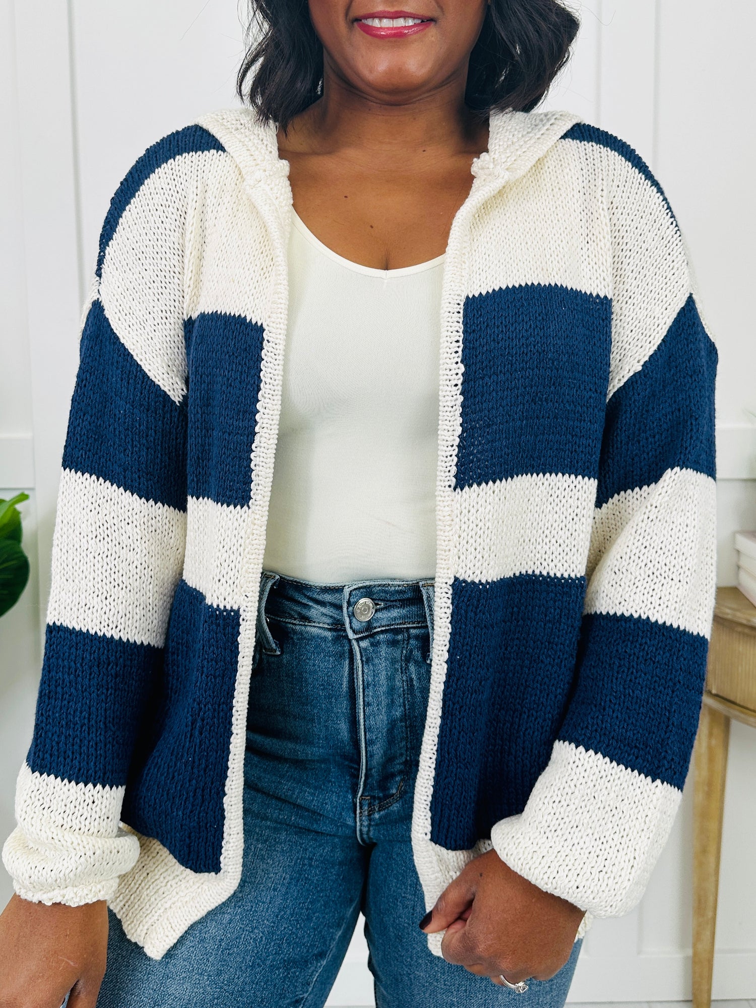This hooded cardigan keeps it classic with bold navy and ivory striping and an easy open-front design you can toss on in seconds. The relaxed drape and textured knit give it that comfy casual feel, while the finished trim along the hood and front edge adds a polished touch to the cozy look.