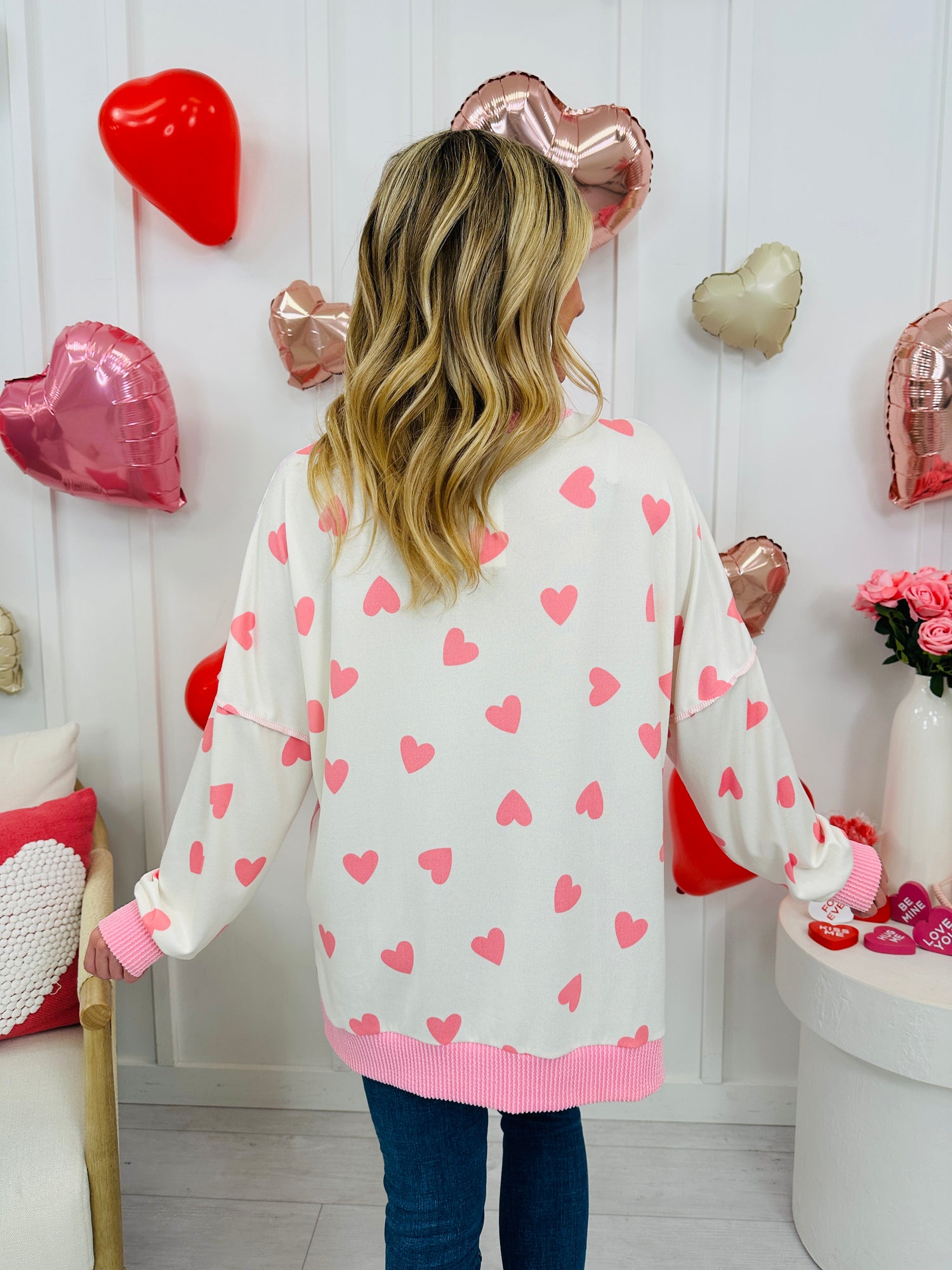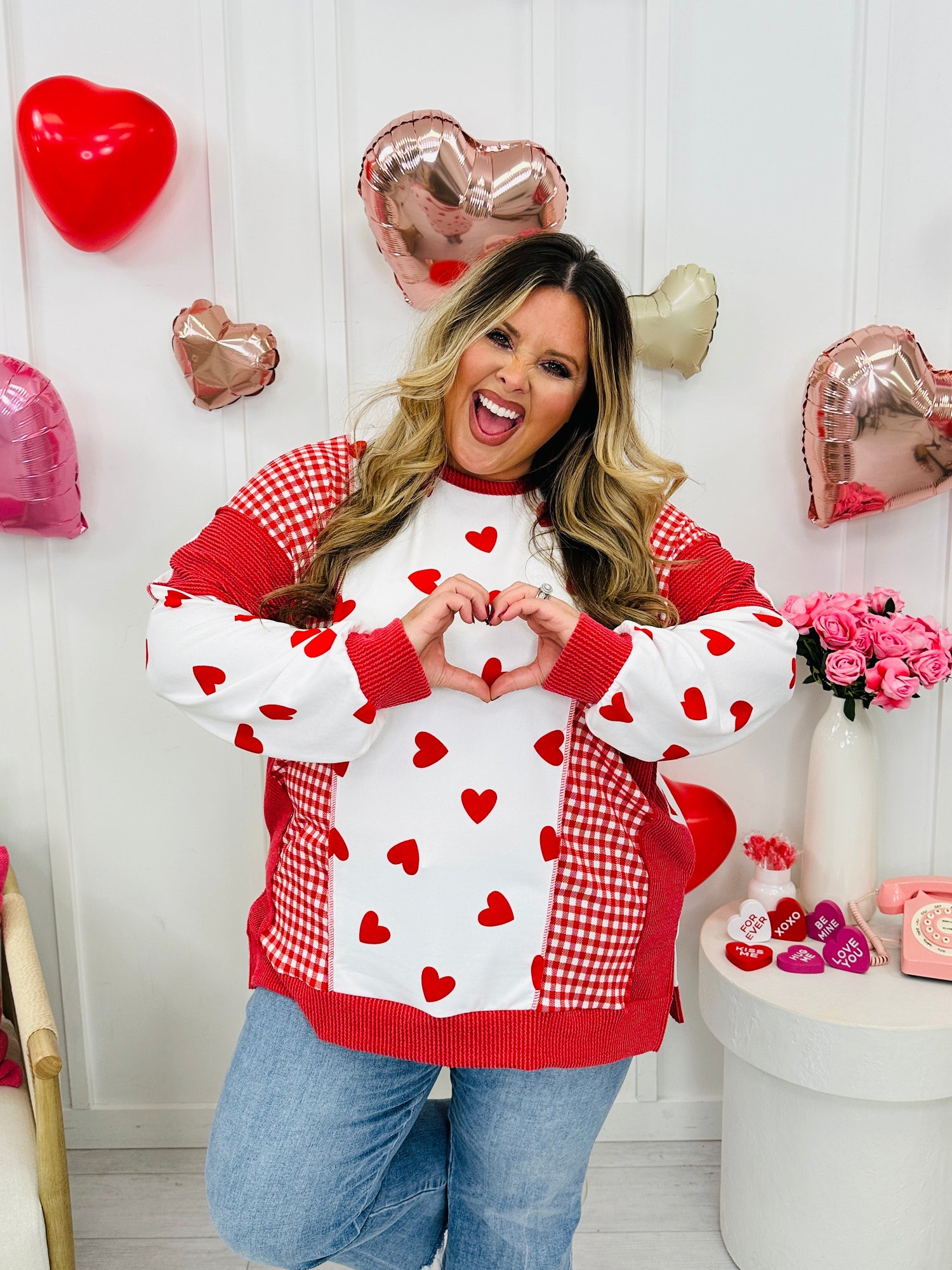 This best selling top is back in a new heart version that's perfect for Valentine's Day. This top is made from buttery soft fabric that our customers rave about and also features our best selling raised rib fabric. This top has an eye-catching patchwork design with playful heart prints and gingham accents that give it the perfect mix of sweet and casual. It's relaxed and oversized fit is flattering on all body types and comfy enough for everyday wear while still making a statement.