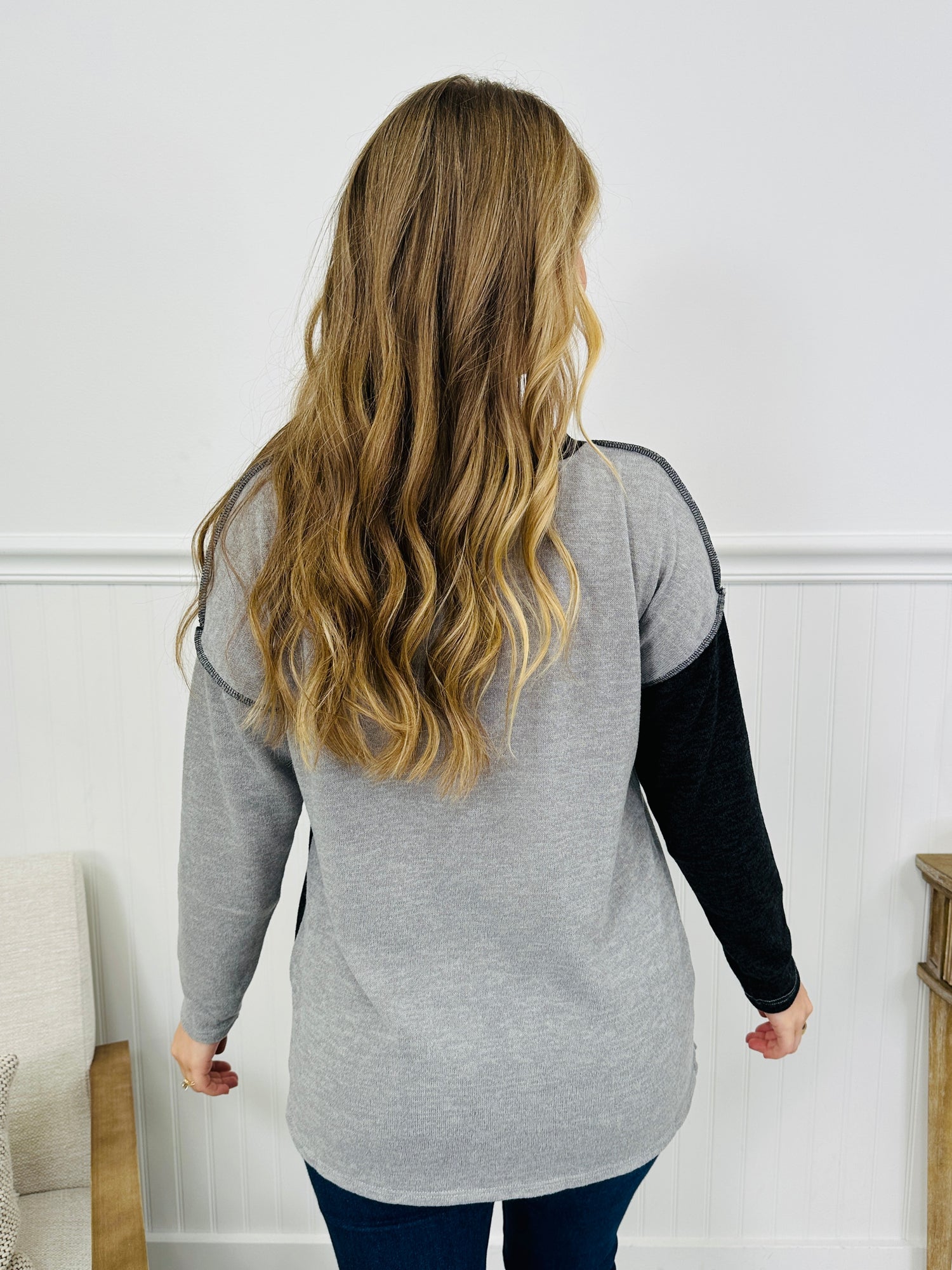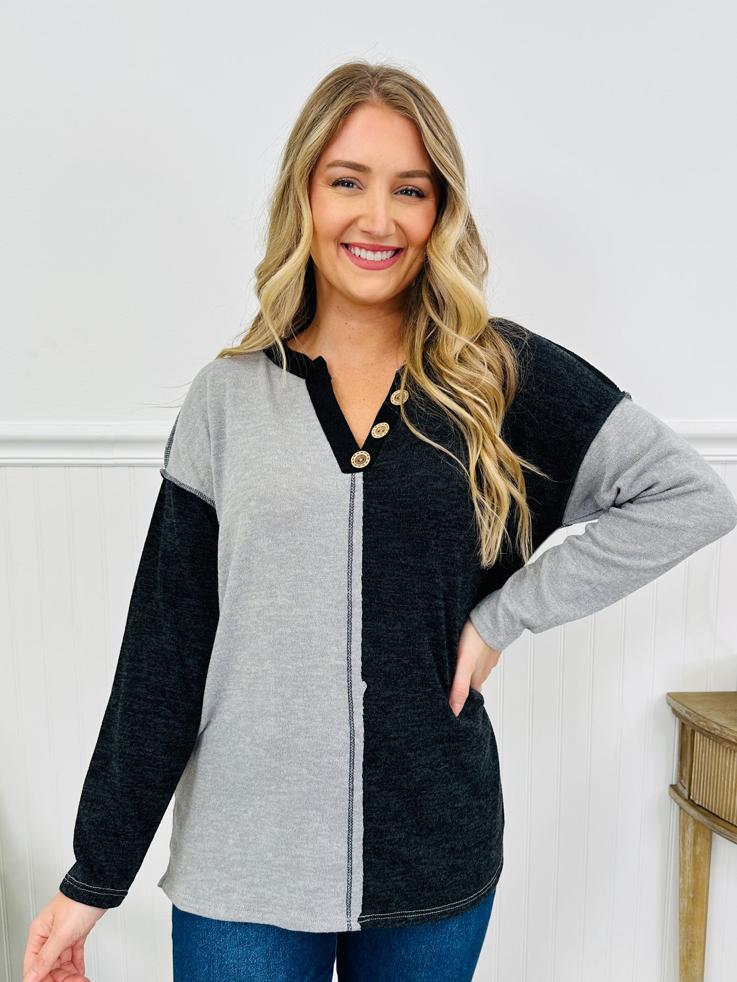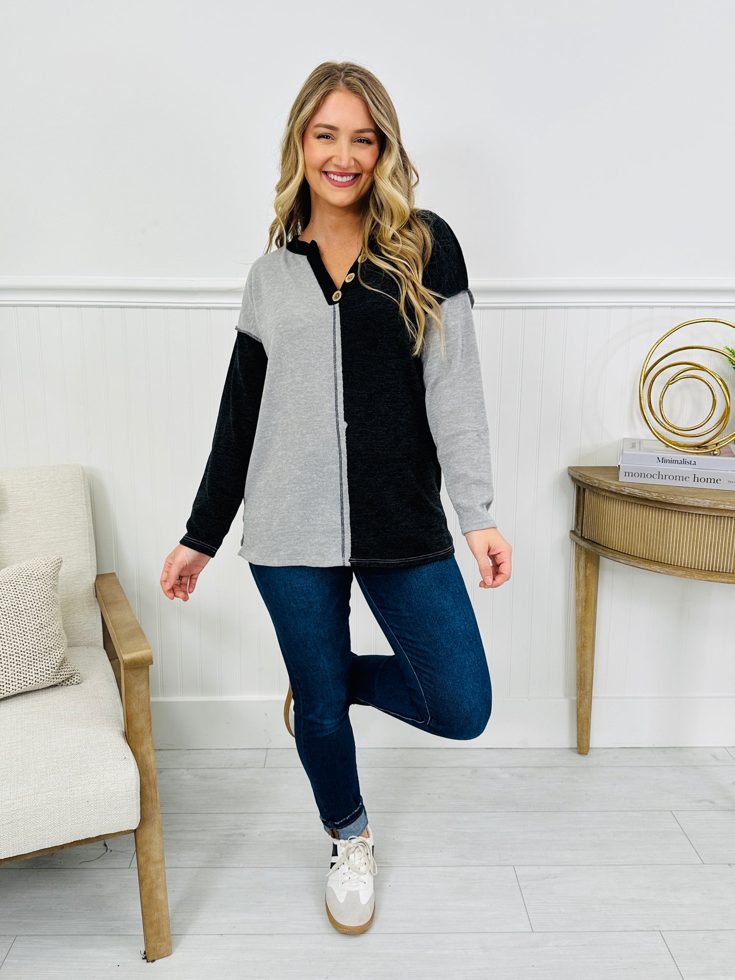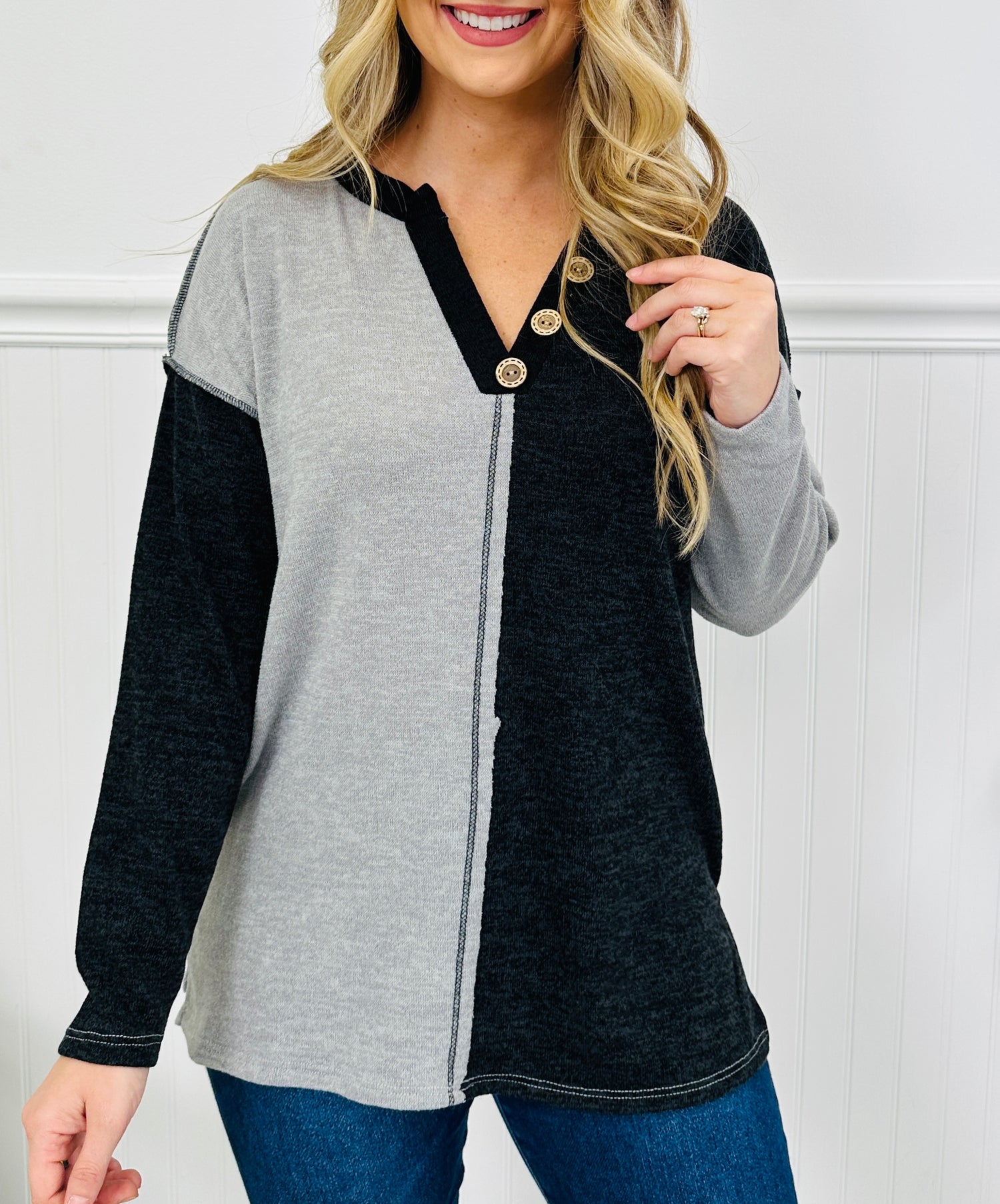 This top is the perfect mix of playful and polished with its bold split color blocking and eye-catching button detail along the v-neck. The relaxed fit style makes it an effortless everyday pick, while the contrasting panel design brings a little extra personality to even the simplest outfit. Pair it with denim and you’re out the door looking cute with almost zero effort required.