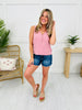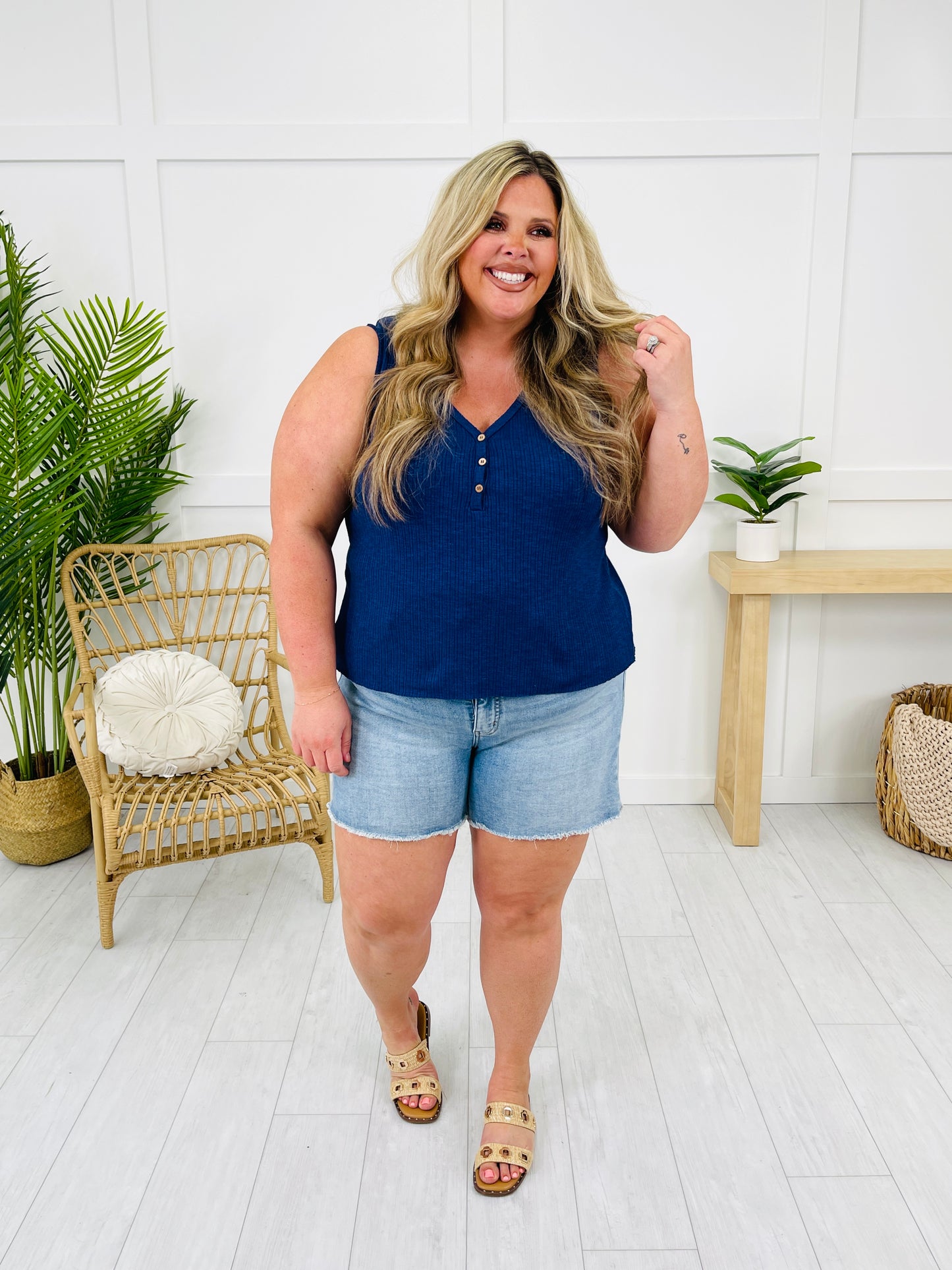 We love the length of this top. It is NOT a crop top but it is not too long, either. It is the perfect length to wear with your high waisted jeans and shorts or you can tuck it without feeling like you have too much extra fabric that is bunching. Chase the sun in this new tank top that is a must have this season!