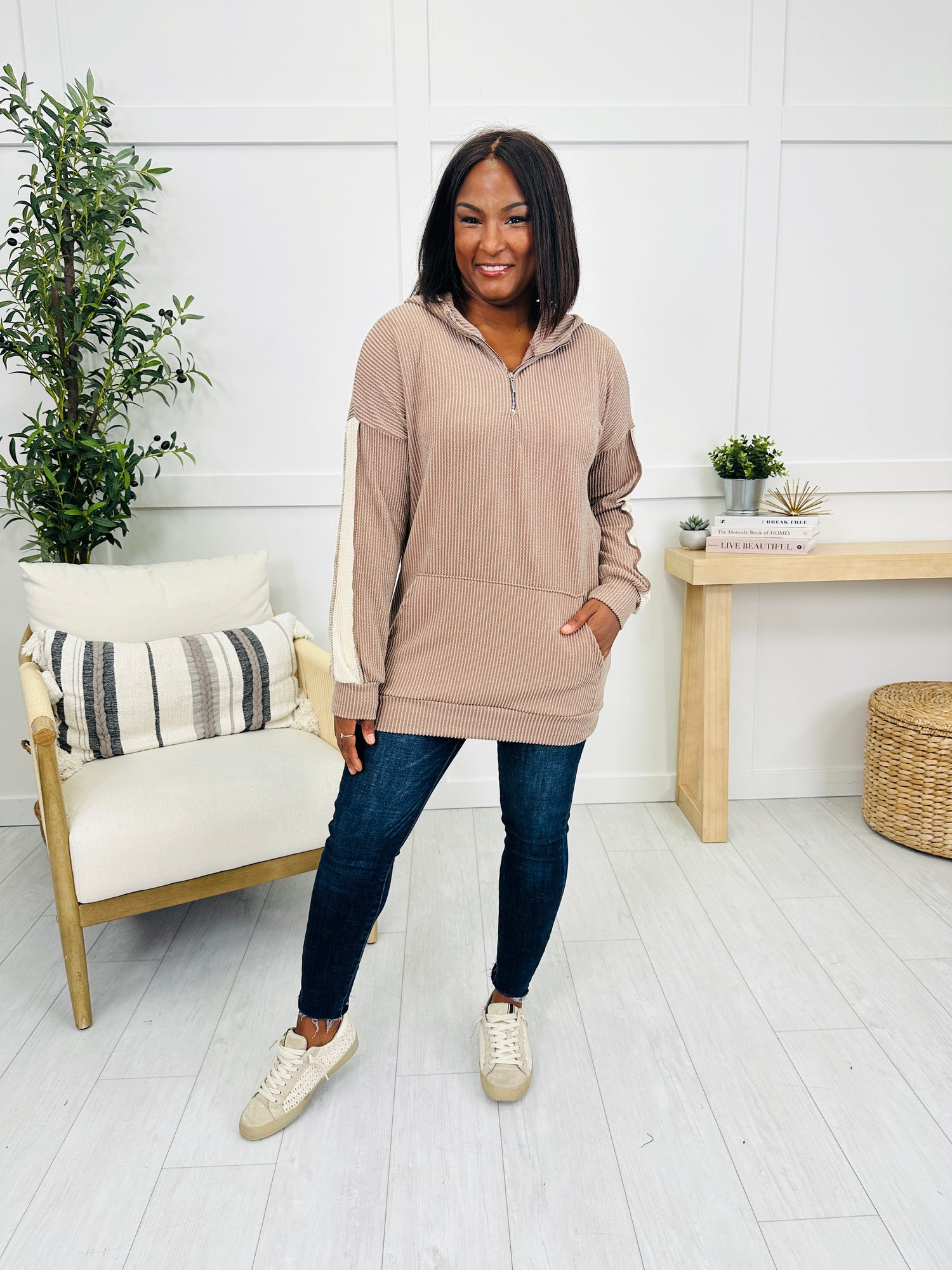 This cozy pullover blends laid-back comfort with subtle detailing for an effortlessly stylish look. The quarter zip neckline adds a sporty touch, while the textured striped fabric brings soft dimension to the design. Finished with a front pouch pocket and contrasting sleeve details, this easygoing piece is perfect for casual days or layering through the seasons.