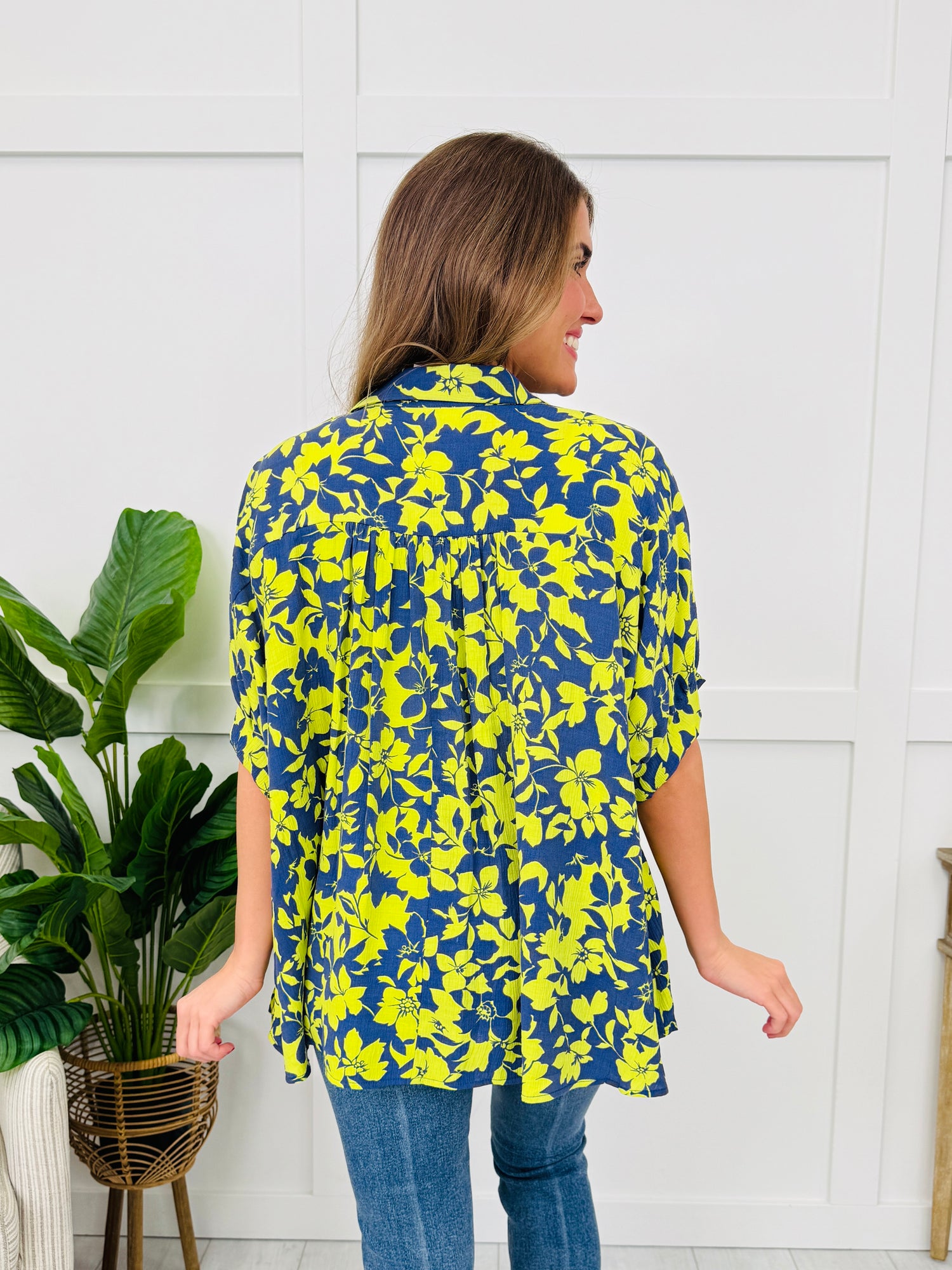 Make a bold statement in the best way with this vibrant floral top! The bright lime blooms pop against a navy background for an eye-catching look, while the button front and oversized silhouette keep it casual and breezy. With its relaxed and roomy fit, this top is easy to style and even easier to love.