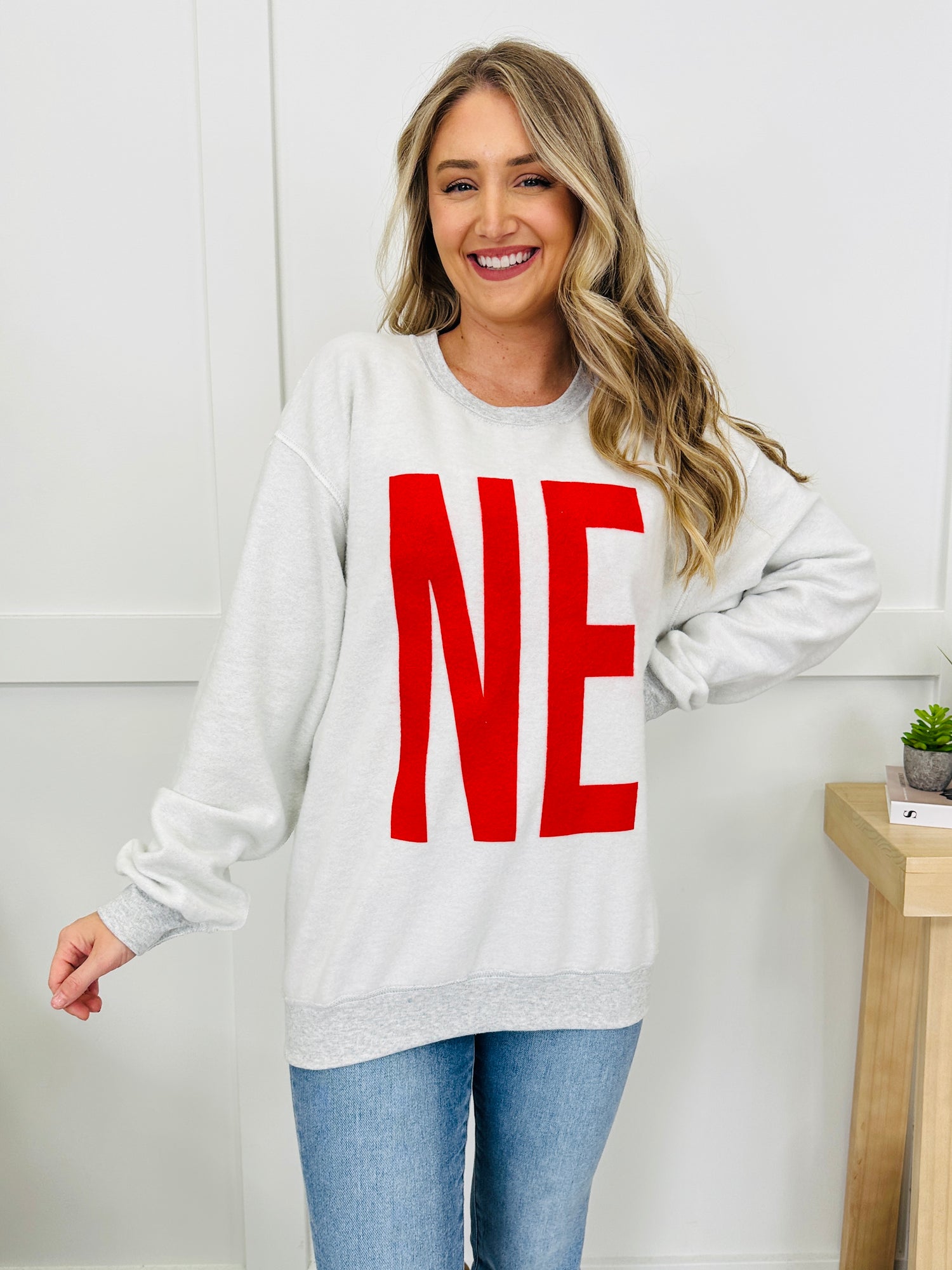 Celebrate game day in a whole new way! This screen printed crewneck is designed in-house with a bold red NEBRASKA across the front, while the inside flips to reveal the abbreviation NE for a fresh twist. Screen printed on a soft ash gray, it’s the perfect mix of sporty spirit and comfy style you’ll want to wear everywhere. Pair with jeans or leggings for multiple game day looks!