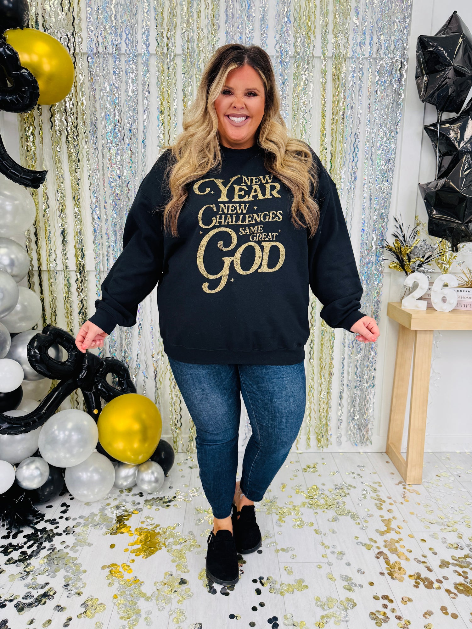 Celebrate fresh beginnings in the New Year, Same God sweatshirt — a meaningful and inspiring design that reminds you that while the year may change, God’s faithfulness never does. The decorative, gold metallic lettering brings a bold, uplifting touch, creating a look that feels empowering, comforting, and perfect for the season.