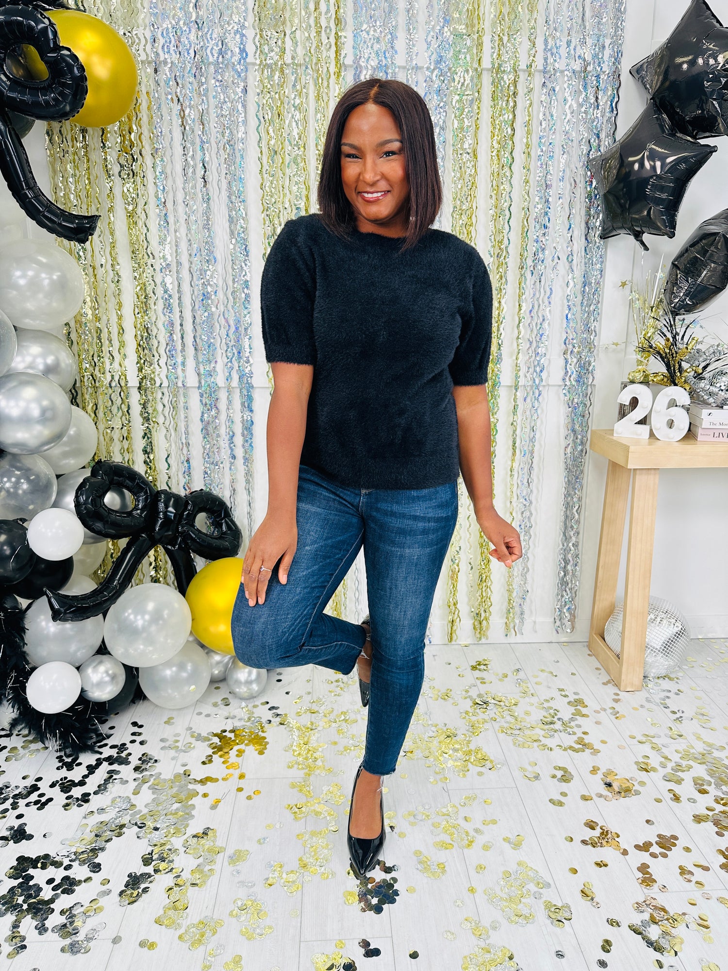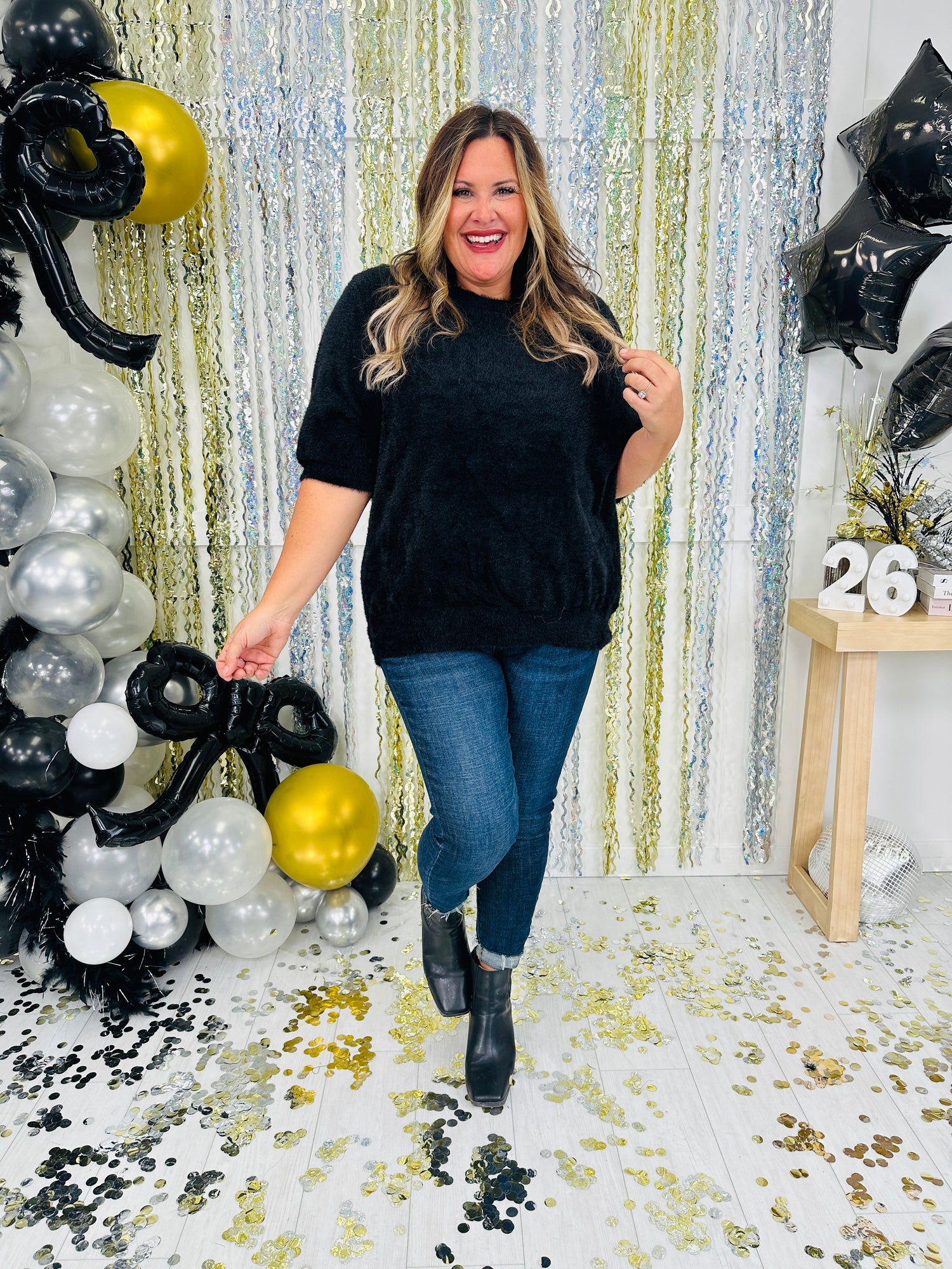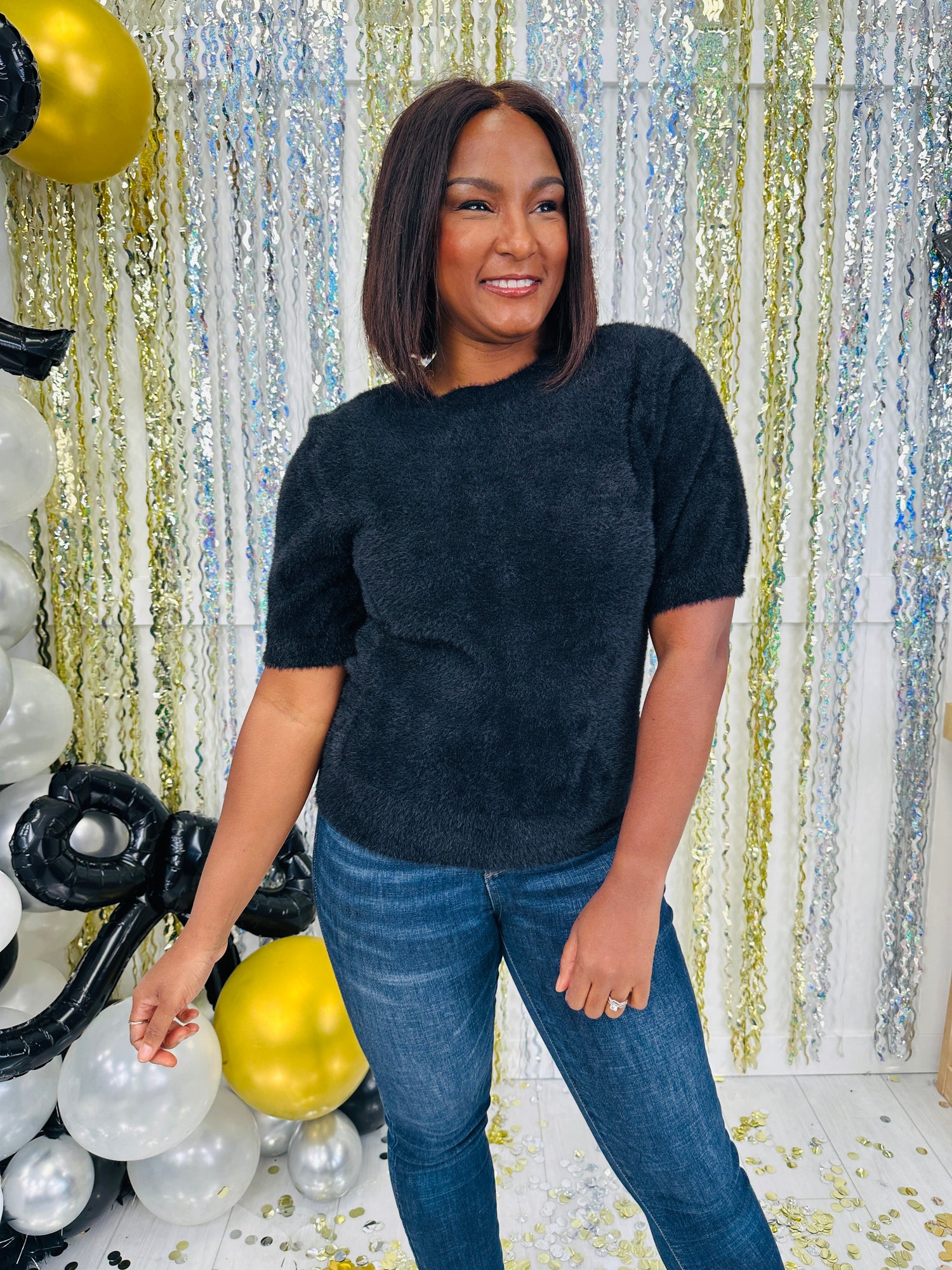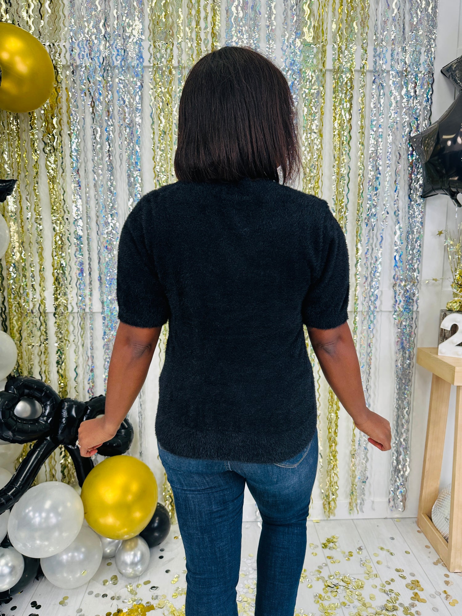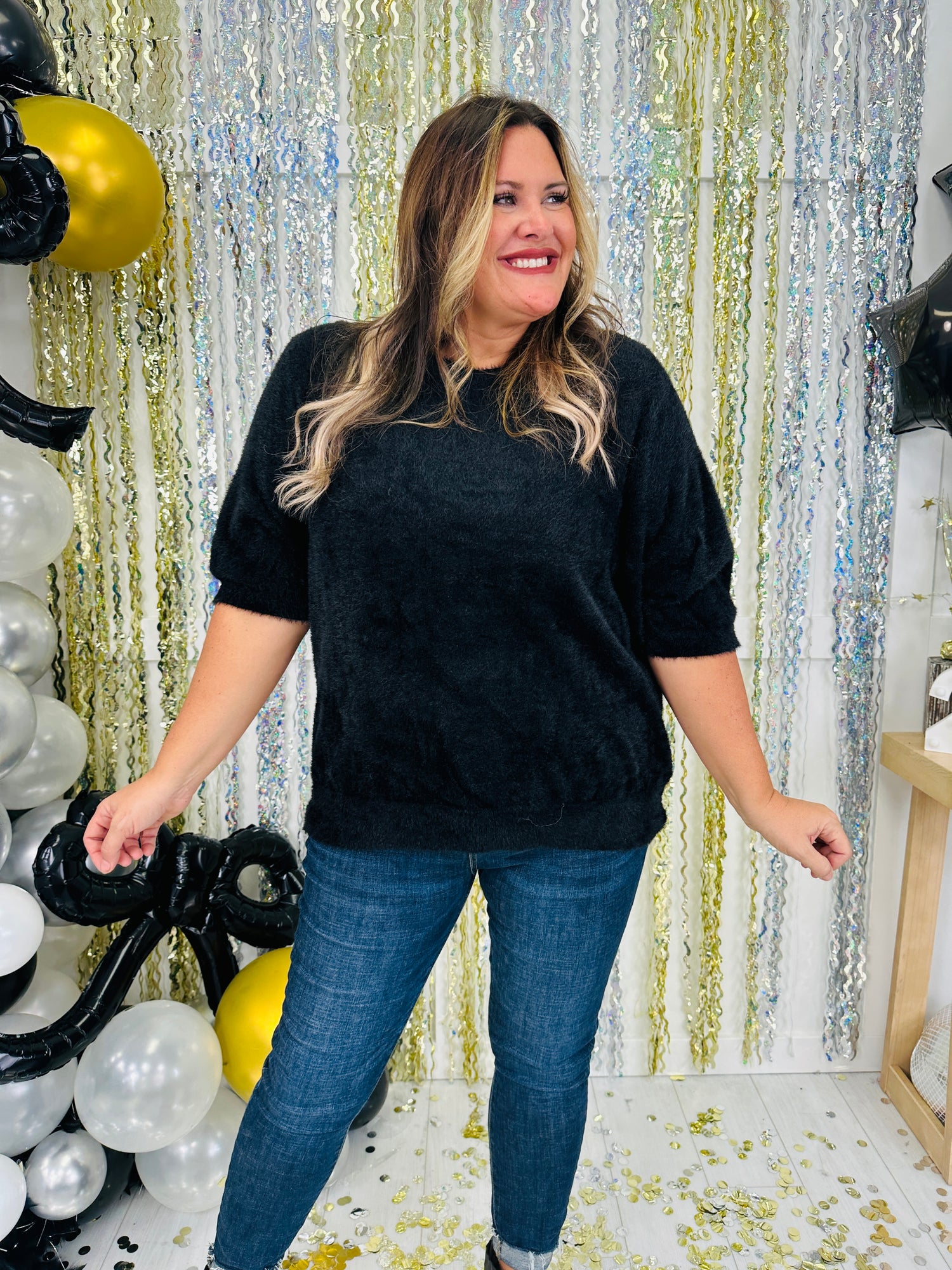 This ultra-soft, fuzzy top brings both comfort and style to your wardrobe with its relaxed fit and cozy texture. The short sleeves and classic rounded neckline provide a flattering, timeless look that’s perfect for pairing with jeans or skirts. Available in a versatile shade, this piece is ideal for layering or wearing on its own for a chic, effortless outfit.