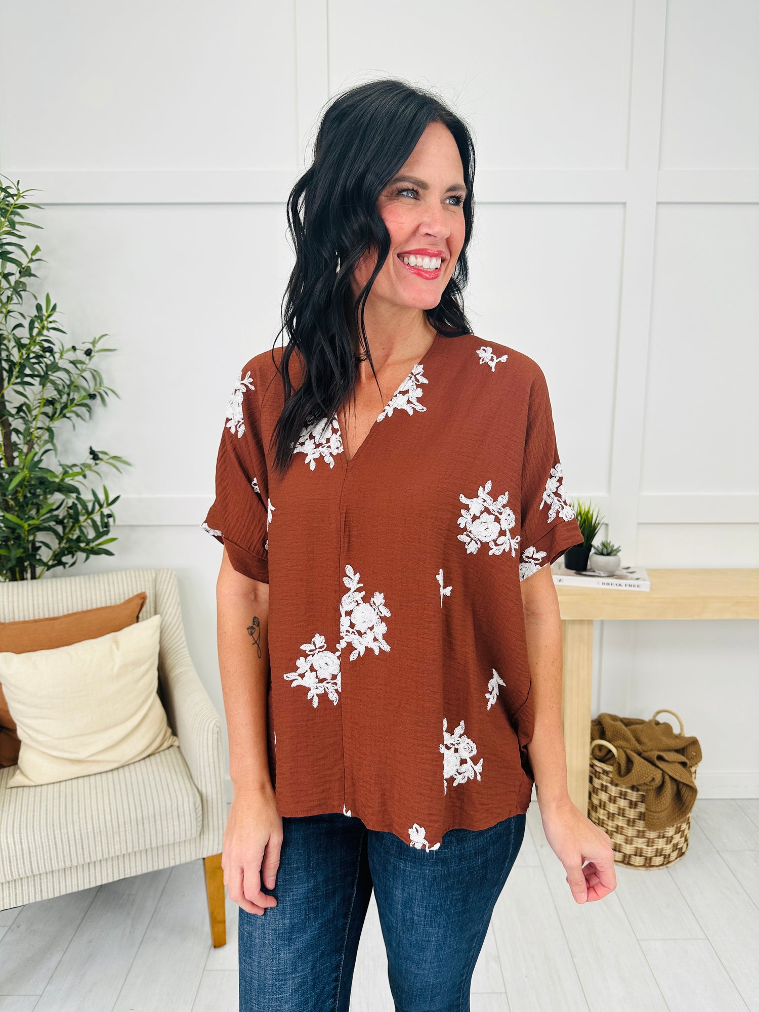 This top blends effortless elegance with everyday charm. The embroidered white floral accents stand out beautifully against the warm brown backdrop, adding texture and a touch of femininity. With its relaxed fit, v-neckline, and customer favorite MOCO Flow material, this piece is an easy choice for both casual days and dressed-up moments.