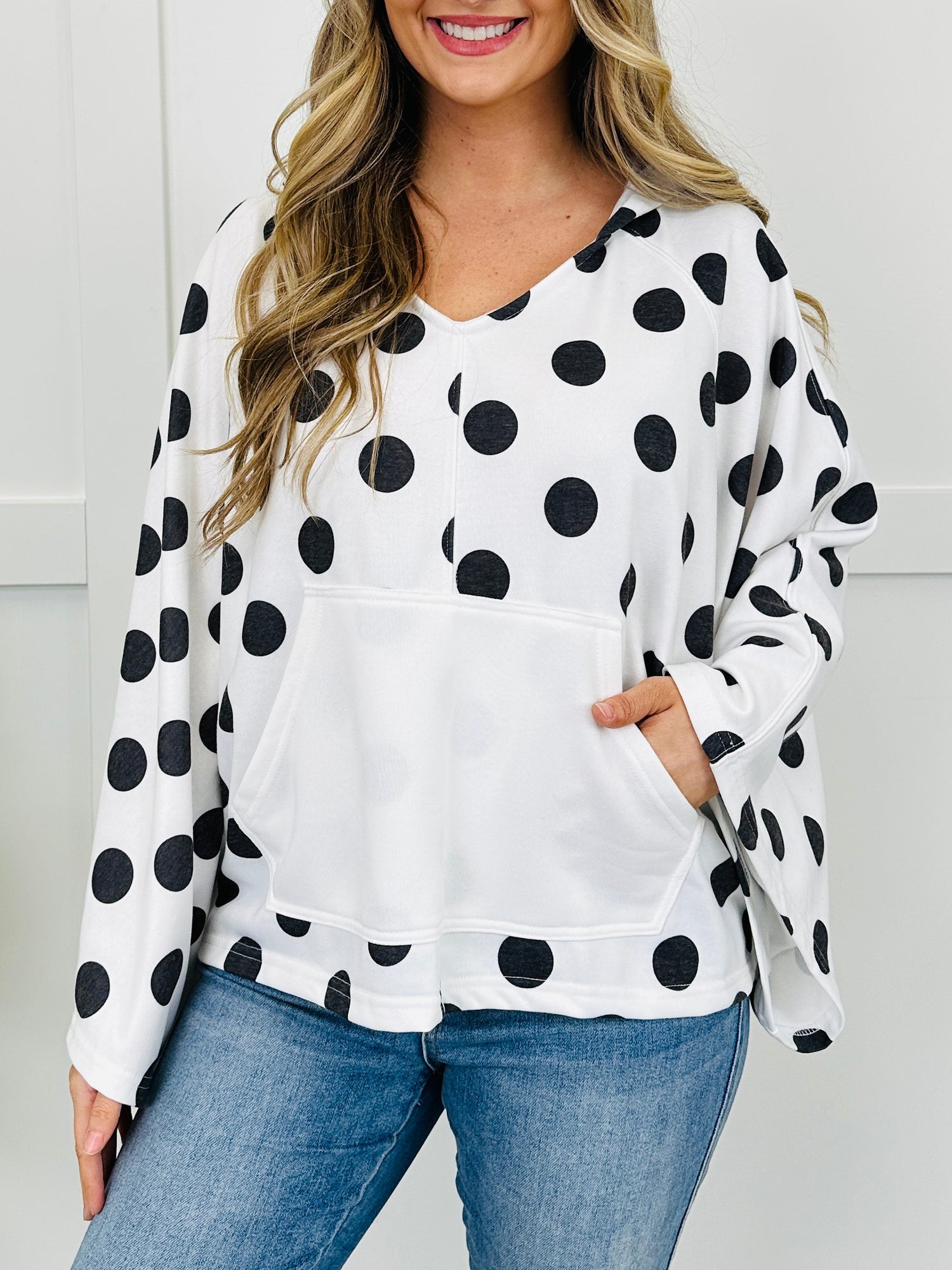 This playful piece is all about easy-going comfort with a fun twist. The oversized fit gives you a relaxed, laid-back fit while the bold polka dot print adds a pop of personality. Featuring a cozy front kangaroo pocket and a flattering v-neckline, this top effortlessly combines style and comfort. Whether you're lounging around or running errands, it's the perfect grab-and-go top that still keeps you looking chic.