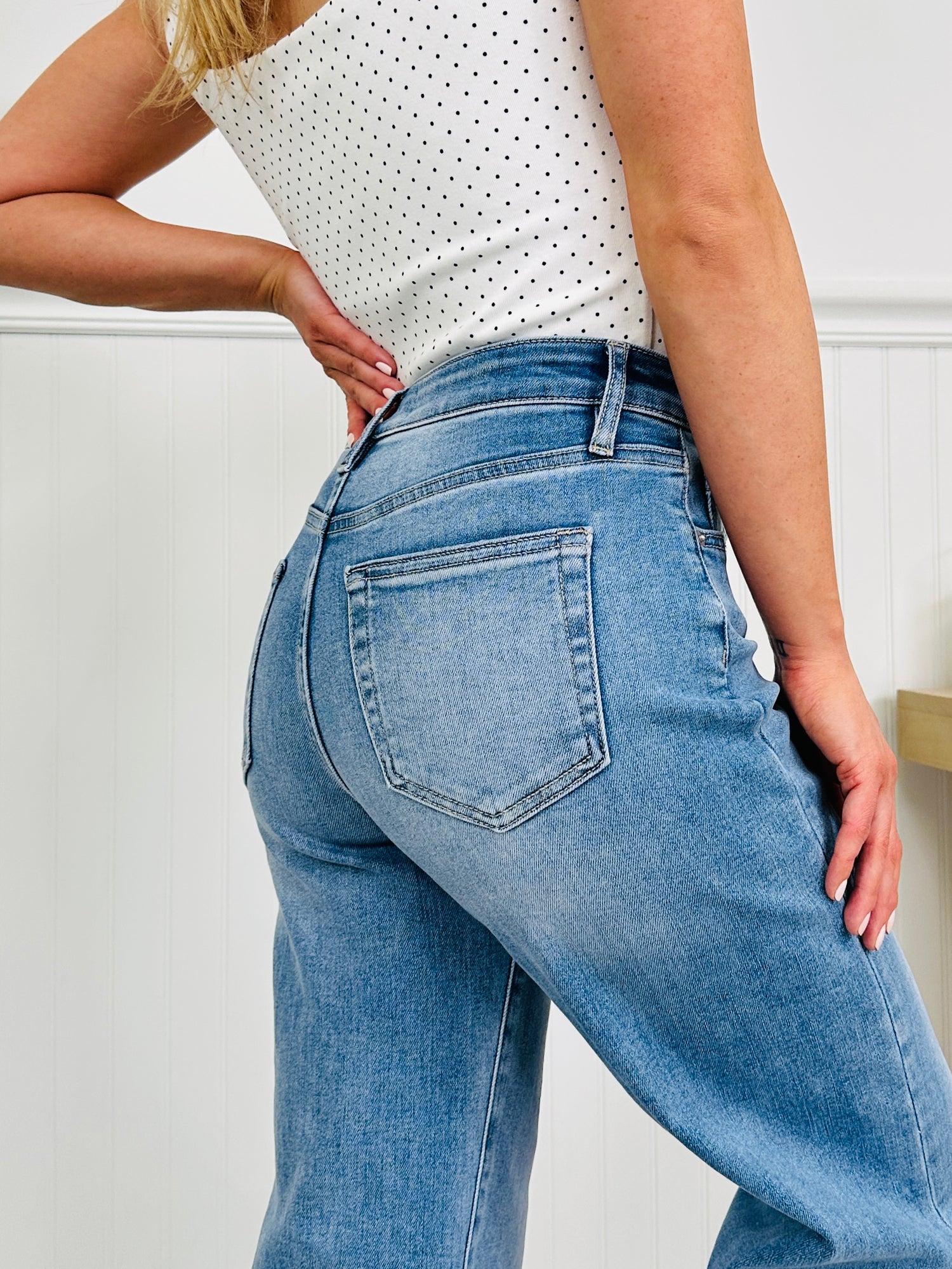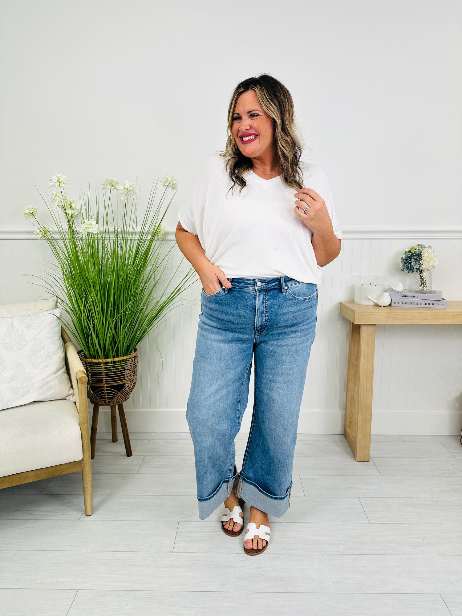 These cuffed wide leg cropped jeans are the trendy basic jean your closet needs this spring. They have incredible stretch and snap back, which means they won't sag as the day goes on. They are buttery soft and so comfortable-- you will never want to take them off! They feature our viral tummy control panel that will hold everything in for an amazing confidence boost! These are completely non-distressed and can be worn from work to weekend to everywhere in between. The cuff is sewn so that you don't have to worry about it un-cuffing as the day goes on! Your wardrobe has been waiting for these jeans!