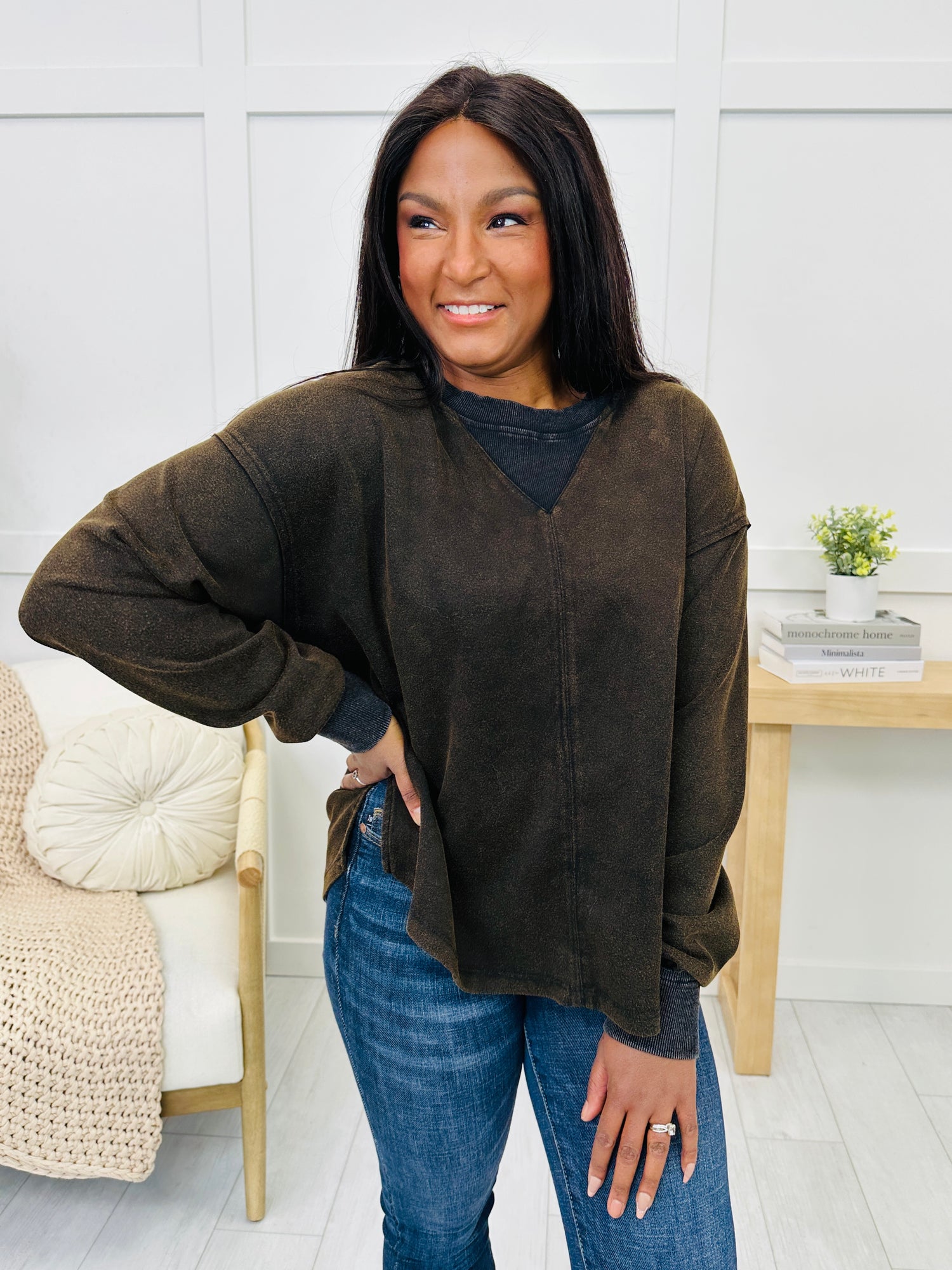 This top brings effortless style with its washed, lived-in look that gives it that perfectly broken-in vibe from the very first wear. The laid-back neckline pairs with subtle seam detailing to create an easy, throw-on feel that still looks intentional. Finished with a relaxed everyday fit and contrasting cuffs, it’s the kind of piece you’ll reach for again and again.