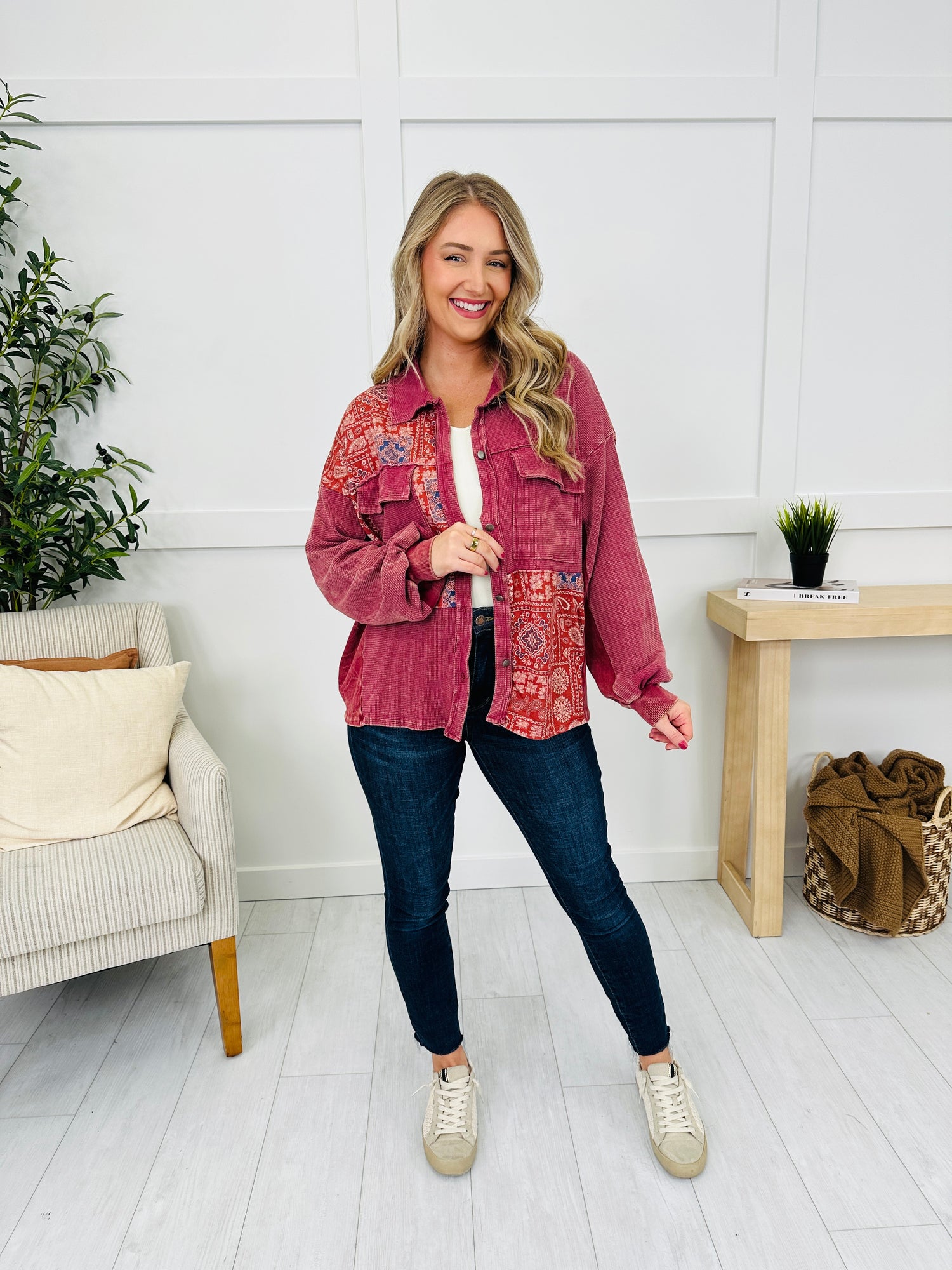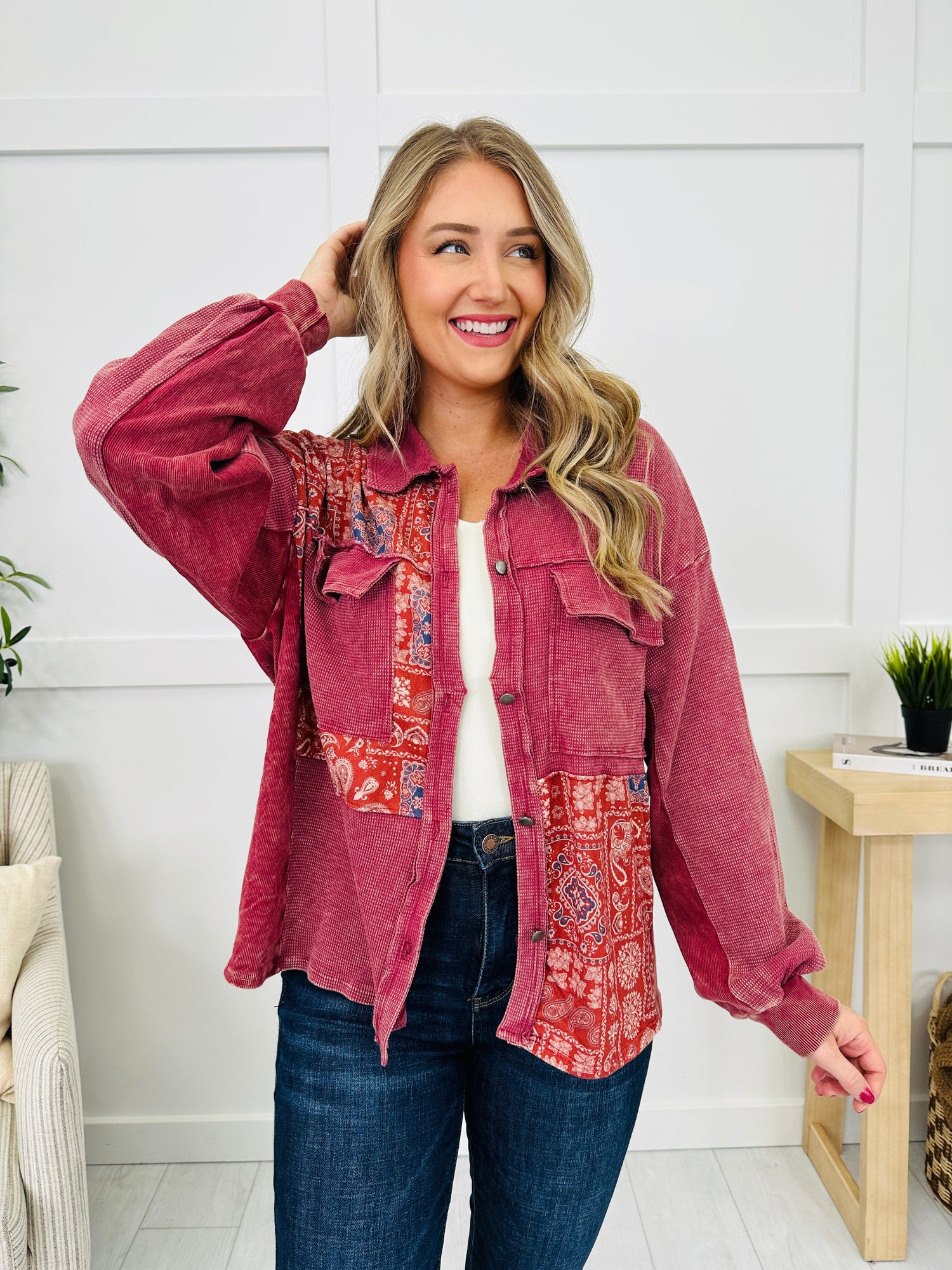 This cozy corduroy shacket features vibrant paisley panels throughout, adding a pop of color to your looks. With its button-up closure and relaxed fit, it’s perfect for layering during the colder months. The contrasting textures and fun print make this piece both unique and versatile for fall styling.