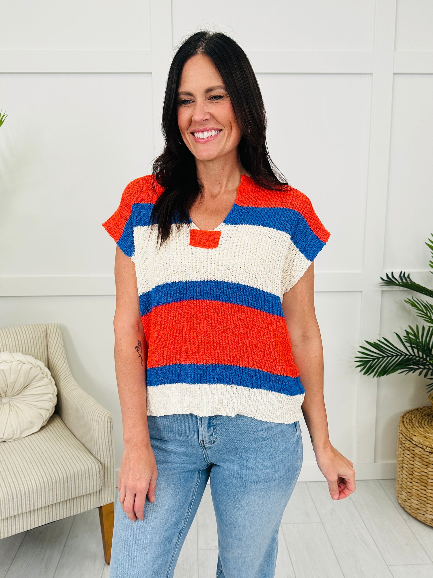 This knit top features a bold striped design across the front in red, white, and blue. The lightweight, breathable fabric and relaxed fit make it a comfortable option for casual wear. Plus, the subtle V-neck and trendy hip length adds a flattering touch to this patriotic piece. Wear it with matching dyed denim and wedges for a cute and classy look, or style it with cutoff shorts and platform sandals!