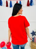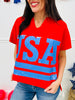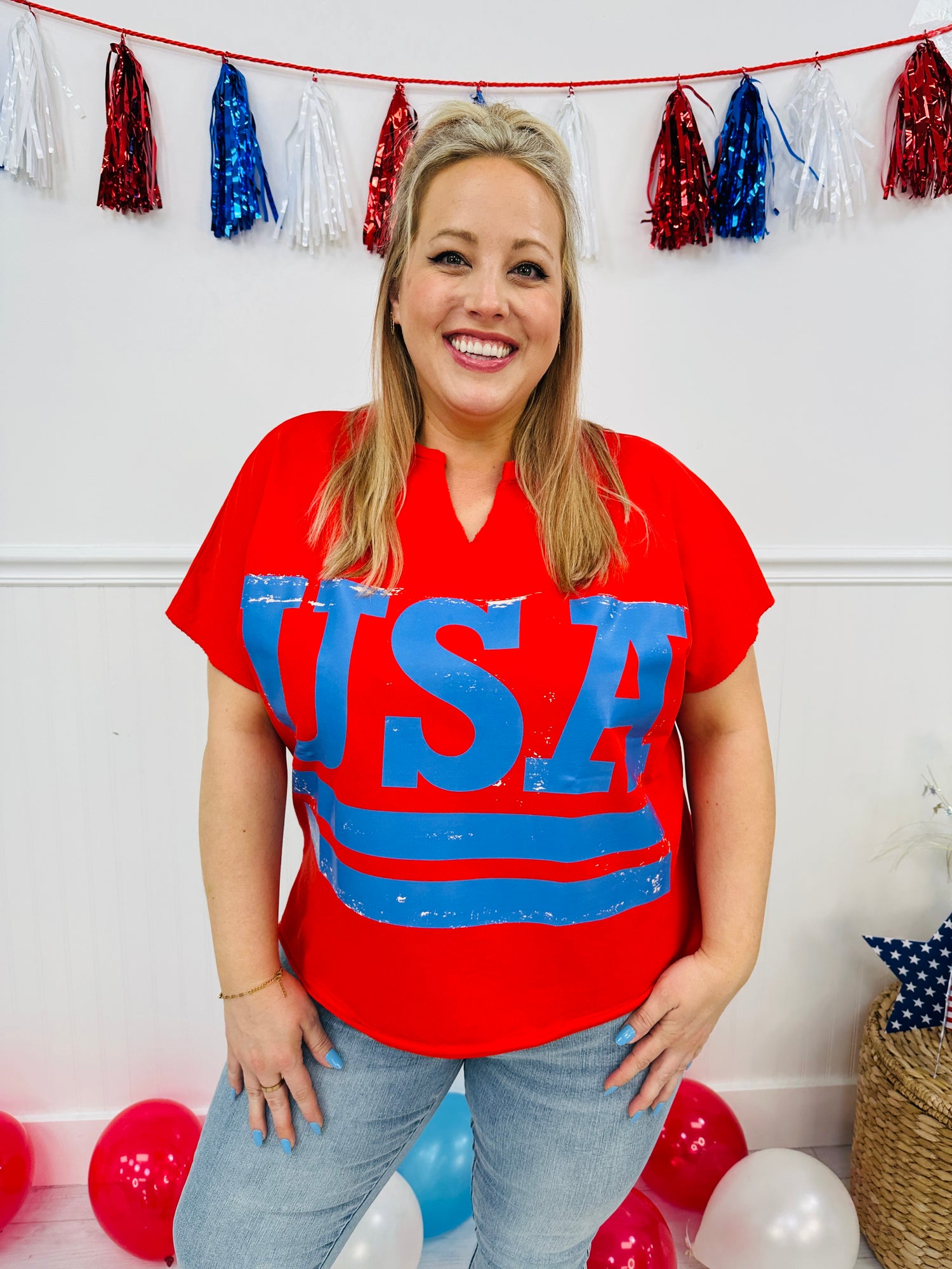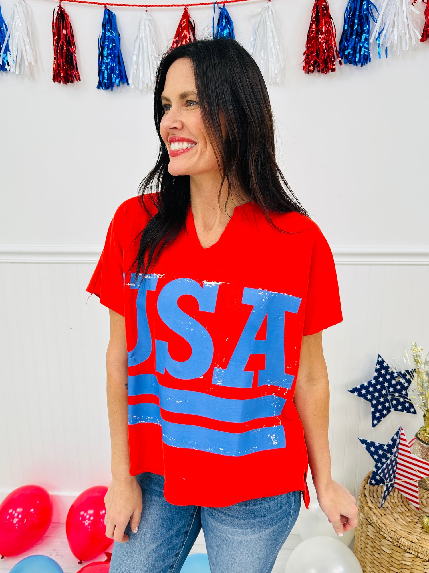 This patriotic tee brings all the bold, vintage vibes with its standout USA lettering and retro stripe accents. The distressed detailing gives it that perfectly lived-in look, while the raw, notched v- neckline adds just the right amount of edge. It's the perfect pick for parades, fireworks, or any star-spangled celebration!