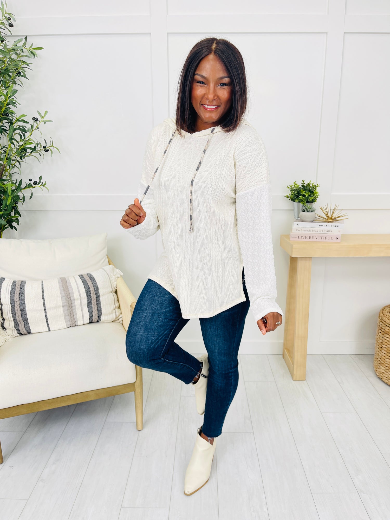 This cozy hoodie features a stylish cable knit design, combining texture and comfort effortlessly. The fun animal print drawstrings add a playful touch, while the relaxed fit makes it a versatile layering piece for any casual outing. Its lightweight material and neutral tone make it easy to style with your favorite jeans or leggings.