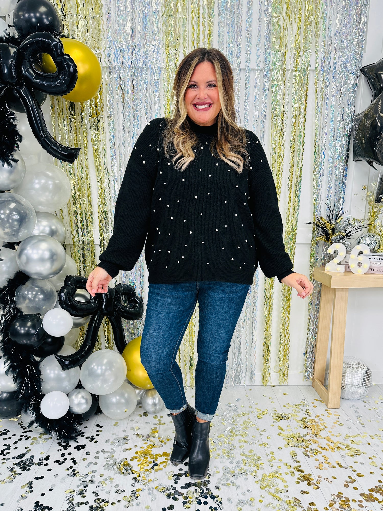 This new arrival brings the right amount of glam to your winter wardrobe this year. The soft, cozy knit keeps things comfortable, while the scattered pearl accents add that instant festive sparkle without going over the top. The mock neck and relaxed silhouette make it an easy, flattering fit for all-day wear — from holiday events to casual nights out.
