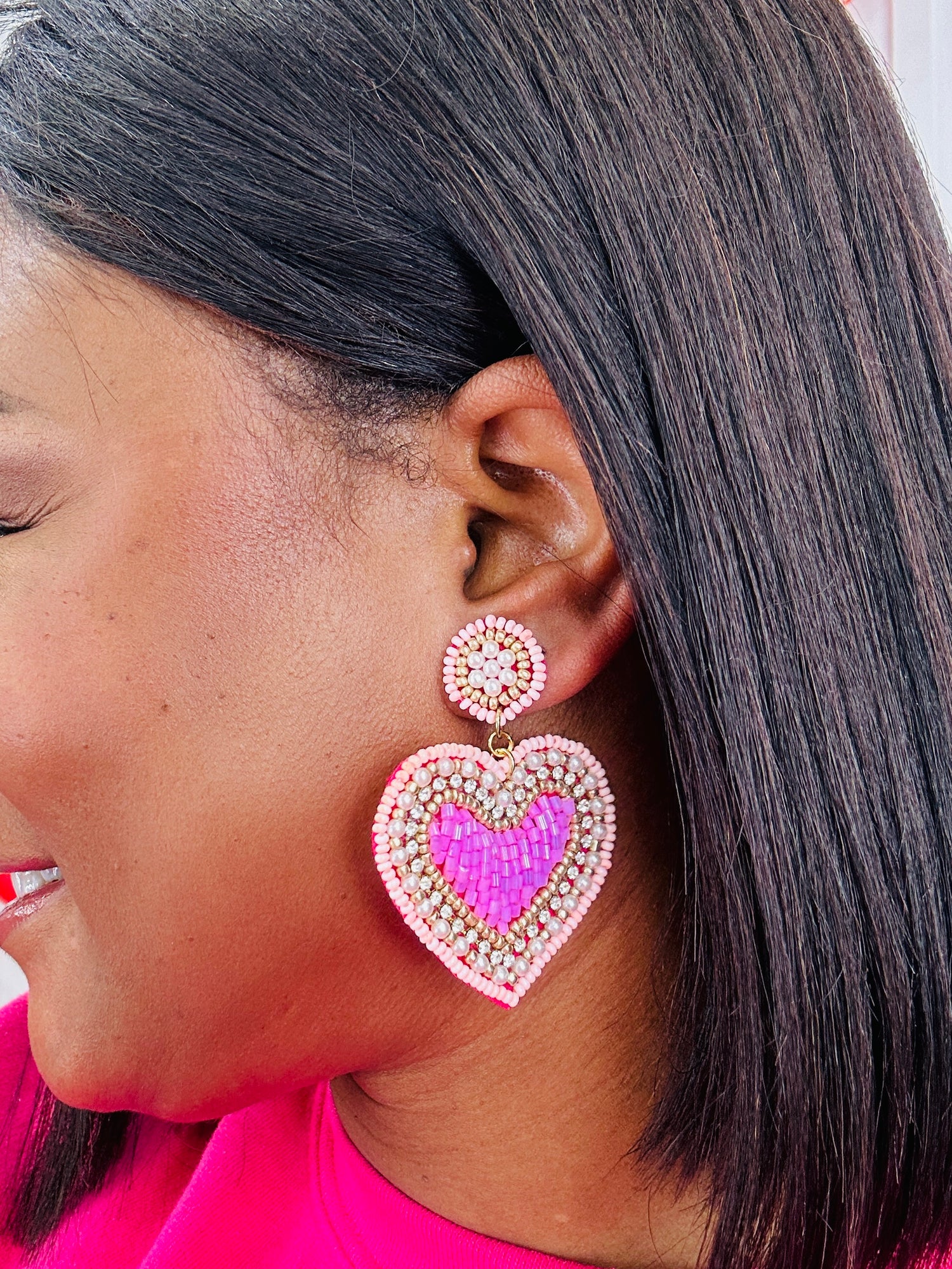 These statement heart earrings are made to steal the spotlight with their layered beadwork, shimmering rhinestone accents, and bold pop of pink at the center. The mix of textures and sparkle creates a fun, flirty look that instantly brightens your outfit. Perfect for Valentine’s plans or anytime you’re feeling extra, they add just the right amount of playful glam to your look.