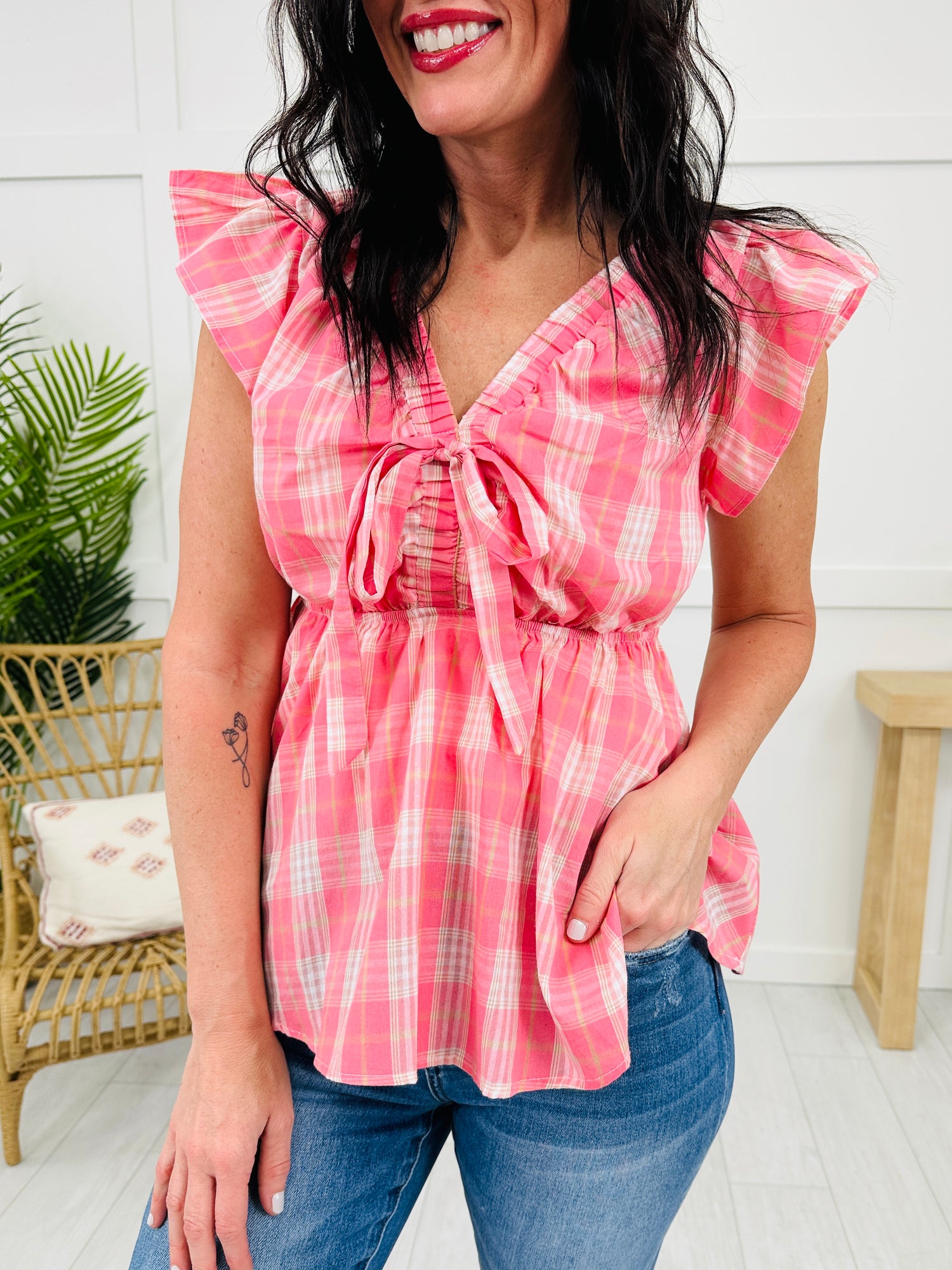This charming gingham top features a flattering tie-front detail and playful flutter sleeves, offering a light and breezy feel perfect for warm days. The gathered waist adds shape and structure, creating a flattering silhouette, while the soft cotton blend ensures comfort all day long.