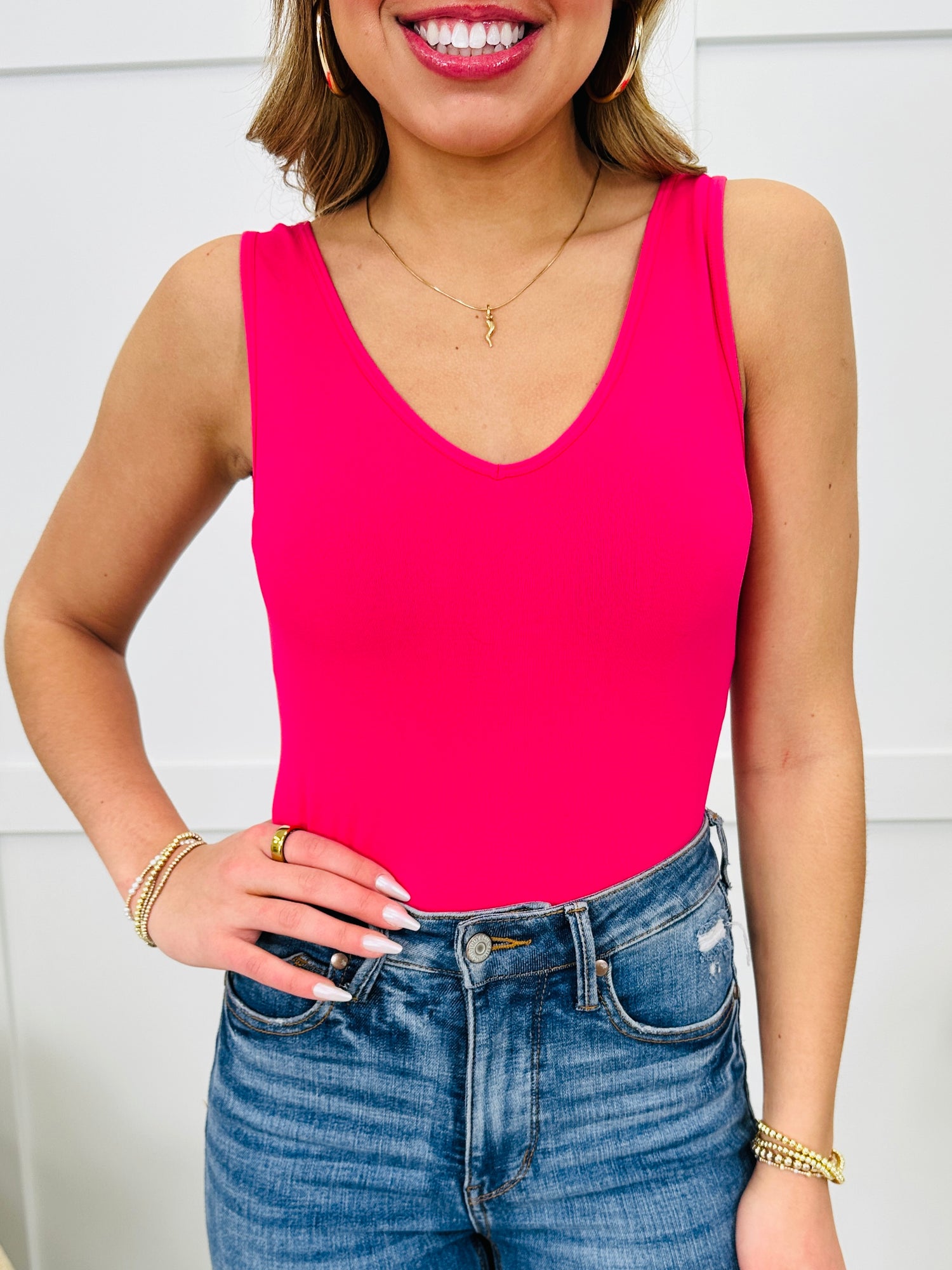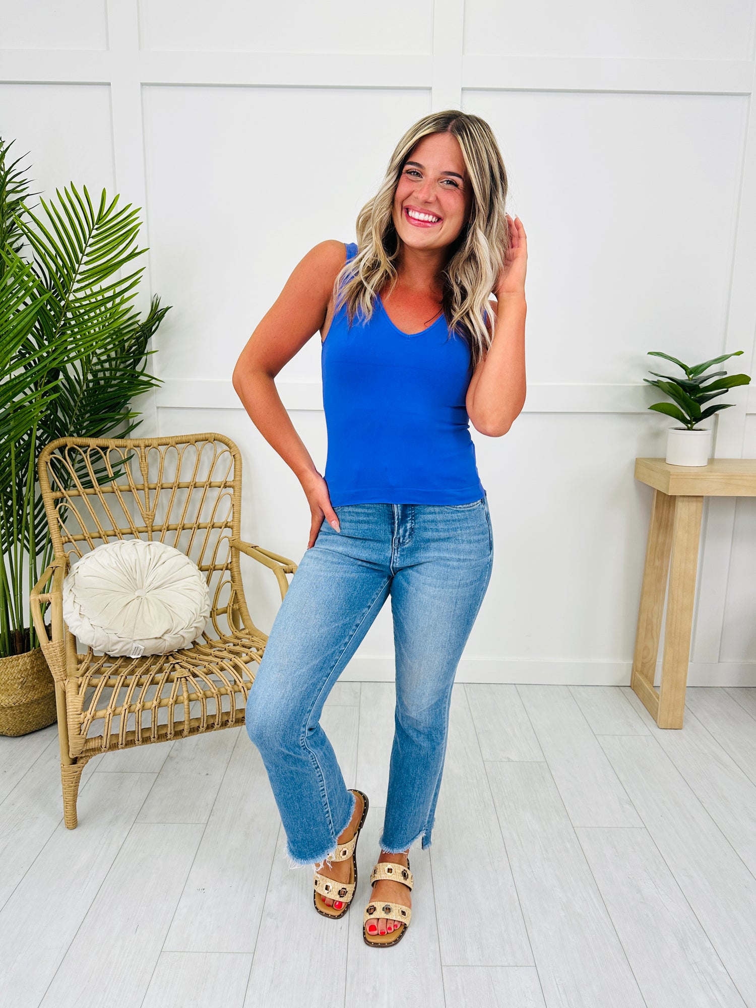 These are the best tanks ever so you need at least one of each color! This tank is a reversible with a V neck in the front and a scoop neck in the back. It is perfect to layer under a cardigan or shacket, or wear it under your tops to smooth you out!