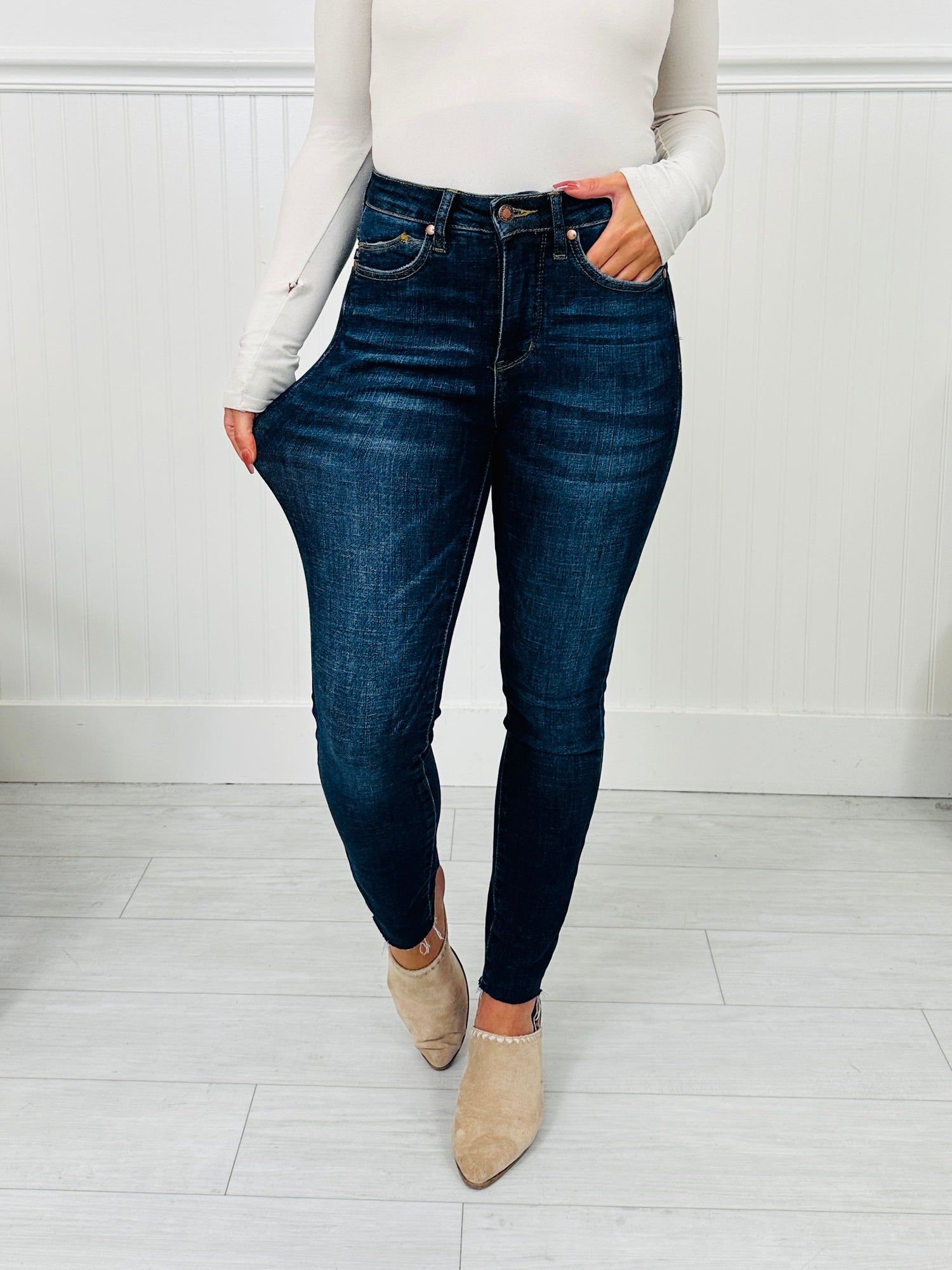 These jeans are called the Trifecta Jeans for these three reasons: (1) tummy control technology that is going to suck you in and slim you out for an amazing boost of confidence, (2) booty lifting pockets, and (3) and a raw hem, which means these work for all inseams (if you get these in and they are too long, simply snip them to achieve the perfect inseam for you).