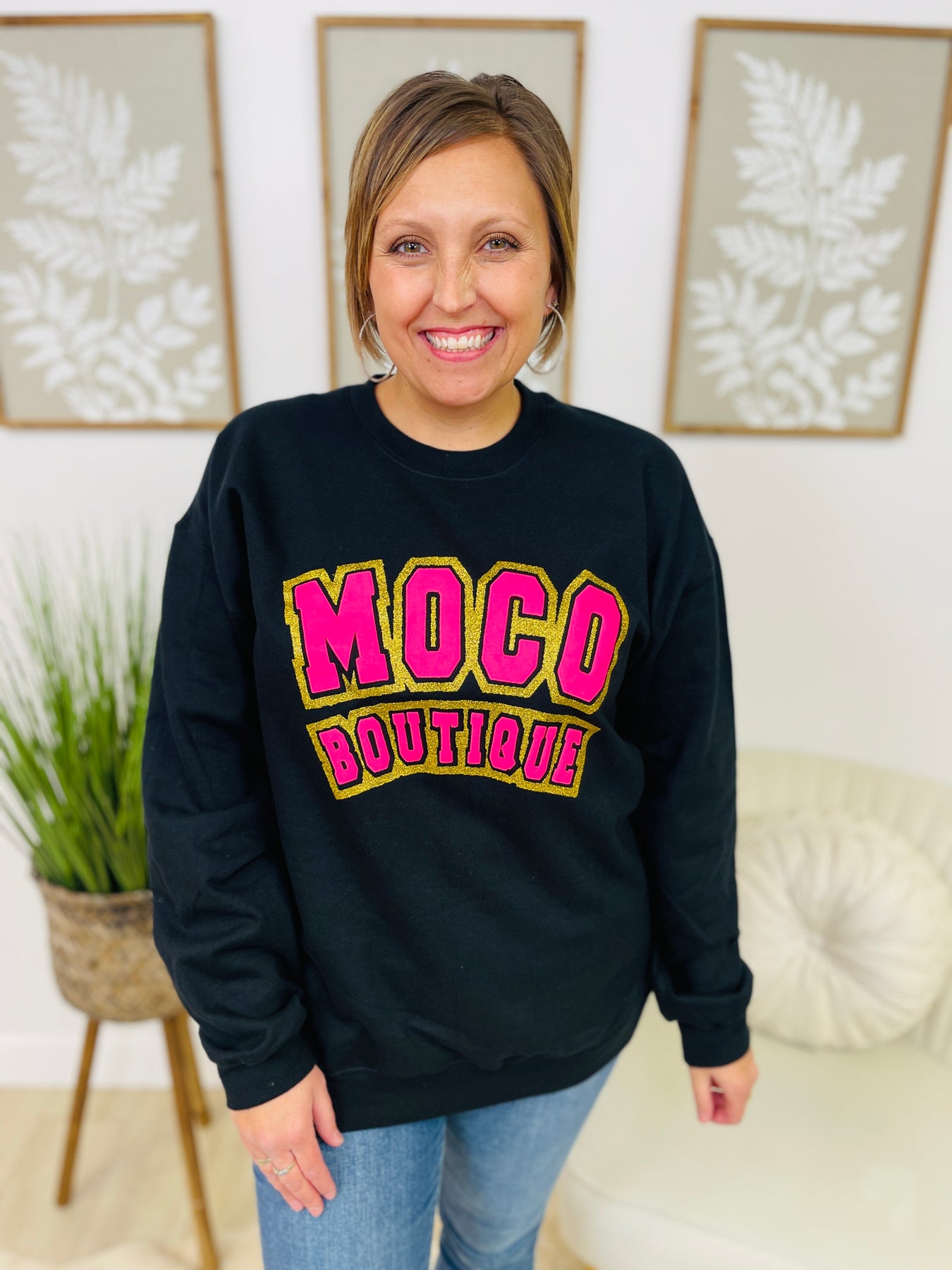 This ADORABLE MOCO Varsity sweatshirt is a MUST HAVE! The fabric on the sweatshirt is SO incredibly soft and stretchy which we love in our graphics! The varsity script is so cute and we are OBSESSED with the hot pink and gold sparkle! Pair this with your favorite pair of leggings and represent MOCO!