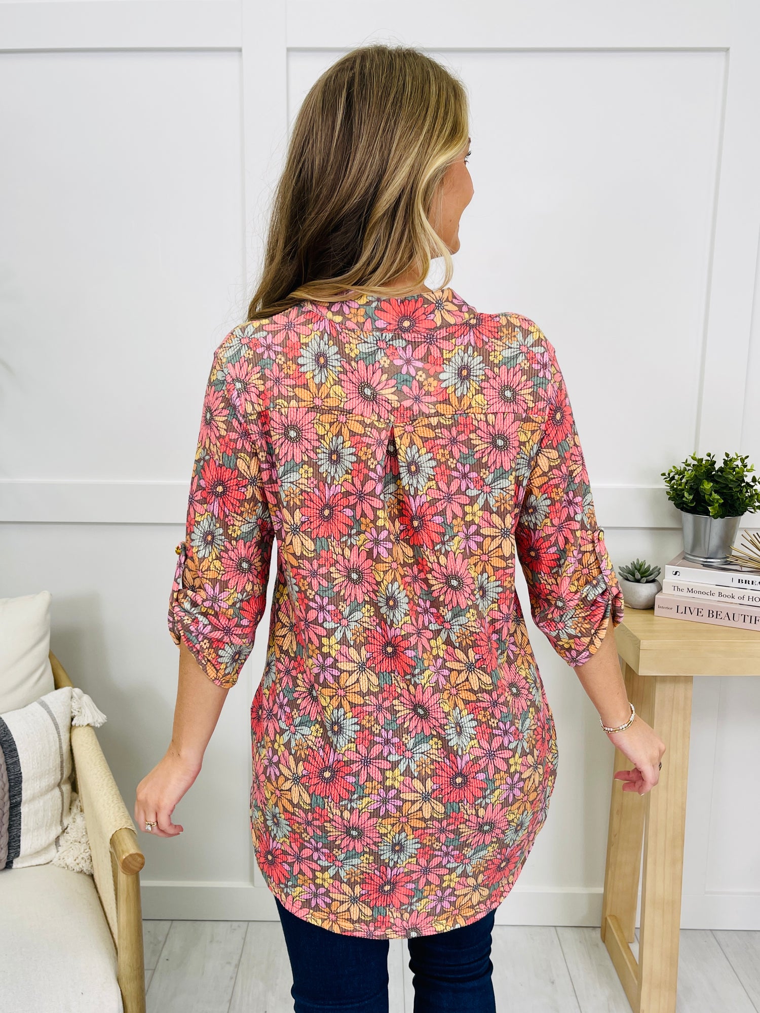 Elevate your wardrobe with this versatile collared top. Crafted with a chic and retro floral fabric, this top features classy ruched three-quarter sleeves and a notched v-neckline, making it the perfect piece for work to weekend style. Style it with work pants and heels for an easy professional outfit. It also looks great with skinny jeans and wedges!