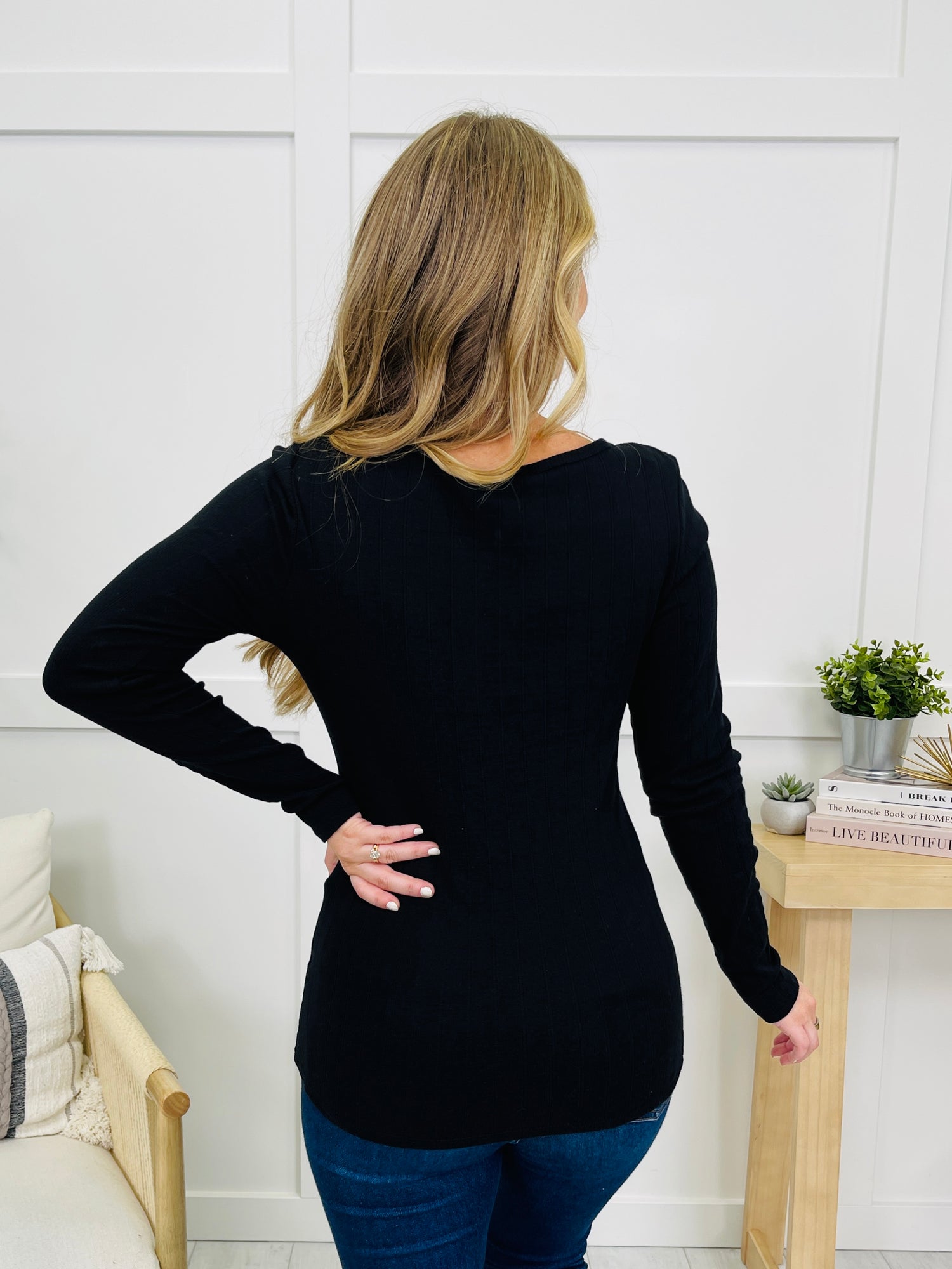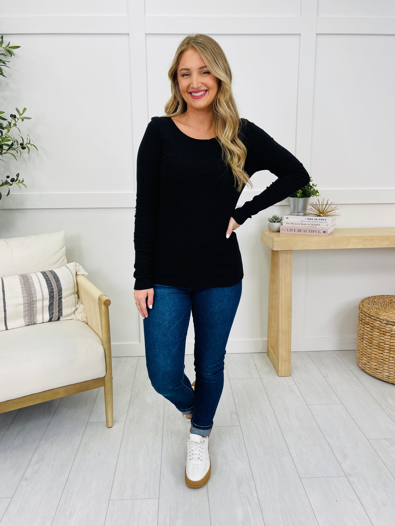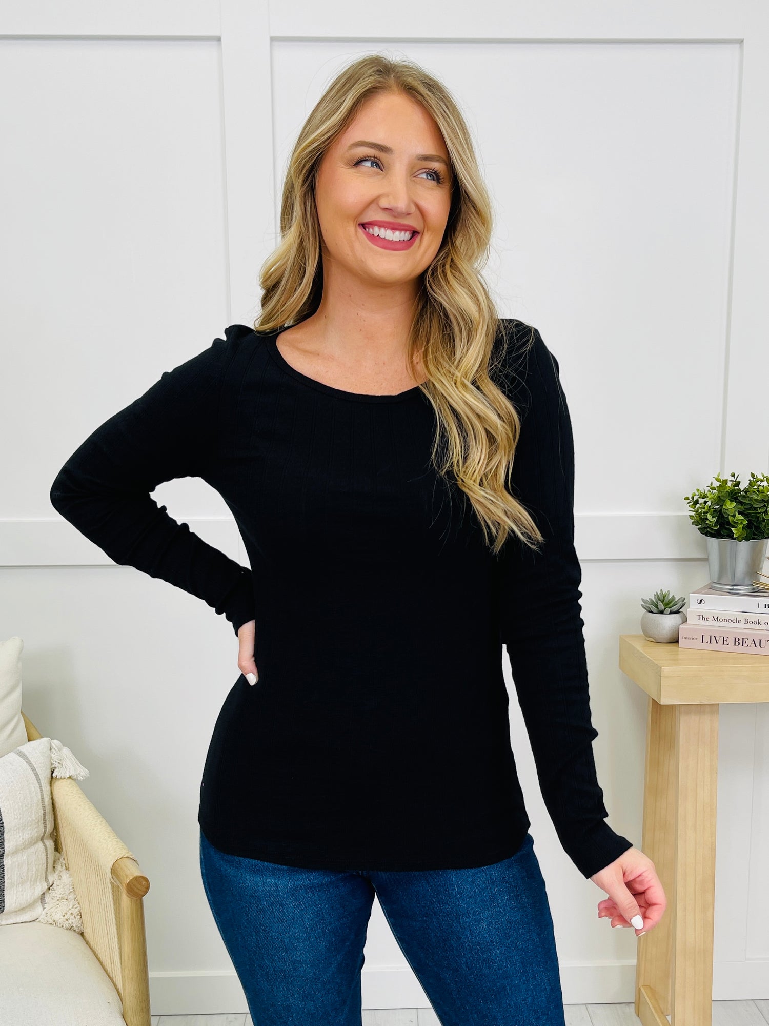 Simple, sleek, and endlessly versatile, this black long sleeve top is the perfect foundation for any outfit. The subtle textured lines add a touch of depth while maintaining a clean, polished look. Its classic round neckline and fitted shape make it ideal for layering under jackets or styling solo for an effortlessly put-together appearance.