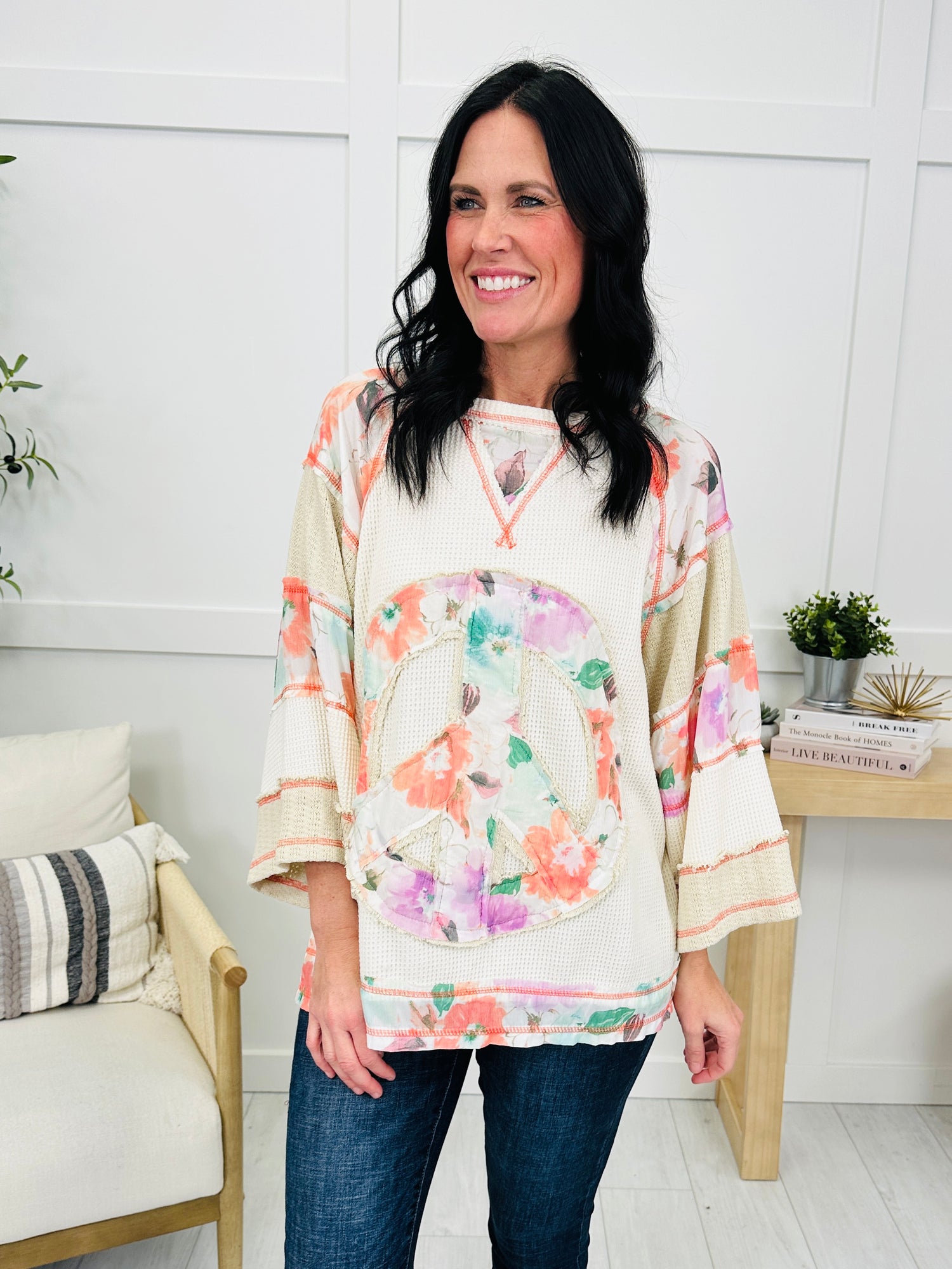 Bright, cheerful, and full of personality, this top brings together a floral peace sign design with vibrant coral stitching for a fun and carefree look. The patchwork-inspired detailing and soft neutral base make it easy to style while keeping things playful and unique. Perfect for adding a pop of color and charm to your casual wardrobe.