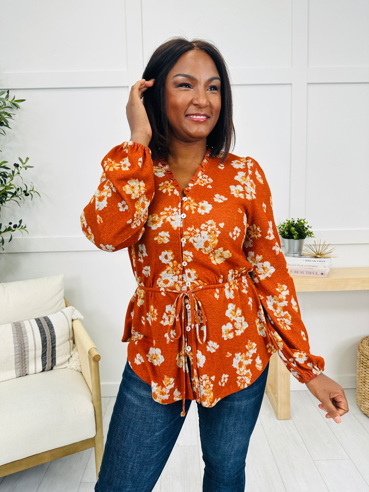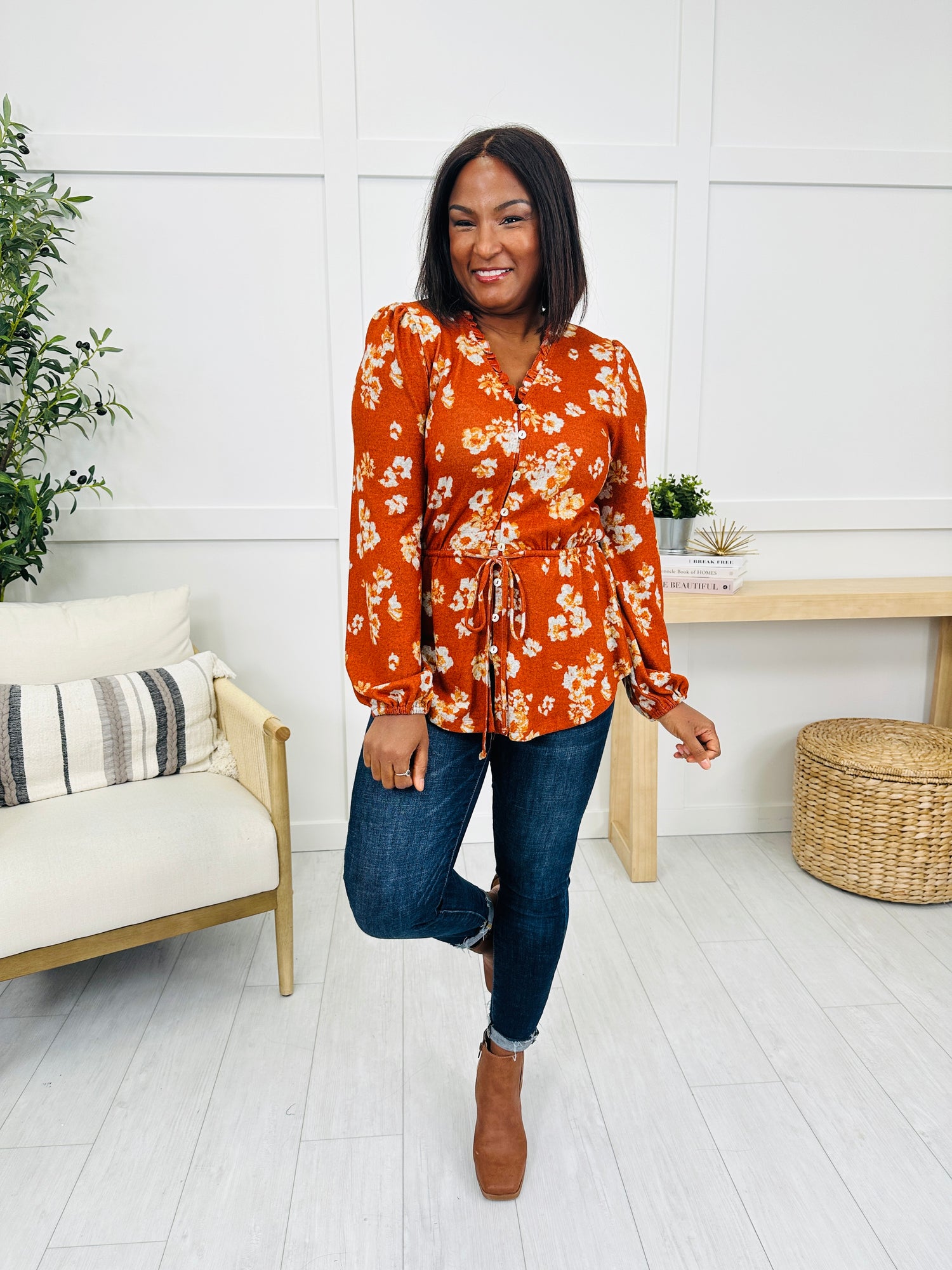 This top adds a touch of feminine charm with its floral printed design and button-down front. The adjustable tie waist gives it a flattering shape, while the subtle ruffled trim along the neckline adds a soft, pretty detail. Perfect for pairing with denim or trousers, this piece easily transitions from day to night with effortless style.