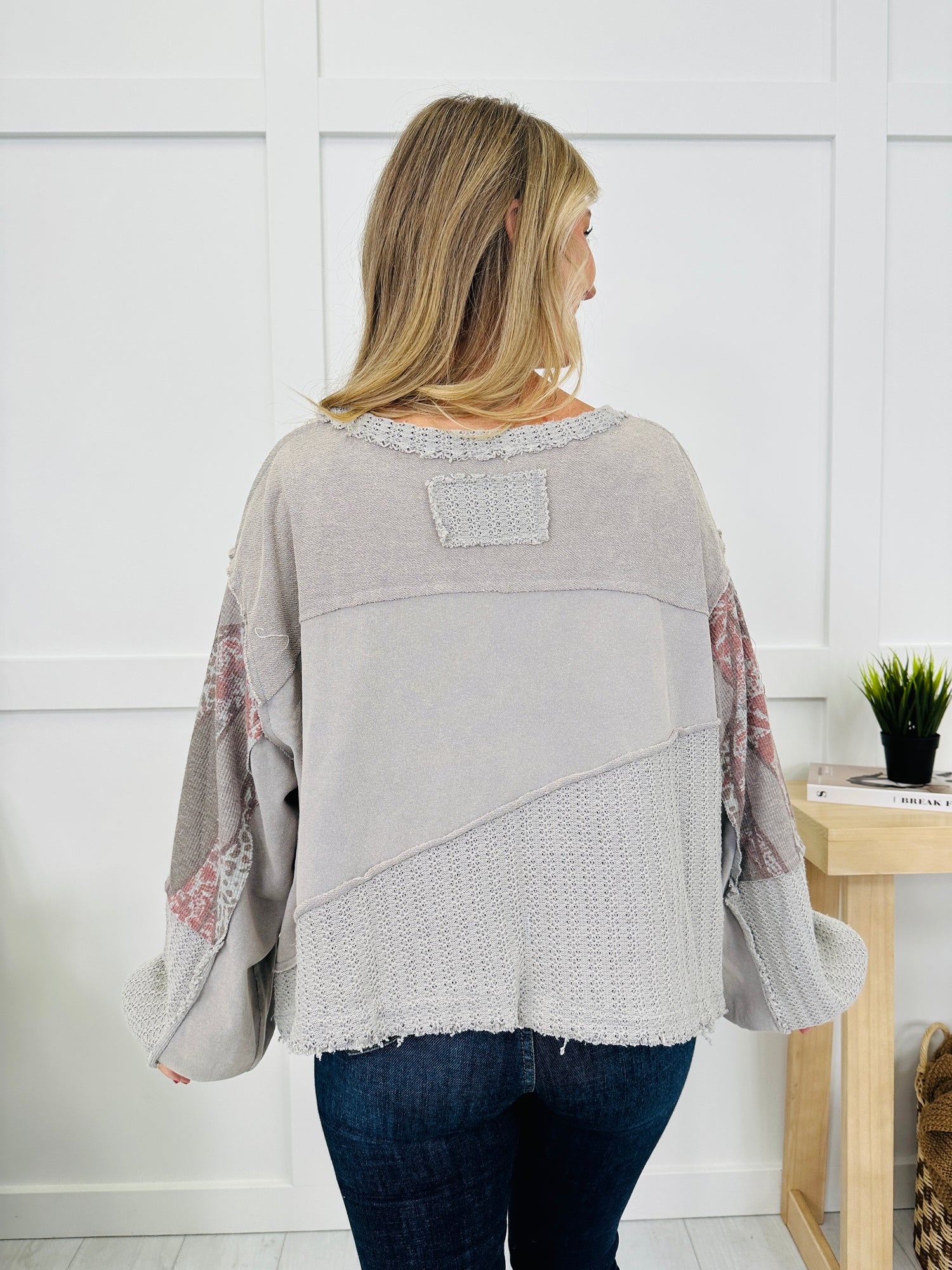 This top brings a fun boho-inspired vibe with its patchwork peace sign design and textured mixed fabrics. The billowy long sleeves add a relaxed, free-spirited feel that pairs perfectly with the laid-back style. Unique and eye-catching, this piece is one you’ll love reaching for when you want to make a statement while staying comfy.
