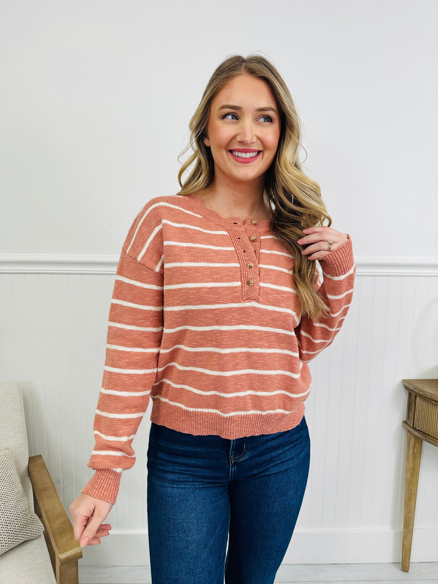 This striped knit top blends a casual, relaxed fit with a charming button-trim neckline that adds just the right touch of detail. The horizontal stripe pattern keeps the look playful and easy to style, while the soft knit and ribbed edges give it a cozy, polished finish. Pair it with denim for an effortless everyday outfit that feels comfortable and put-together.