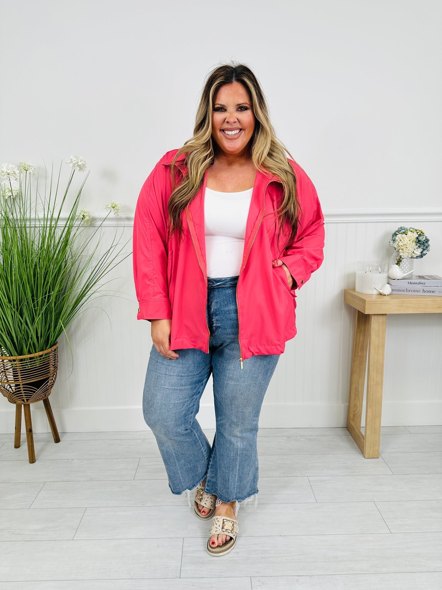 Designed in an easy, relaxed fit, this jacket layers effortlessly over tees, tanks, and sweaters. The adjustable drawstring hood adds a practical touch for breezy mornings, while the gold hardware gives it that polished, elevated finish.