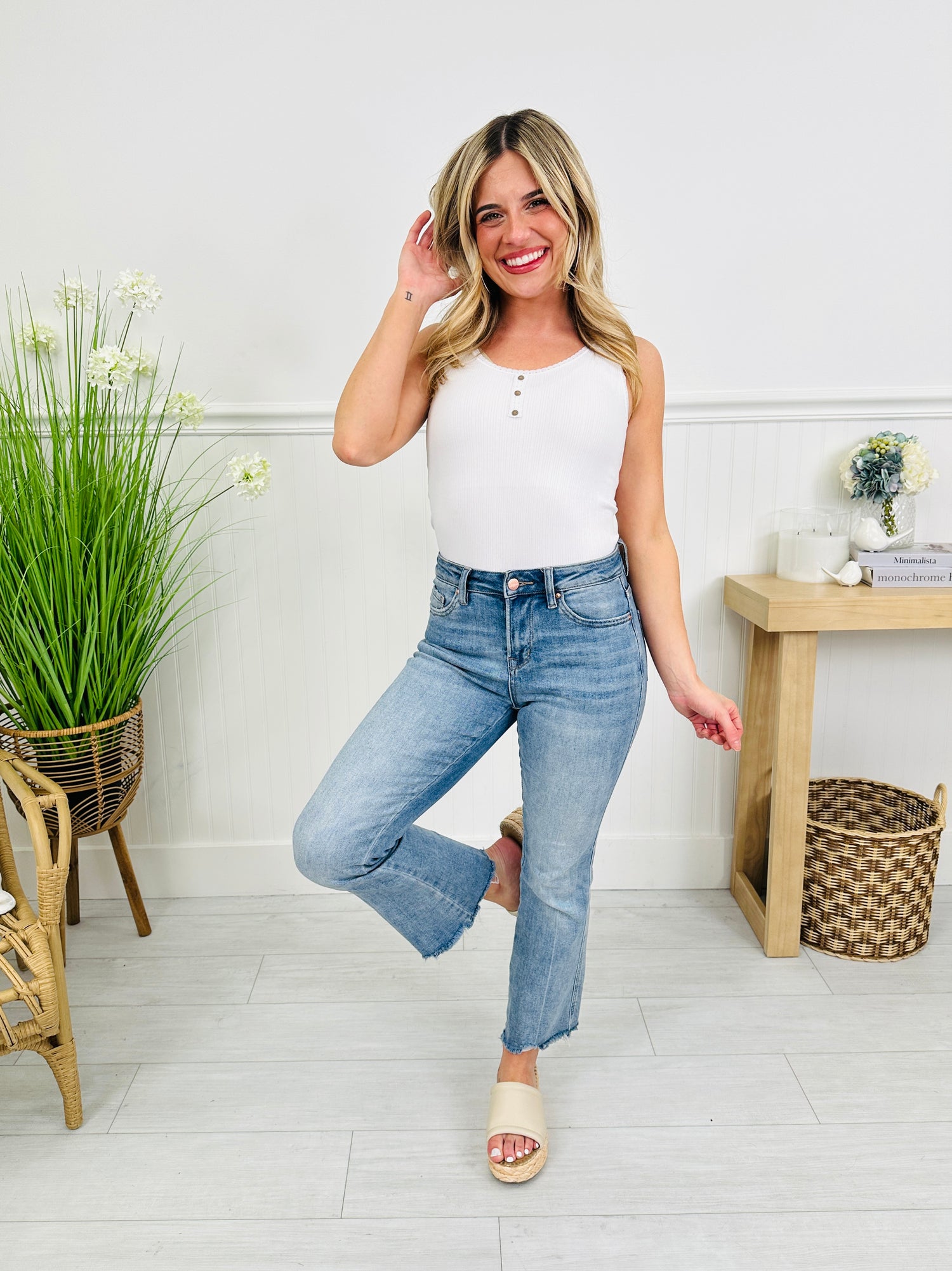 The wash is spring perfection and the trendy raw hem gives these non distressed jeans a pop of detail that your spring wardrobe needs. Dress these up with wedges and a spring sweater or tank or down with your favorite graphic tee and sneakers or flip flops. These non distressed jeans are versatile and you'll reach for them again and again this season. These jeans never last long when they restock, so grab them while you still can!