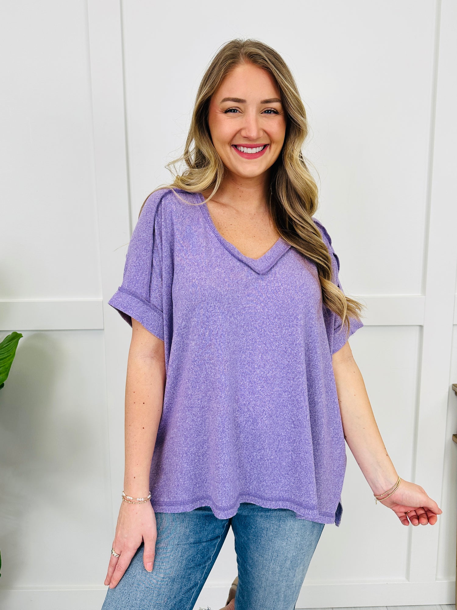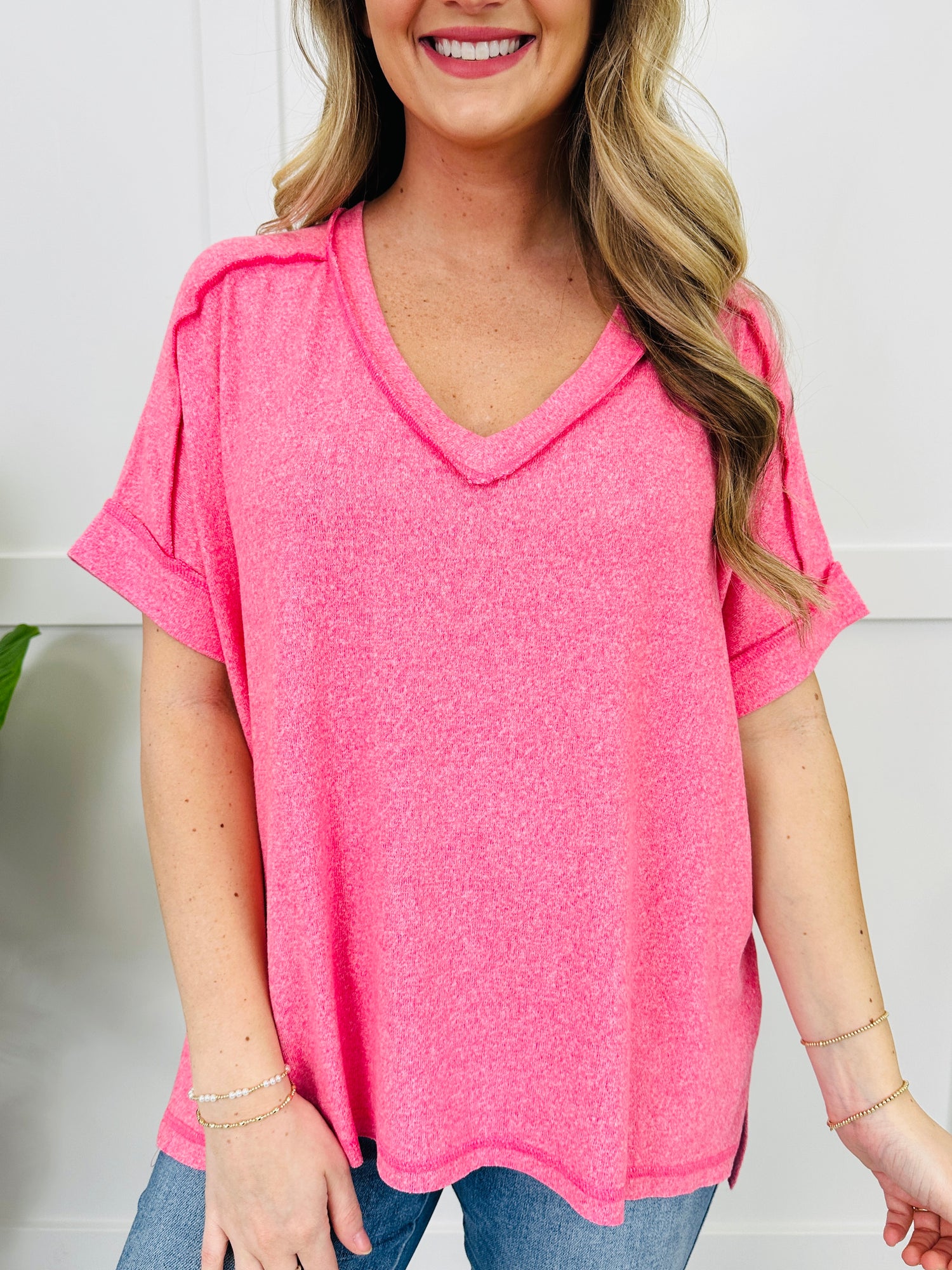 This top is one of those throw-on-and-feel-good staples you’ll want in every color. The V-neckline detail keeps it flattering and easy to style, while the cuffed sleeve hems add that polished, intentional finish. Exposed seam accents give it a modern touch without being too much, and the relaxed fit makes it perfect for busy days, casual plans, and everything in between. Pair it with denim, shorts, or leggings for an effortlessly cute look you’ll keep coming back to.