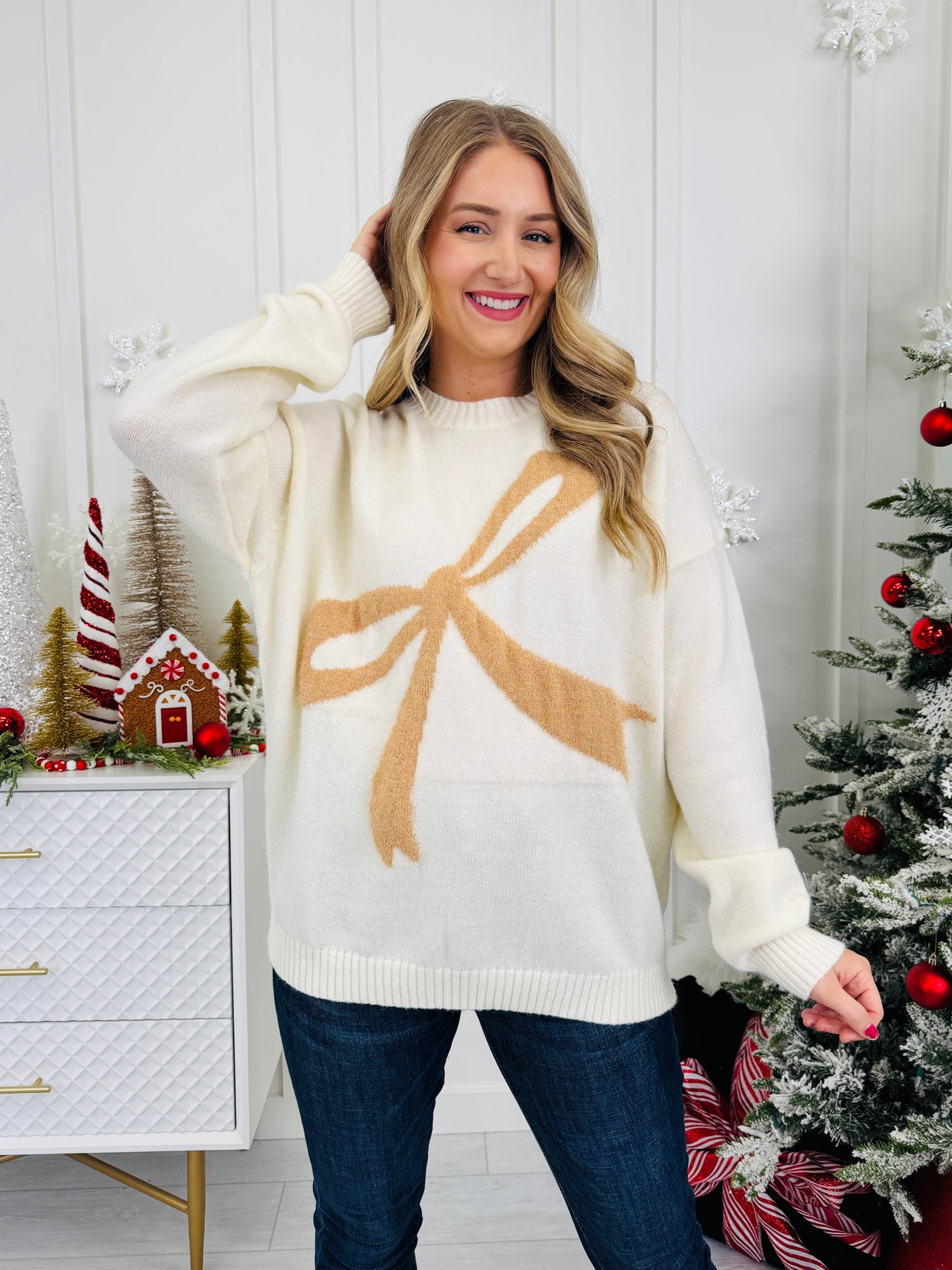 Add a touch of festive charm to your winter wardrobe with this adorable sweater featuring a playful oversized bow design across the front. Its cozy, relaxed fit makes it an easy choice for all-day wear while still looking effortlessly stylish. Perfect for holiday gatherings or casual days out, this chic seasonal piece is sure to become a go-to favorite this winter.