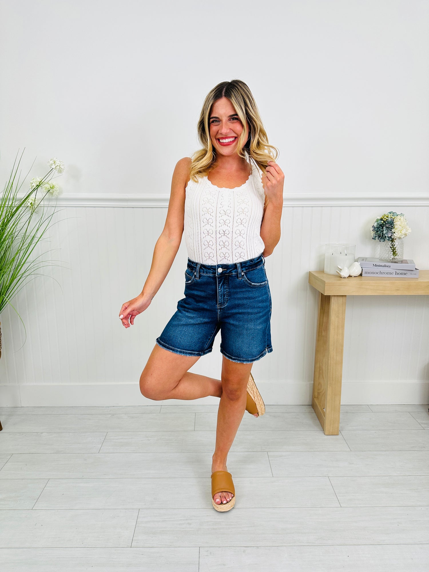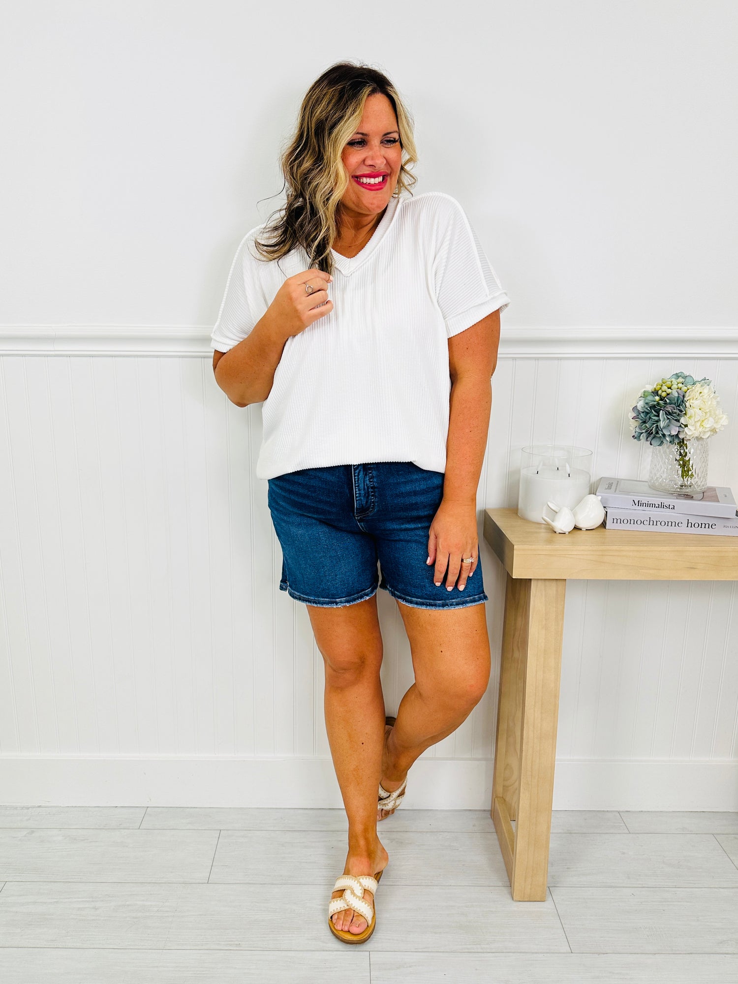 These shorts are "right in the middle"-- the perfect not-too-short, not-too-long fit you’ve been waiting for. These new shorts are designed in a flattering mid length that hits right where you want it, giving you confident coverage without sacrificing style. The high rise fit pairs perfectly with tanks, tees, and lightweight sweaters, creating that effortless, everyday silhouette.