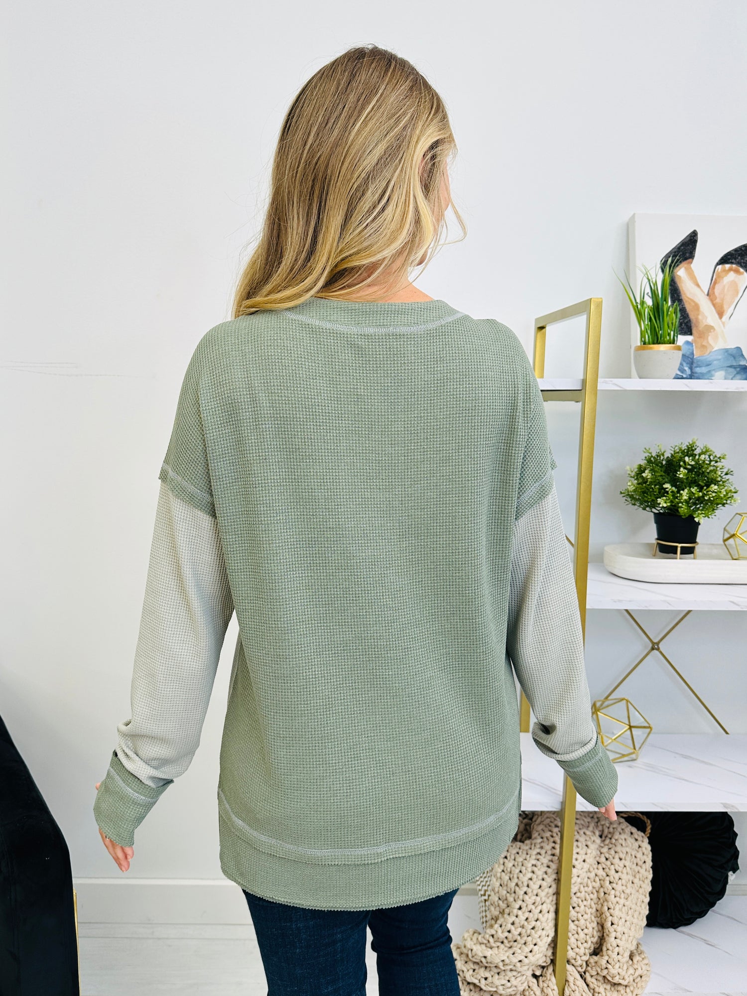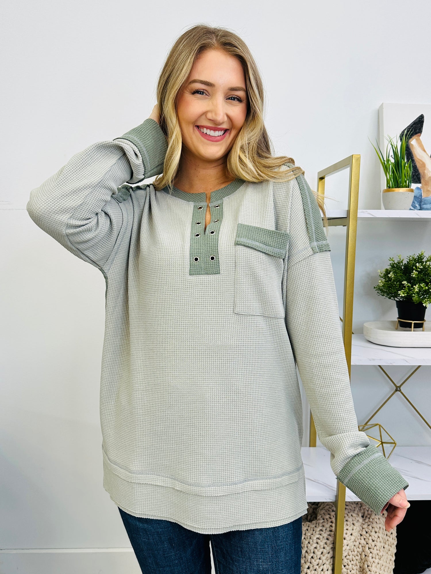 This top features a textured knit design with contrasting trim along the neckline, sleeve cuffs, back panel, and pocket for a standout, elevated look. The grommet-detailed button neckline adds a modern twist, while the chest pocket and color-blocked accents bring visual dimension to the relaxed silhouette. A great everyday style piece that pairs effortlessly with denim and layers well across seasons.