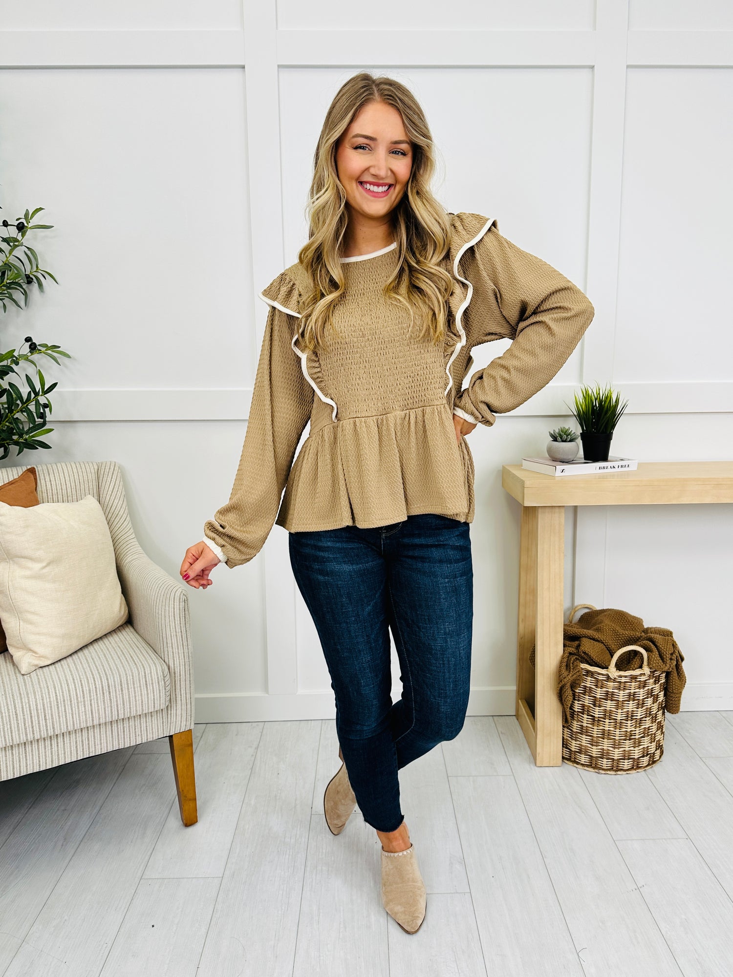 This top is all about feminine charm with its beautifully textured smocked bodice and flouncy ruffled shoulder accents. The contrasting black trim adds a bold, eye-catching touch that elevates the look. Finished with billowy long sleeves and a flowy hem, it’s a standout piece that pairs perfectly with denim for an effortlessly chic outfit.